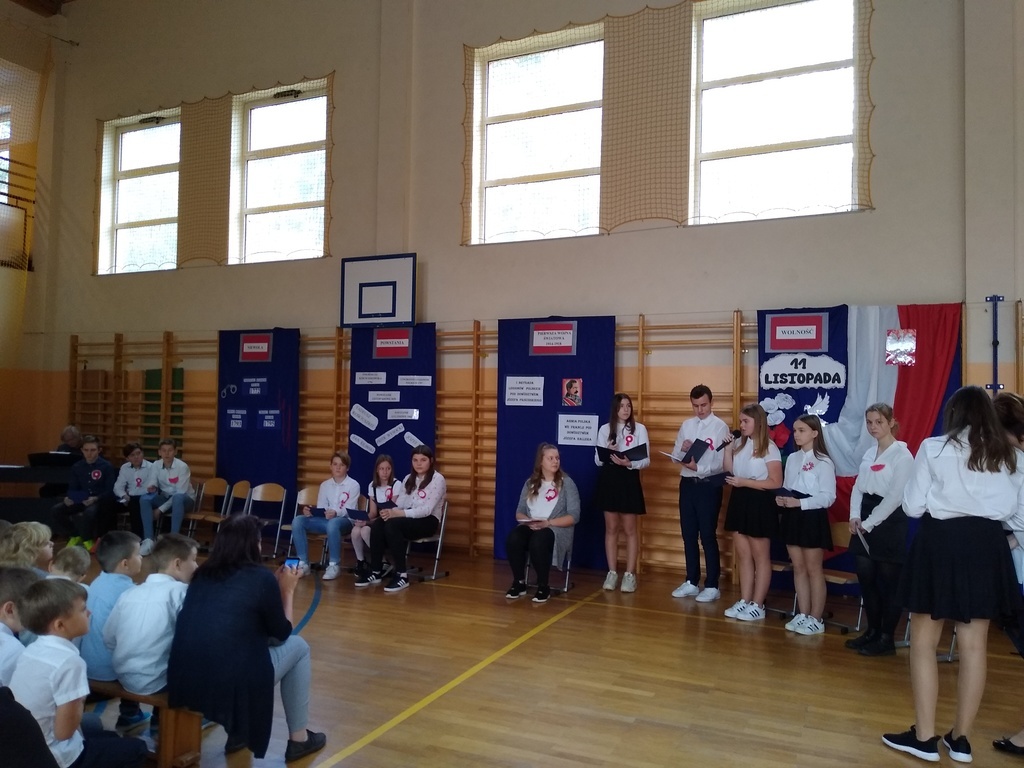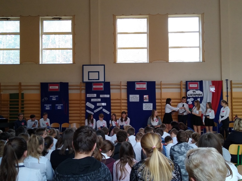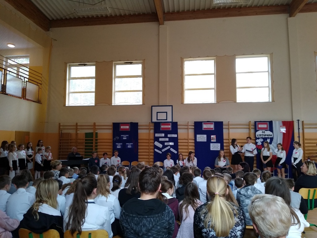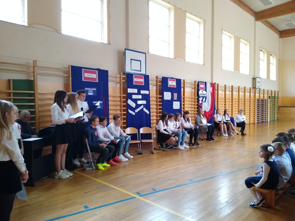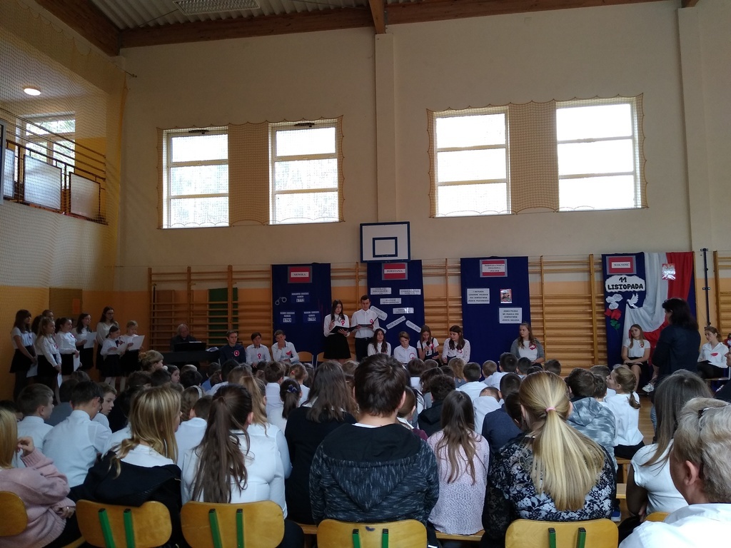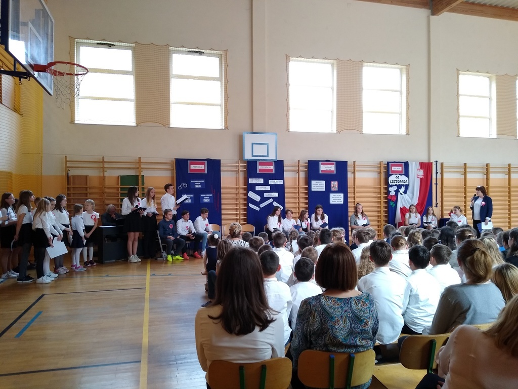 7 listopada odbyła się uroczysta akademia, którą uczciliśmy 101 rocznicę odzyskania przez Polskę niepodległości. W podróż do przeszłości zabrali nas uczniowie klas VI, VII i VIII. Przedstawili oni historie rozbiorów Polski i drogę do wolności prowadząc poporzez kolejne stacje: Niewoli, Powstań, I Wojny Światowej, Wolności. Akademia była żywą lekcją historii na temat jednego z najważniejszych wydarzeń dla naszego narodu: odzyskania niepodległości. Dodatkowo wraz ze starszymi kolegami wiersz Władysława Bełzy pt." Katechizm polskiego dziecka" recytowali najmłodsi uczniowie. Scenografia oraz montaż słowno-muzyczny wprowadził wszystkich w stan zadumy, kiedy to szczególnego znaczenia nabierają słowa: ojczyzna, miłość, patriotyzm. Na koniec reprezentanci klasy VIII zapalili symboliczny znicz.