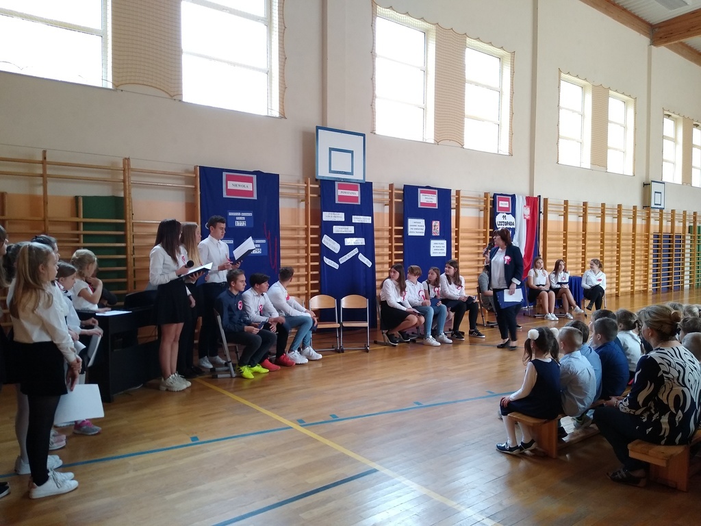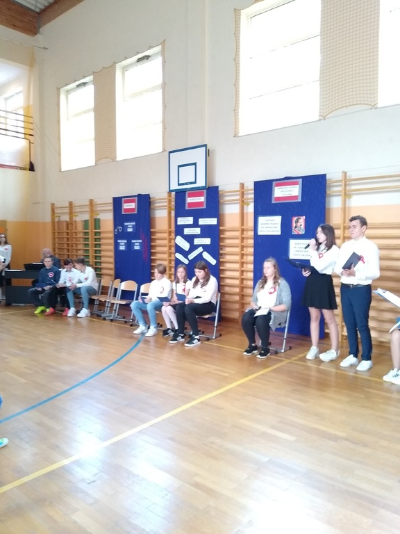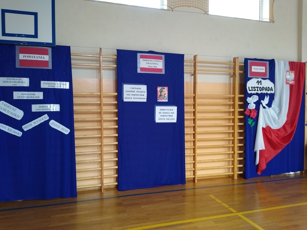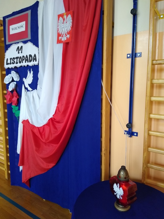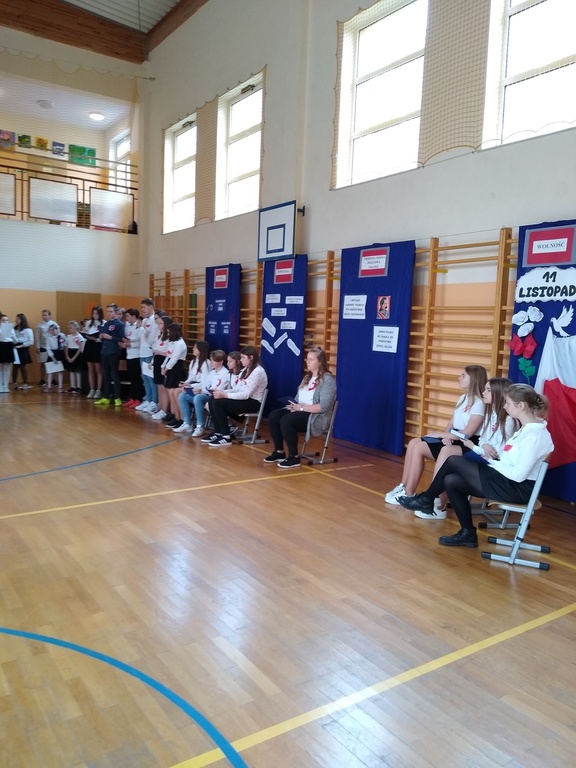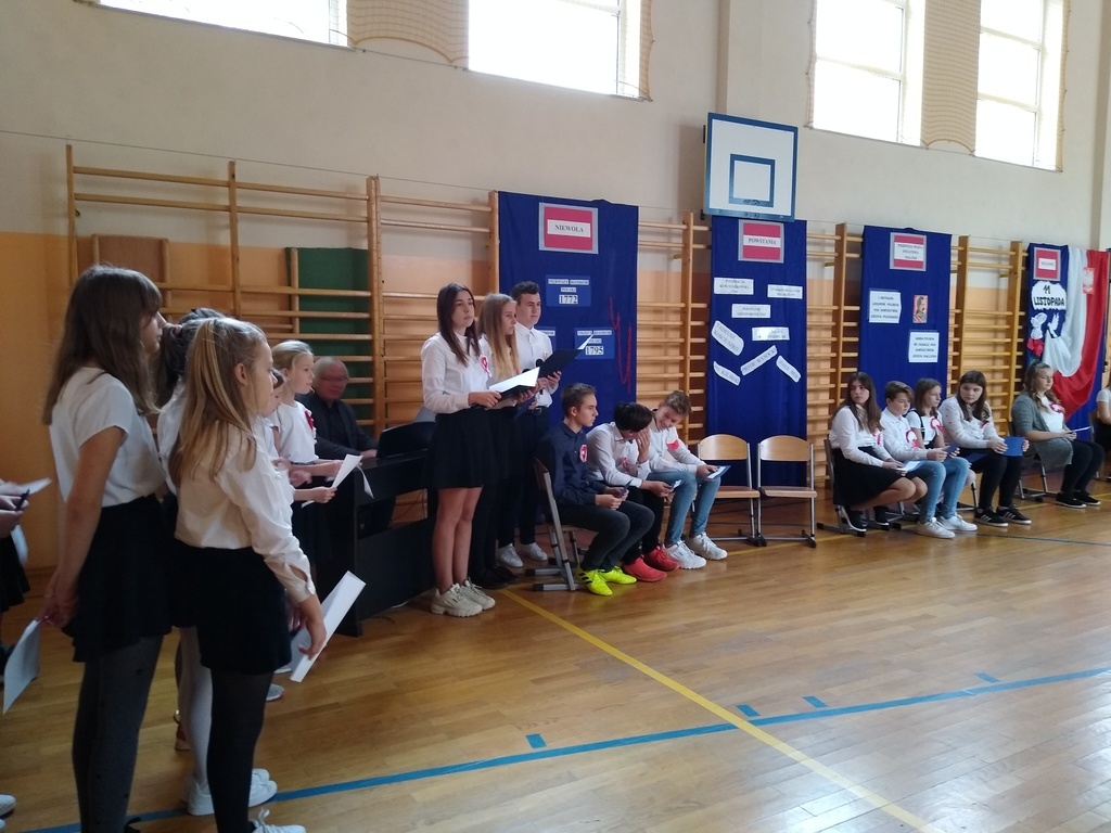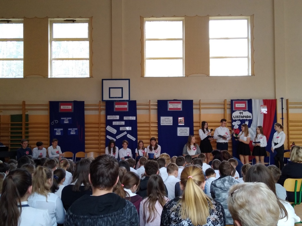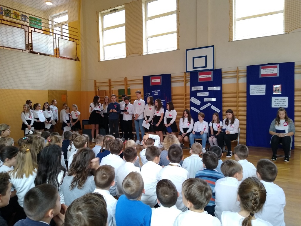 7 listopada odbyła się uroczysta akademia, którą uczciliśmy 101 rocznicę odzyskania przez Polskę niepodległości. W podróż do przeszłości zabrali nas uczniowie klas VI, VII i VIII. Przedstawili oni historie rozbiorów Polski i drogę do wolności prowadząc poporzez kolejne stacje: Niewoli, Powstań, I Wojny Światowej, Wolności. Akademia była żywą lekcją historii na temat jednego z najważniejszych wydarzeń dla naszego narodu: odzyskania niepodległości. Dodatkowo wraz ze starszymi kolegami wiersz Władysława Bełzy pt." Katechizm polskiego dziecka" recytowali najmłodsi uczniowie. Scenografia oraz montaż słowno-muzyczny wprowadził wszystkich w stan zadumy, kiedy to szczególnego znaczenia nabierają słowa: ojczyzna, miłość, patriotyzm. Na koniec reprezentanci klasy VIII zapalili symboliczny znicz.