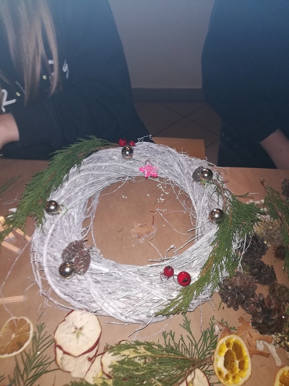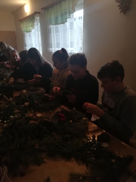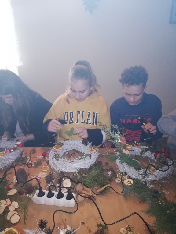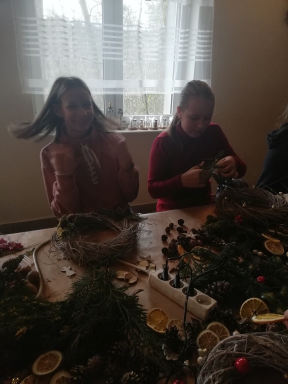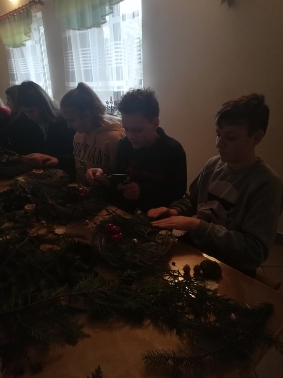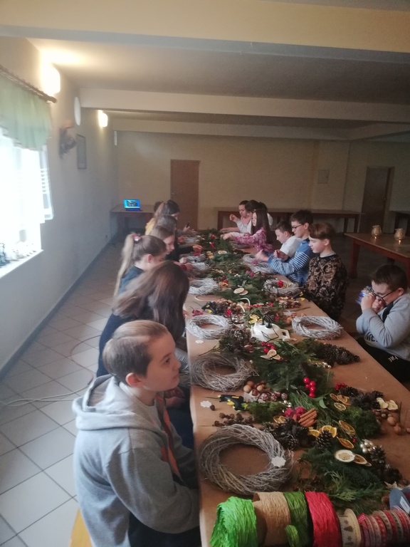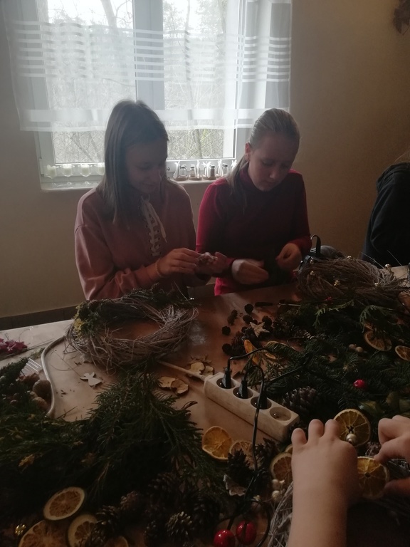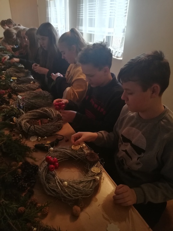 W dniu 17.12.2019 roku uczniowie z klasy VI i kolegą z klasy V uczestniczyli w wycieczce do Pomiechówka i Szczypiorna nad Wkrą. Dzieci odwiedziły kino w Pomiechówku gdzie obejrzały jedną z najnowszych polskich komedii. Następnie udali się do Modrzewiowego Zakątka w Szczypiornie nad Wkrą. Na miejscu uczniowie brali udział w warsztatach ozdób świątecznych wykonywanych własnoręcznie na podkładzie z gałązek. Uczestnicy wycieczki wykazywali się zmysłem artystycznym i pomysłowością wykonując stroik świąteczny, który zabrali do swoich domów. Strojenie naszych domów w okresie Świąt Bożego Narodzenia, było kiedyś tradycją, którą nasi uczniowie starają się podtrzymywać i pielęgnować. Dzięki warsztatom zapachniało już Świętami Bożego Narodzenia, a nasi uczniowie zintegrowali się ze sobą.