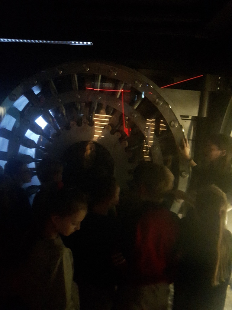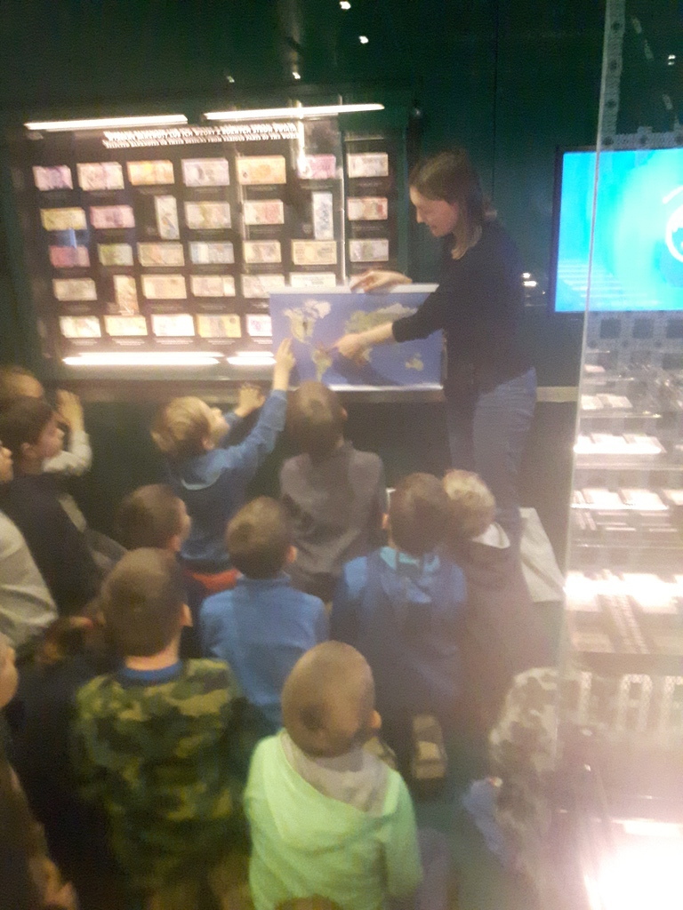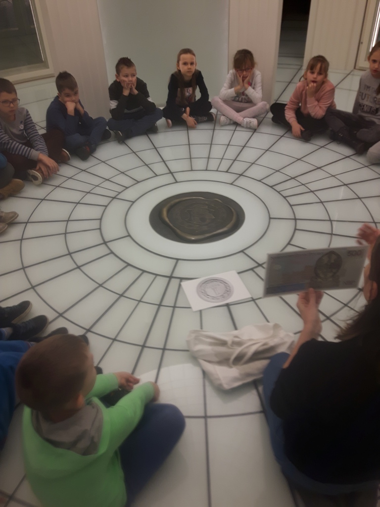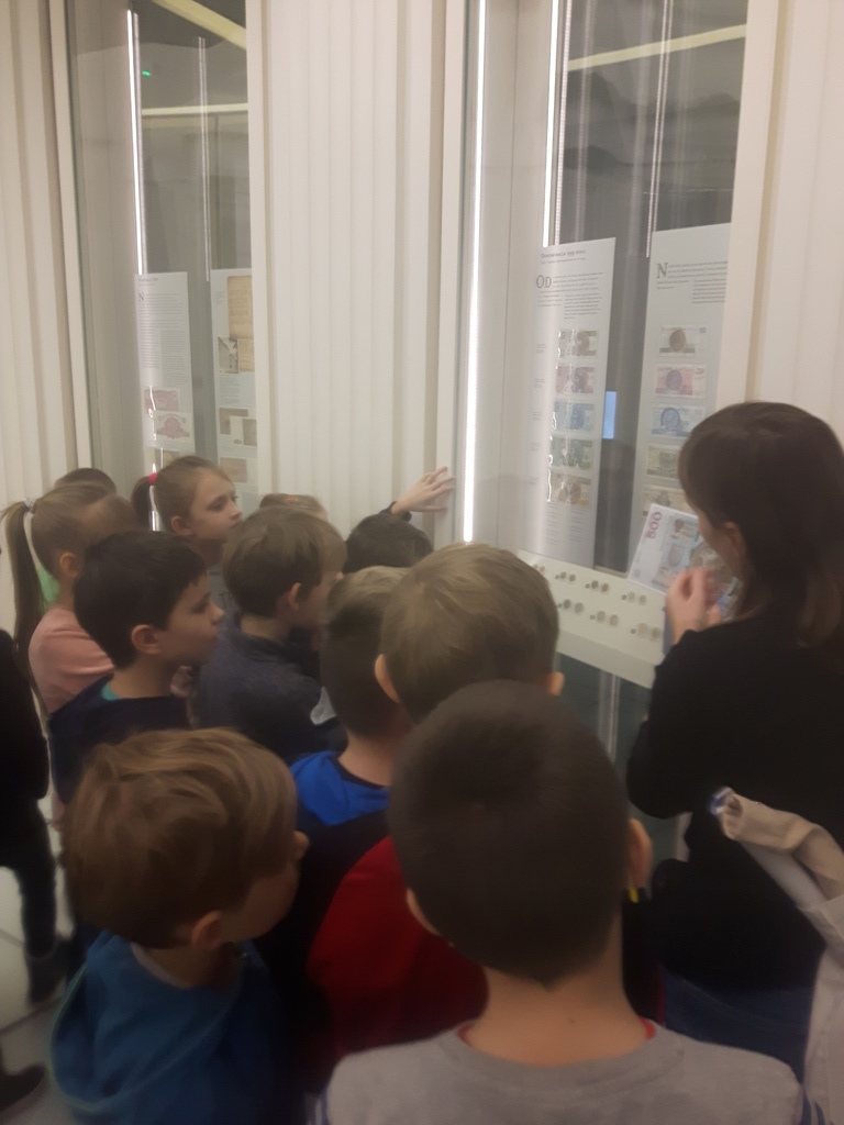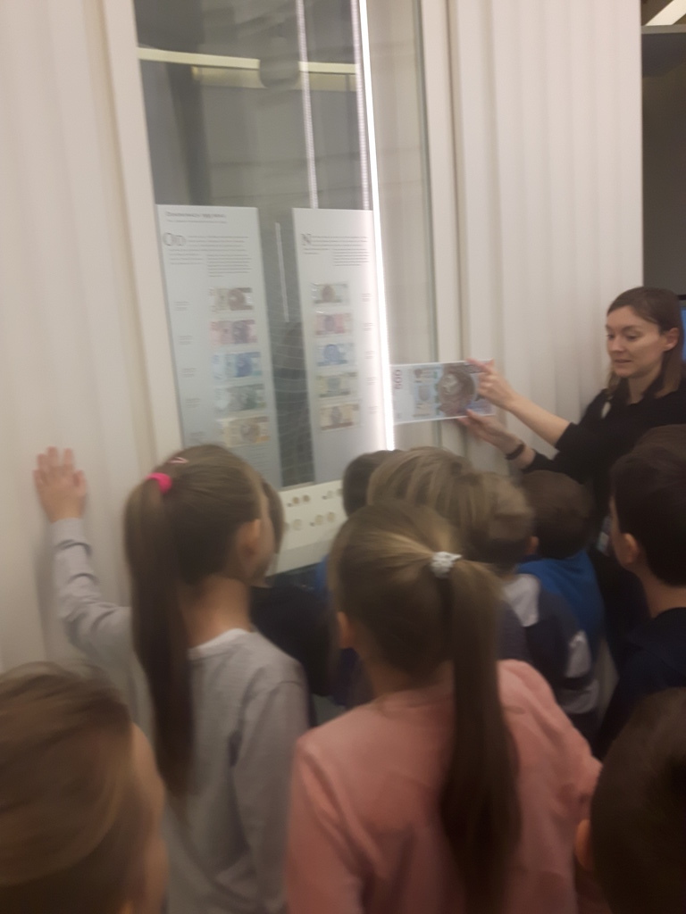 6 grudnia klasy 0-3 wraz z wychowawcami wybrały się na wycieczkę do Centrum Pieniądza. By wejść na teren muzeum, musieliśmy przejść przez bramki, a nasze plecaki zostały prześwietlone. Pani Kasia- przewodniczka opowiedziała nam czym dawniej płacono. Dowiedzieliśmy się również jakie są rodzaje banków i co możemy w nich załatwić . W następnym pomieszczeniu było dużo banknotów z różnych epok. Usłyszeliśmy również, że kiedyś chleb kosztował tysiąc złotych. Potem pani Kasia zaprowadziła nas do kopii drzwi pancernych i zobaczyliśmy, jak one działają. Największym zdziwieniem okazał się widok zniszczonych pieniędzy. Pani Kasia opowiedziała nam co trzeba zrobić ,gdy zniszczy się banknot. Wycieczka bardzo nam się podobała, wyszliśmy z tego miejsca bogatsi o ogromną wiedzę (niestety „tylko” o wiedzę, bo sztaby złota nie udało nam się wyciągnąć z gablotki).