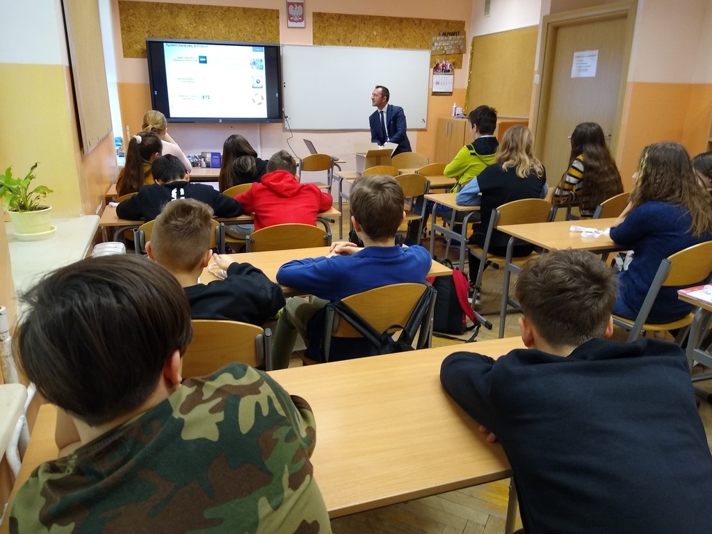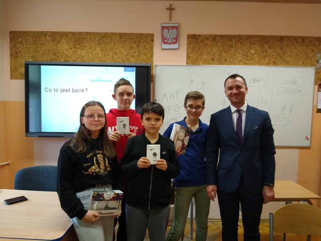W ostatnią środę (22.01) uczniowie klas 7 i 8 mieli okazję dowiedzieć się co nie co na temat przedsiębiorczości. Wszystko to za sprawą lekcji poprowadzonej przez Pana Grzegorza Żeberka (przedstawiciela Banku PKO SA), który jako gość specjalny zaangażował się we wsparcie młodzieży. Tematyka obejmowała wytłumaczenie pojęć : "bank", "pieniądz" oraz przybliżenie ich historii czy pełnionej przez nie funkcji. Dodatkowo młodzież wzięła udział w quizie z nagrodami. Dziękujemy Panu Grzegorzowi za przeprowadzenie ciekawej lekcji oraz zaangażowanie.