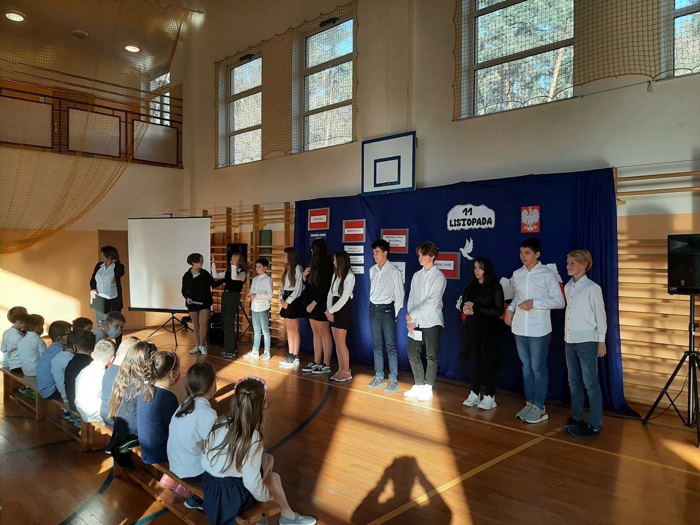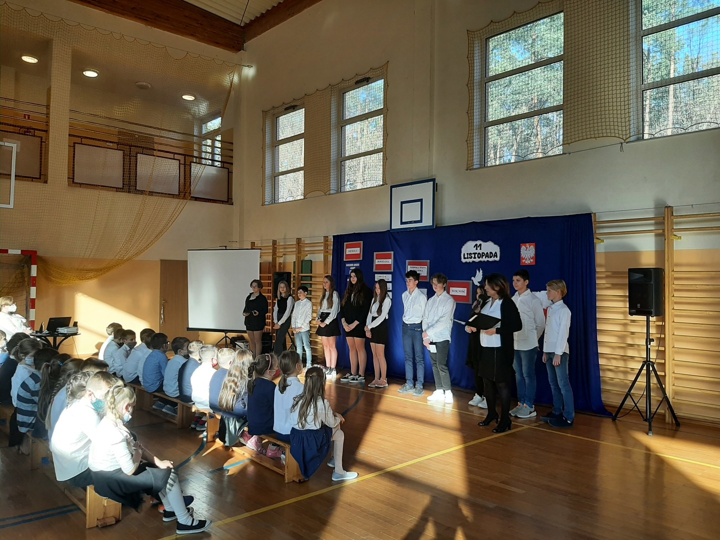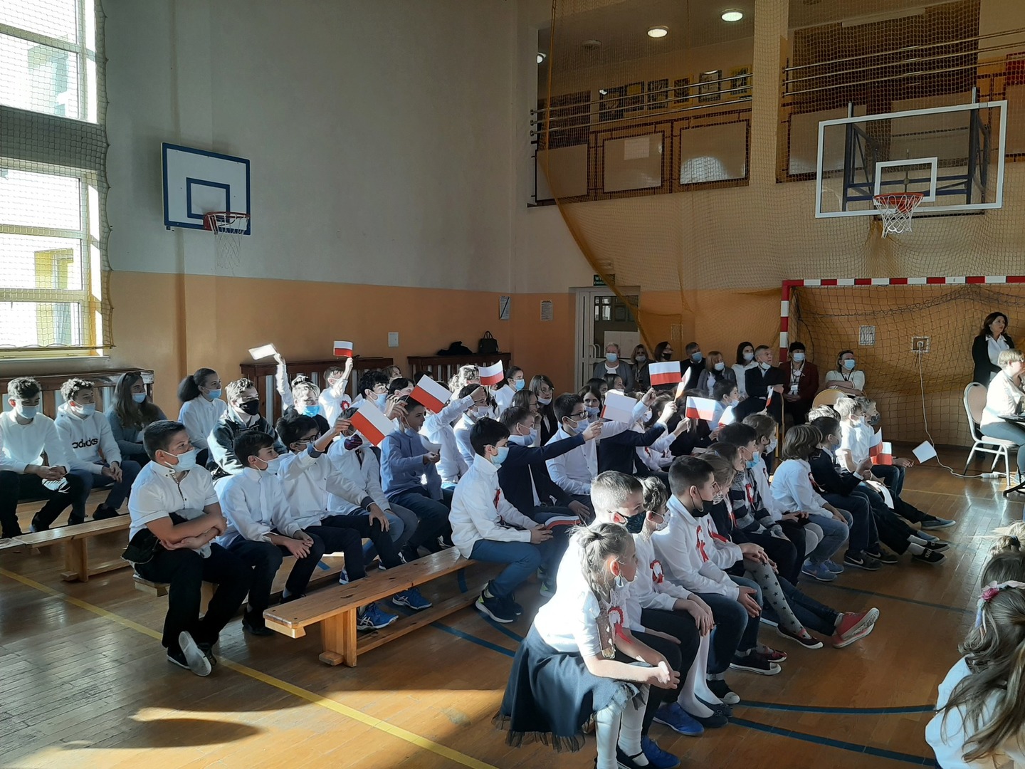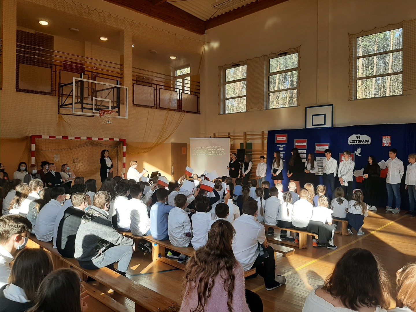 10. listopada podczas godziny wychowawczej uczniowie i nauczyciele spotkali się w szkolnej sali gimnastycznej, aby wziąć udział w specjalnie przygotowanym apelu. Spotkanie zorganizowały nauczycielki historii i religii: p. Ewa Dudek i p. Anna Michalak. Podczas naszego rocznicowego spotkanie uczniowie przypomnieli historię wydarzeń naszego kraju. Zebrani uczestnicy chętnie wzięli udział w śpiewaniu pieśni patriotycznych. W rytm pieśni uczniowie klasy IV machali biało-czerwonymi flagami.