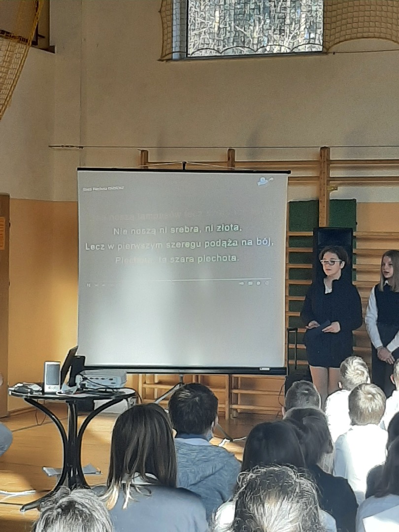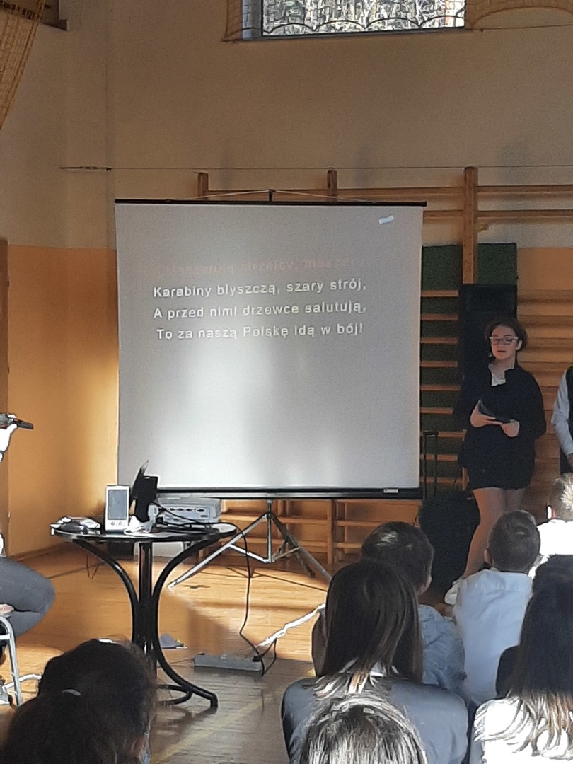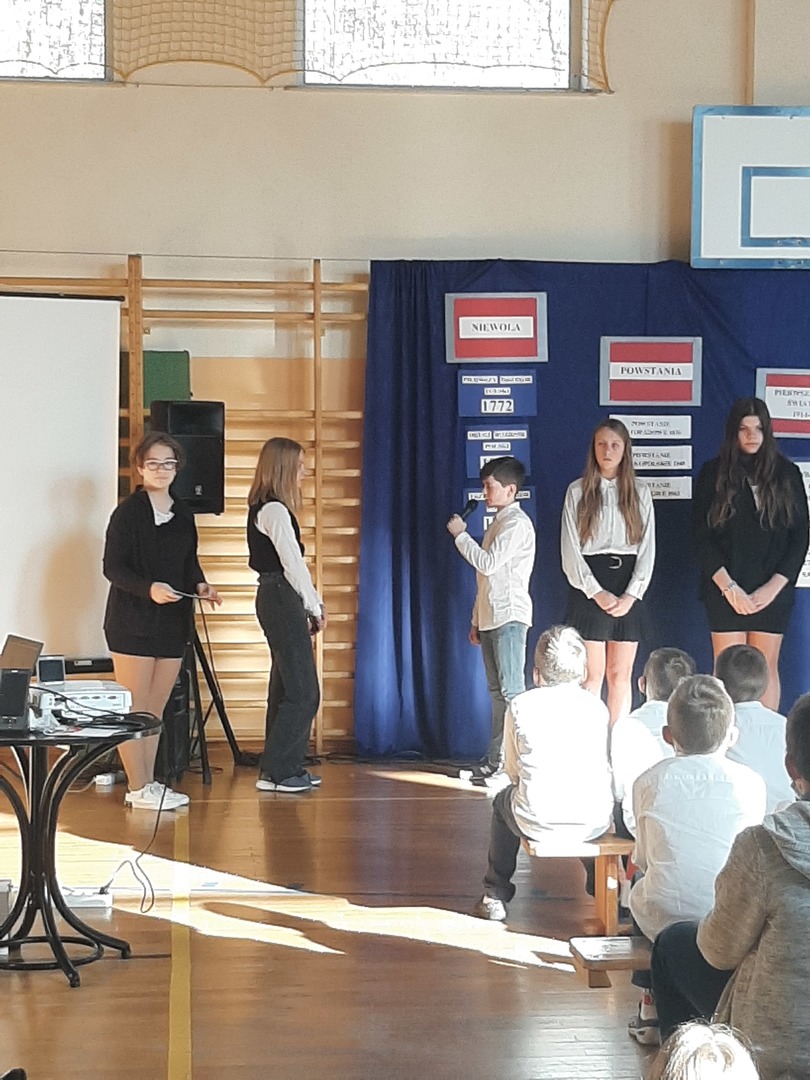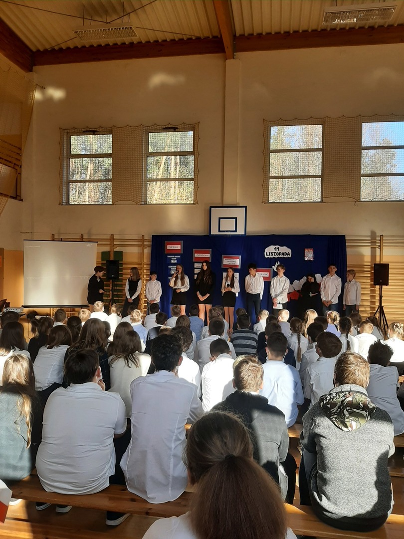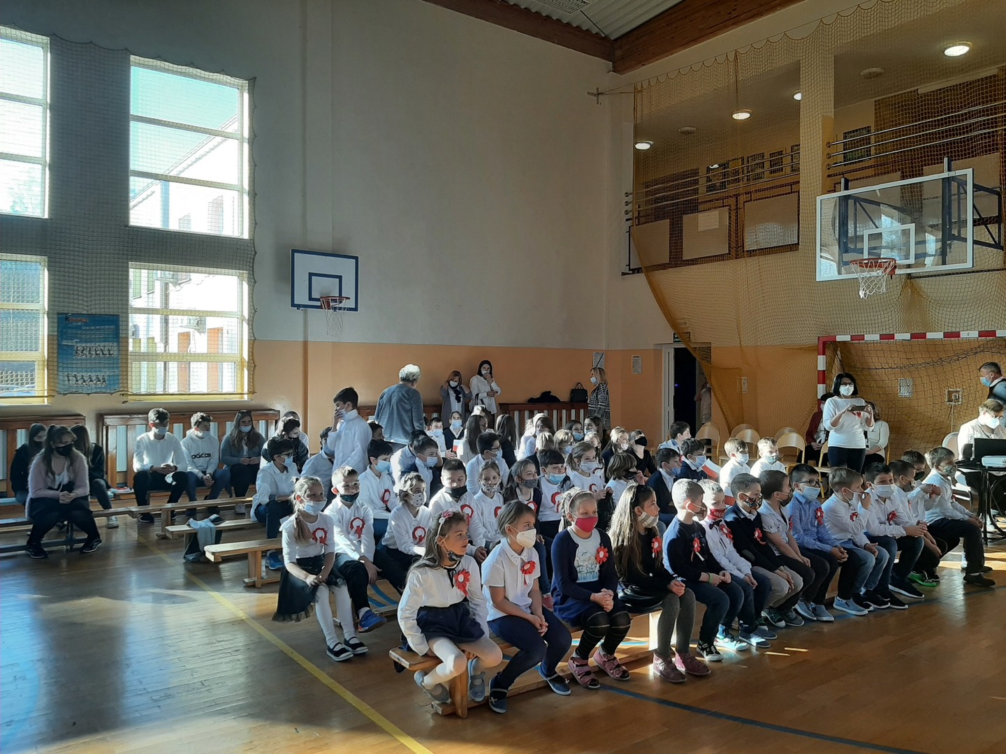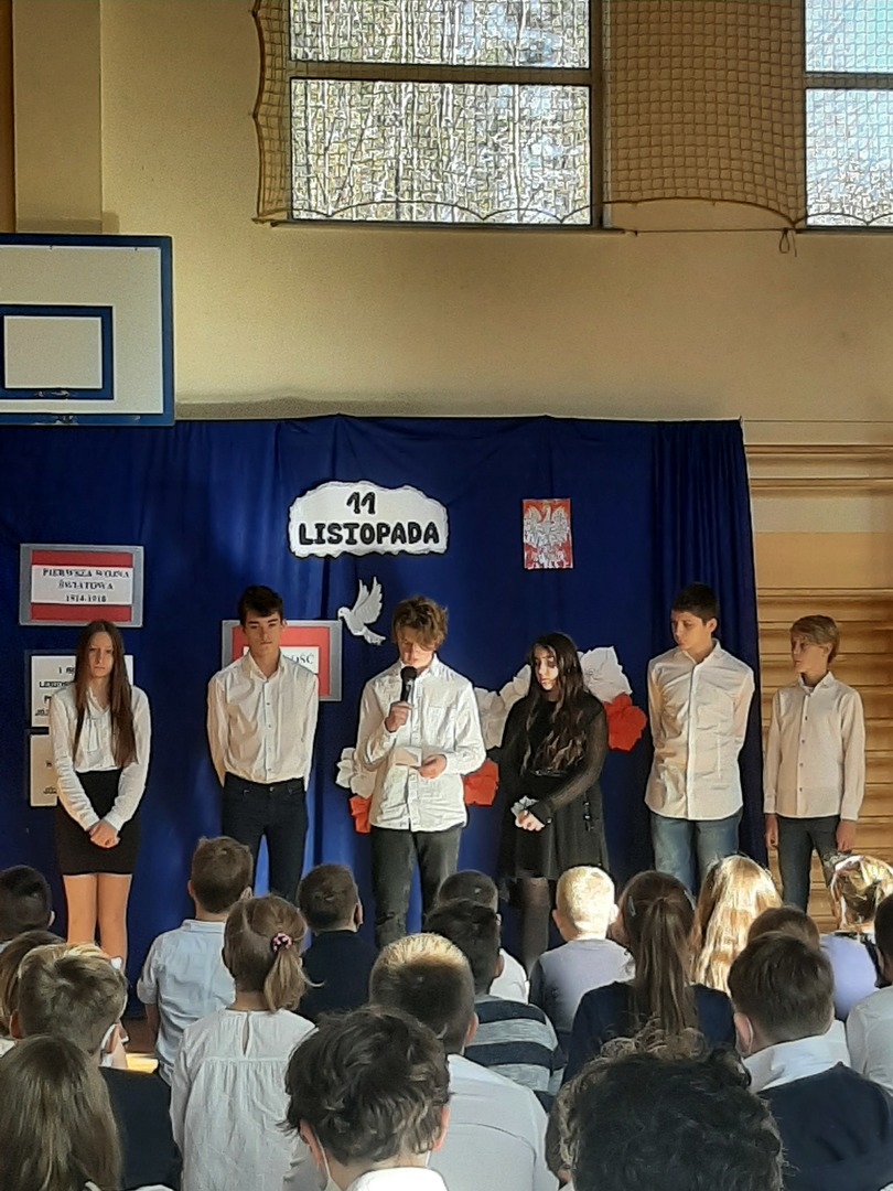 10. listopada podczas godziny wychowawczej uczniowie i nauczyciele spotkali się w szkolnej sali gimnastycznej, aby wziąć udział w specjalnie przygotowanym apelu. Spotkanie zorganizowały nauczycielki historii i religii: p. Ewa Dudek i p. Anna Michalak. Podczas naszego rocznicowego spotkanie uczniowie przypomnieli historię wydarzeń naszego kraju. Zebrani uczestnicy chętnie wzięli udział w śpiewaniu pieśni patriotycznych. W rytm pieśni uczniowie klasy IV machali biało-czerwonymi flagami.