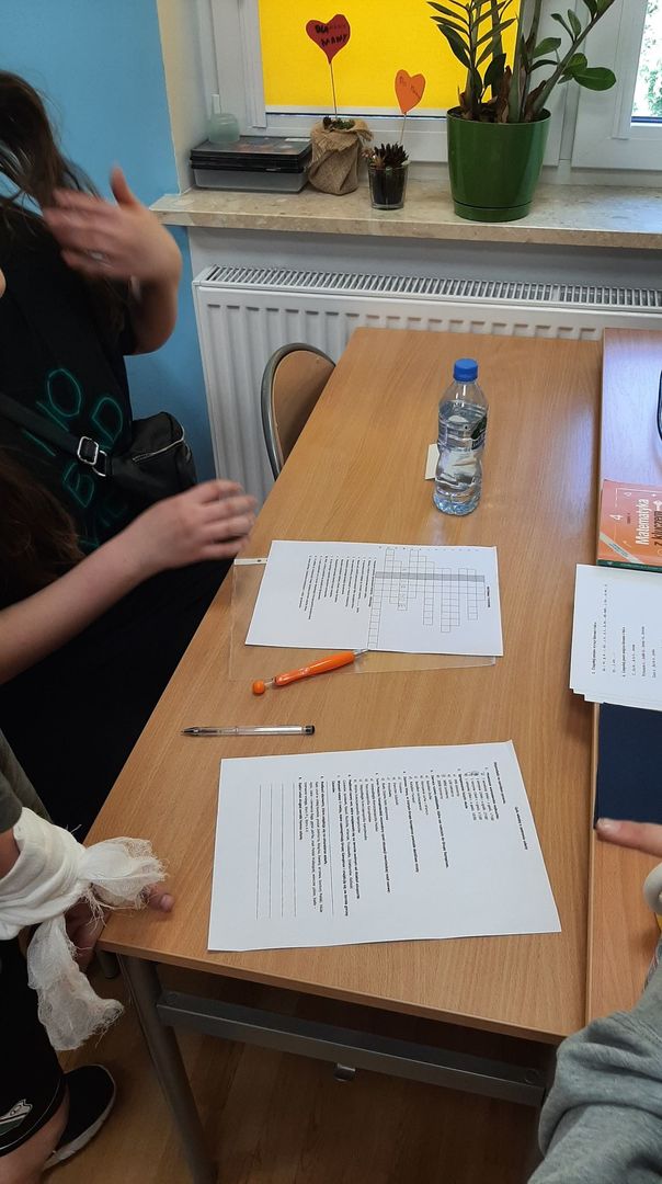 Baza D: rozwiązane quizu i krzyżówki dotyczącej patrona szkoły.