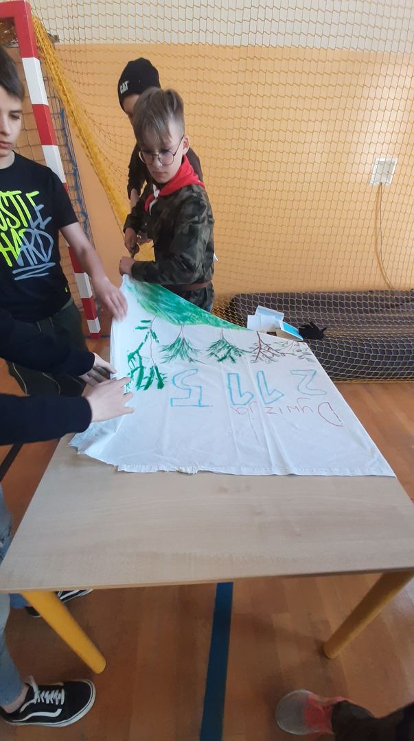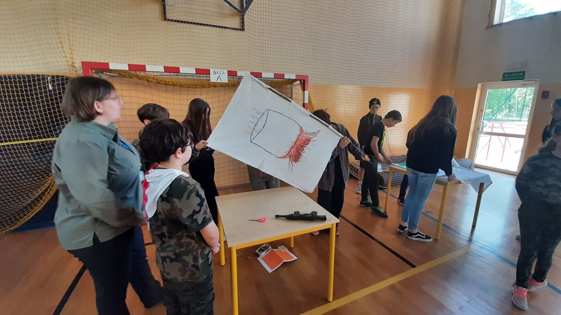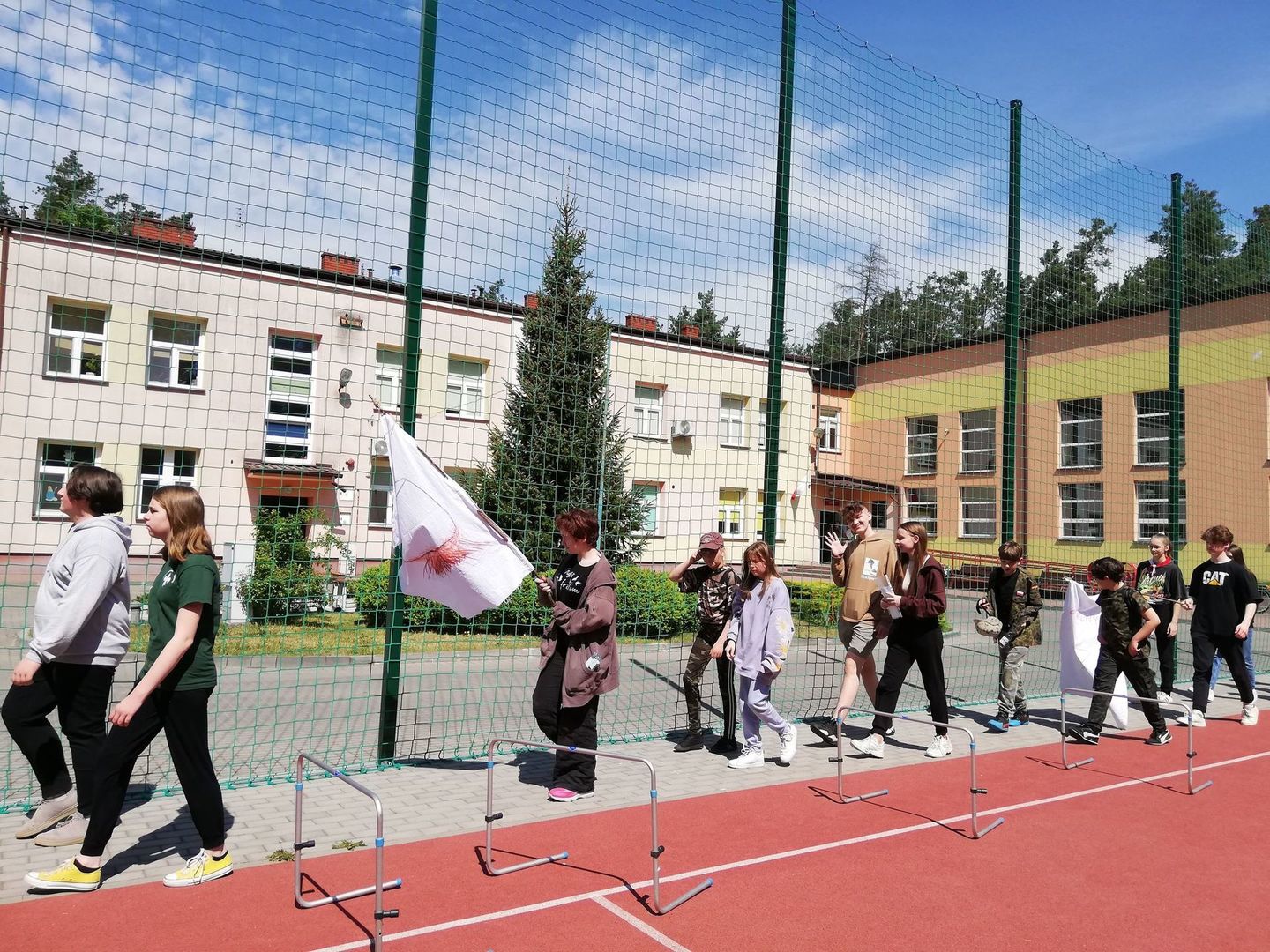 Baza E: wykazanie się umiejętnościami sportowymi (czołganie, przejście przez tunel, rzut „granatem” (szyszki) do celu, złożenie meldunku Dyrektorowi szkoły i przemarsz z wykonanymi sztandarami.
