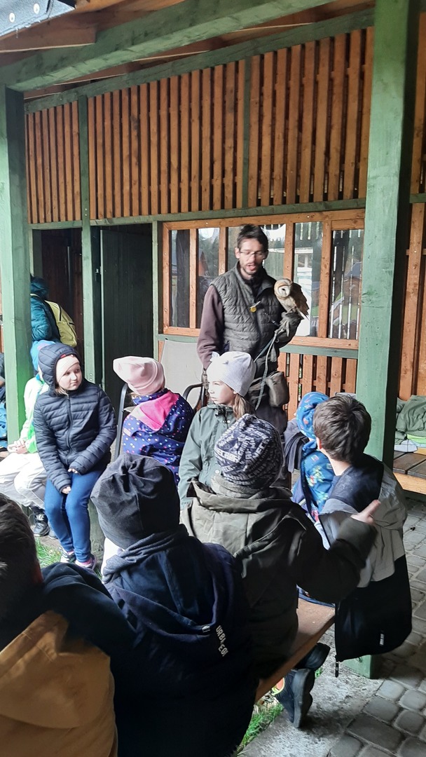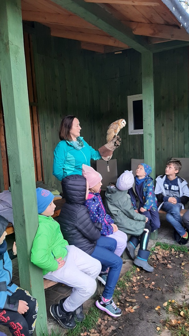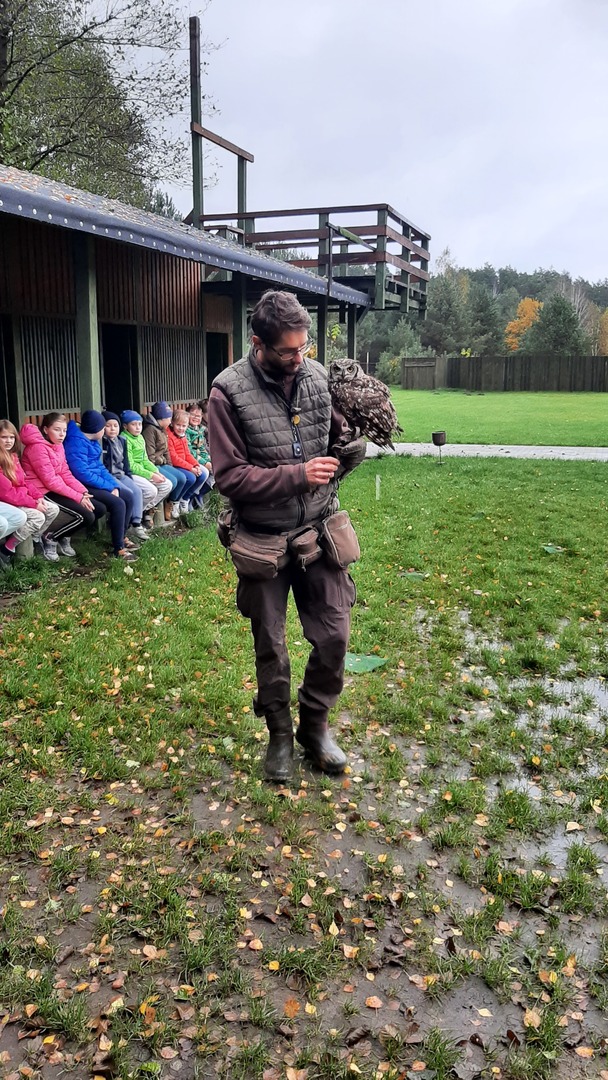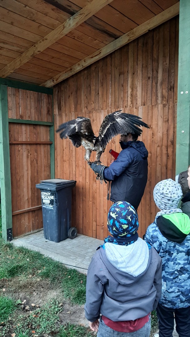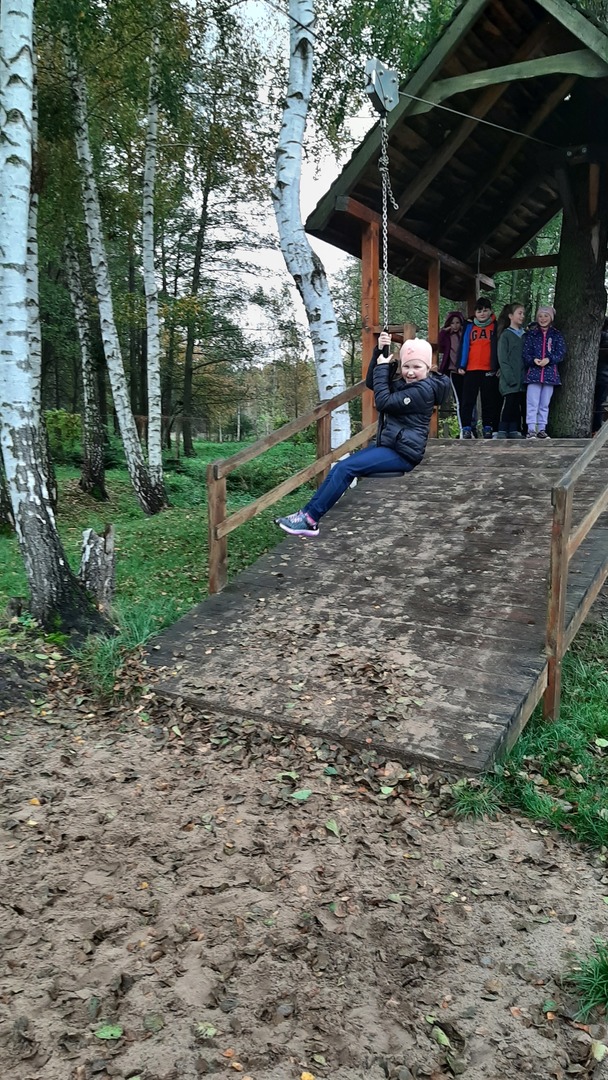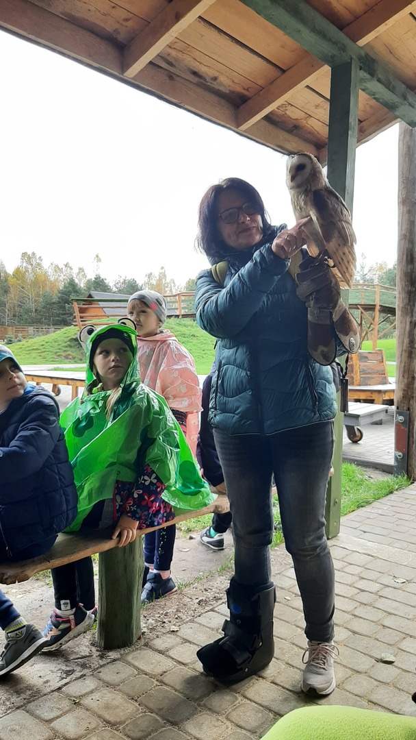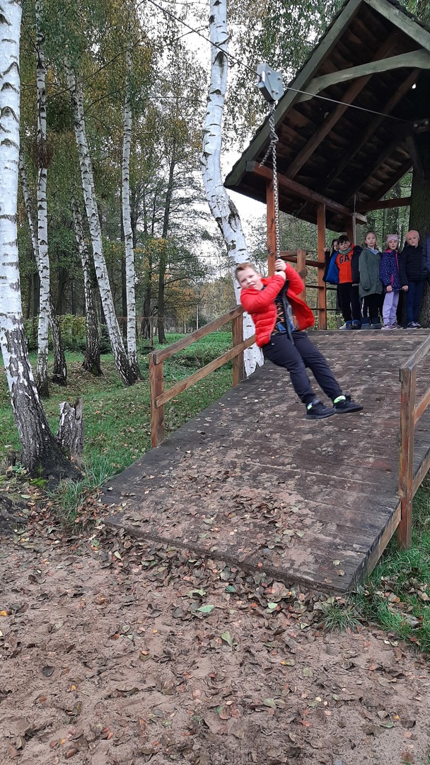 Podróż była daleka, ale razem było nam weselej. W autobusie panował radosny gwar śpiewanych piosenek i rozmów na interesujące tematy. Po dojeździe na miejsce nadszedł czas na zabawę. Zostaliśmy podzieleni na 3 grupy dzięki czemu zabawa szła bardzo sprawnie. Pierwszą atrakcją z której przyszło nam skorzystać były uwielbiane przez nas dmuchawce. Ile to było krzyków radości z wykonywanych przez nas powietrznych akrobacji. Kilka kroków dalej zjeżdżaliśmy na tyrolce. Kolejnym punktem naszego dnia były specjalnie przygotowane zajęcia przyrodnicze dotyczące sów i orłów. Pracownik "Frajdaladnii" przeprowadził z nami bardzo ciekawą lekcję dotyczącą tych zwierząt. Czy wiesz, że sowa została wybrana symbolem mądrości, chociaż sama ma bardzo mało mózg? Nie? Dla nas to było wielkie zaskoczenie. Pierwszy raz mogliśmy pogłaskać sowę po jej mięciutkich skrzydełkach. Po fantastycznych zajęciach przyrodniczych przyszedł czas na wycieczkę do mini zoo. Spotkaliśmy się z alpakami, konikami, baranami. Niektórzy z nas pierwszy raz mieli okazje karmienia zwierząt. Kolejnym punktem naszego pobytu w Budach Iłowskich był labirynt. Każdy z nas miał za zadanie wejść i samodzielnie znaleźć drogę powrotną. Oj, nie było to takie łatwe jak się nam wydawało. Nawet nasi nauczycieli zgubili się i potrzebowali pomocy w odnalezieniu właściwej drogi. Ostatnim punktem naszej wycieczki było przejście przez park linowy. Wysoko nie było, ale jednak wykonanie zadań sprawiło nam troszkę trudności. Zabawa zabawą, ale musieliśmy już wracać do szkoły. Pełni uśmiechów i dobrych wspomnień wróciliśmy do szkoły i udaliśmy się odpocząć do naszych domów.
