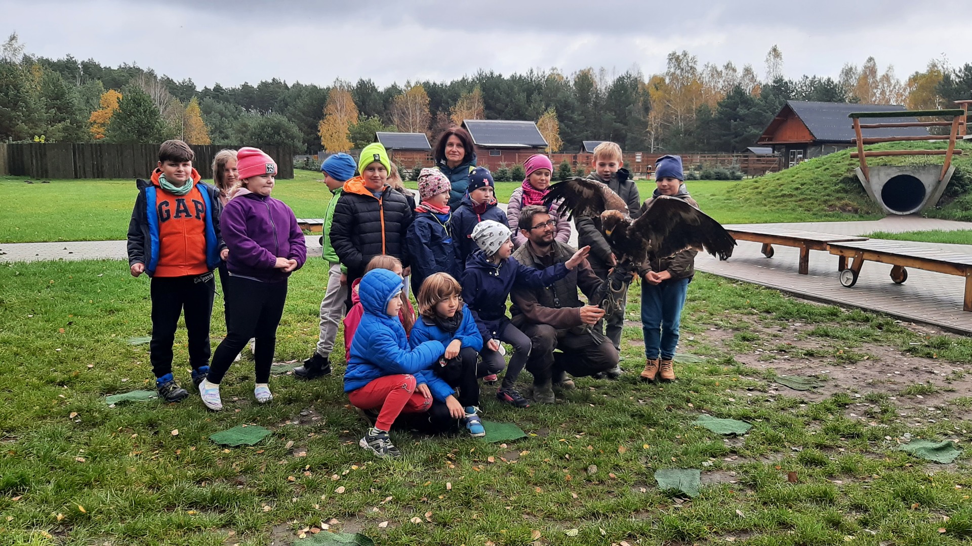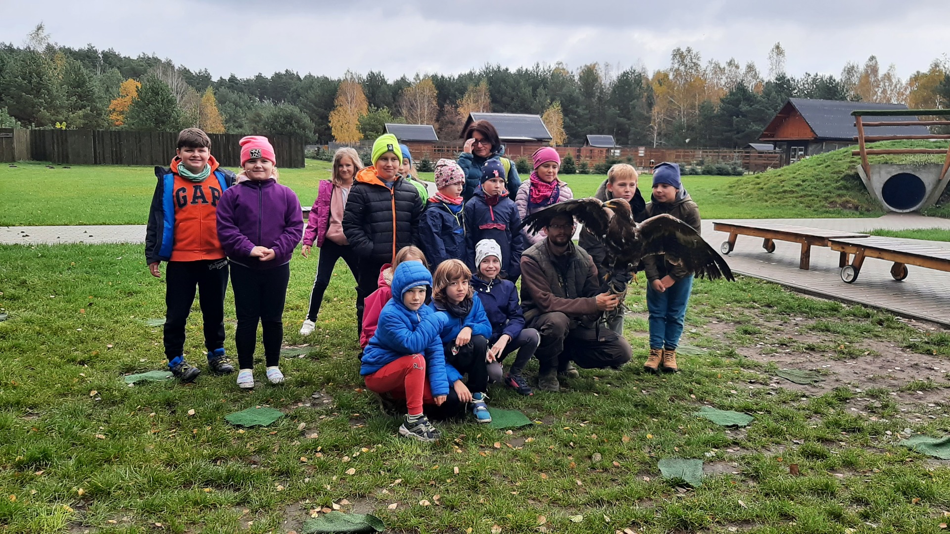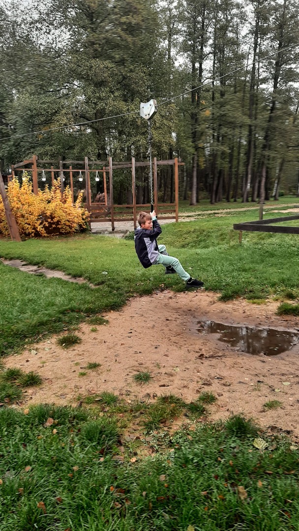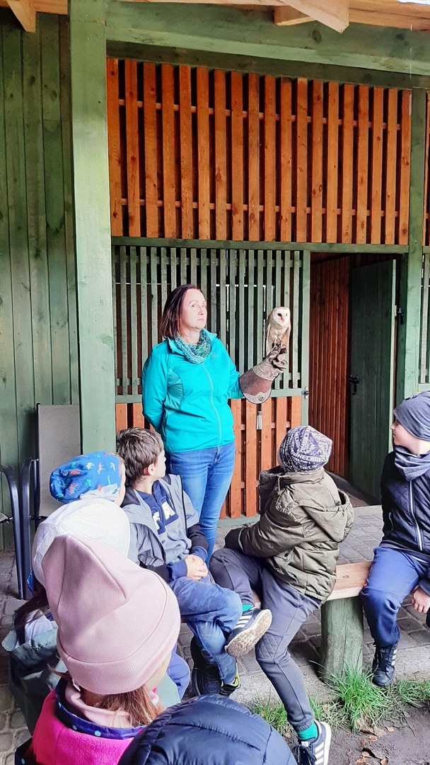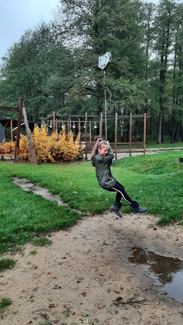 Podróż była daleka, ale razem było nam weselej. W autobusie panował radosny gwar śpiewanych piosenek i rozmów na interesujące tematy. Po dojeździe na miejsce nadszedł czas na zabawę. Zostaliśmy podzieleni na 3 grupy dzięki czemu zabawa szła bardzo sprawnie. Pierwszą atrakcją z której przyszło nam skorzystać były uwielbiane przez nas dmuchawce. Ile to było krzyków radości z wykonywanych przez nas powietrznych akrobacji. Kilka kroków dalej zjeżdżaliśmy na tyrolce. Kolejnym punktem naszego dnia były specjalnie przygotowane zajęcia przyrodnicze dotyczące sów i orłów. Pracownik "Frajdaladnii" przeprowadził z nami bardzo ciekawą lekcję dotyczącą tych zwierząt. Czy wiesz, że sowa została wybrana symbolem mądrości, chociaż sama ma bardzo mało mózg? Nie? Dla nas to było wielkie zaskoczenie. Pierwszy raz mogliśmy pogłaskać sowę po jej mięciutkich skrzydełkach. Po fantastycznych zajęciach przyrodniczych przyszedł czas na wycieczkę do mini zoo. Spotkaliśmy się z alpakami, konikami, baranami. Niektórzy z nas pierwszy raz mieli okazje karmienia zwierząt. Kolejnym punktem naszego pobytu w Budach Iłowskich był labirynt. Każdy z nas miał za zadanie wejść i samodzielnie znaleźć drogę powrotną. Oj, nie było to takie łatwe jak się nam wydawało. Nawet nasi nauczycieli zgubili się i potrzebowali pomocy w odnalezieniu właściwej drogi. Ostatnim punktem naszej wycieczki było przejście przez park linowy. Wysoko nie było, ale jednak wykonanie zadań sprawiło nam troszkę trudności. Zabawa zabawą, ale musieliśmy już wracać do szkoły. Pełni uśmiechów i dobrych wspomnień wróciliśmy do szkoły i udaliśmy się odpocząć do naszych domów.