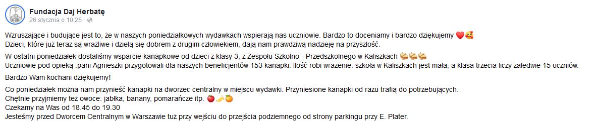 Fundacja Daj Herbatę z Warszawy na swoim portalu społecznościowym zamieściła podziękowanie dla klasy III z wychowawczynią p. Agnieszką Oszczyk za aktywny udział w akcji "Kanapka dla osób w kryzysie bezdomności".