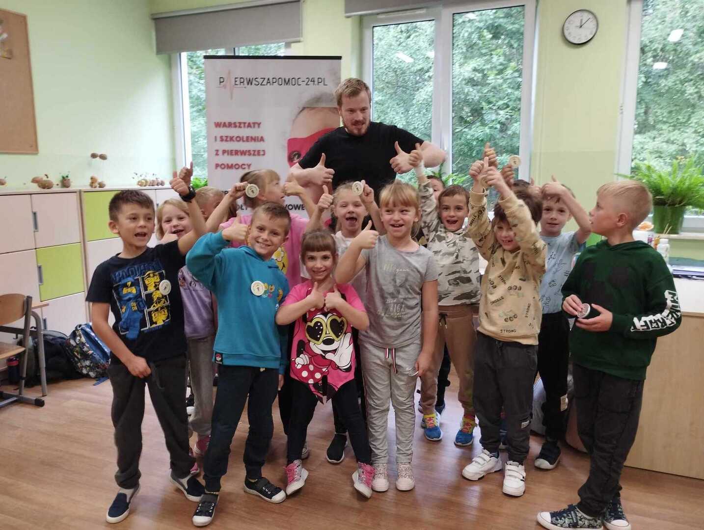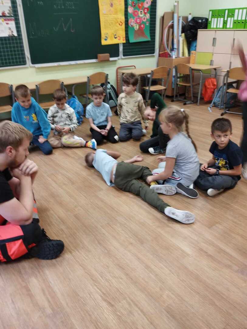 W dniu dzisiejszym, 06.10.2023 dzieci z zerówki i z klasy pierwszej wzięły udział w spotkaniu z ratownikiem medycznym "Drużyna Ratownika Juniora", panem Michałem Ewertowskim.
