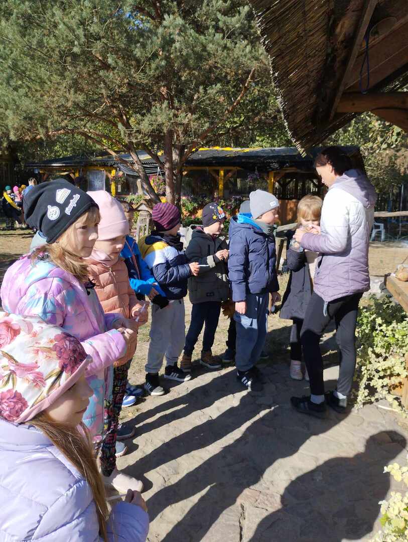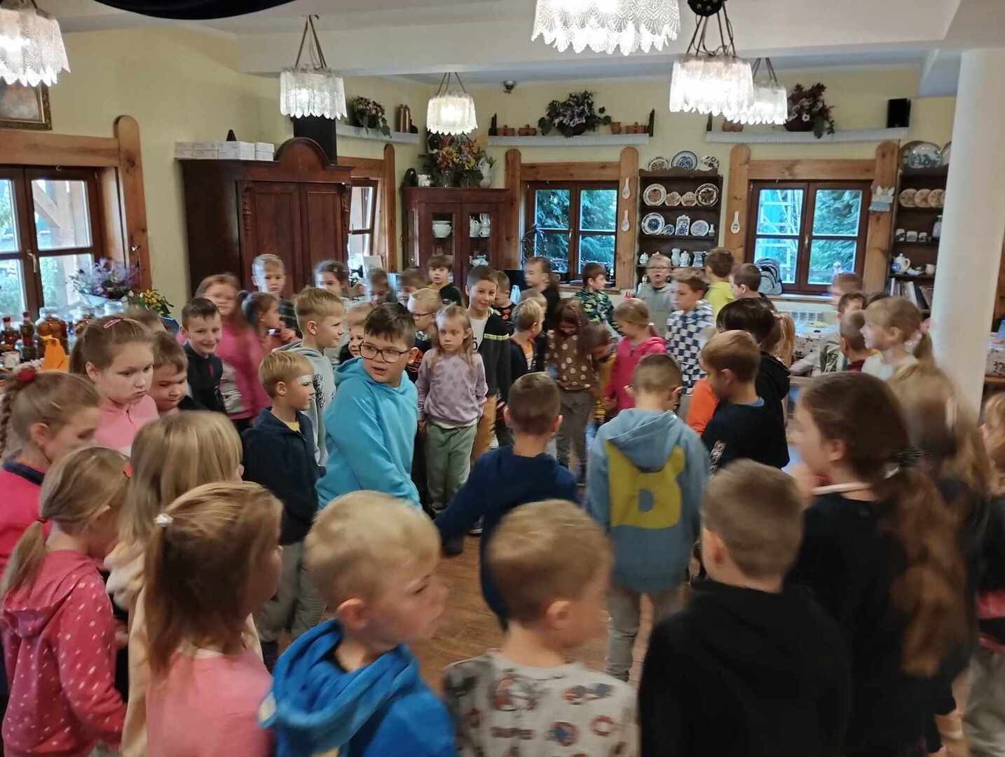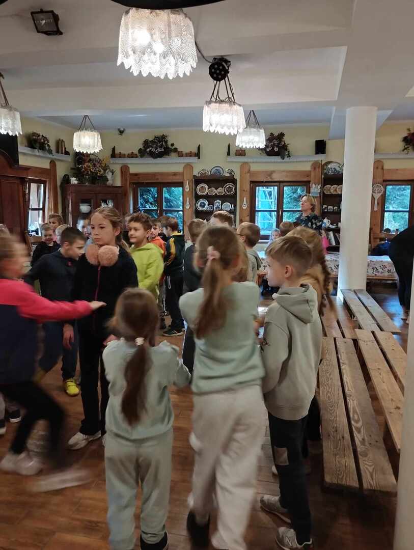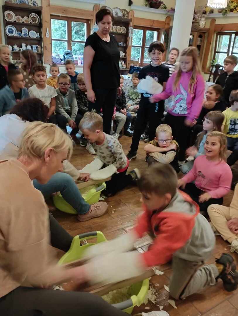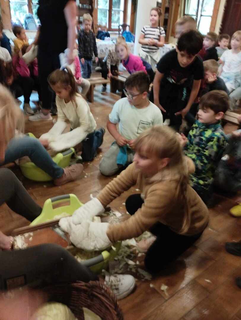 18 października uczniowie klas 0-3 wyruszyły na wycieczkę do gospodarstwa agroturystycznego „Wymysły pod Lasem”. Wielki rwetes był u Basi, bo kapustę Basia kwasi. Jednak nim to zrobi, musi przygotować produkty niezbędne do kiszenia. I tu z pomocą przyszły dzieci. Obieranie, tarcie, czy szatkowanie warzyw dostarczyło milusińskim wielu emocji. Oprócz kiszenia dzieci poznały inne naturalne sposoby konserwowania żywności. Była też okazja do upieczenia ciasta ze śliwkami. I to według przepisu prosto z piosenki. Po pracy związanej z przetworami, dzieci przygotowały „warzywne ogródki” do zakonserwowania w domu. W czasie posiłków na warsztatach dzieci próbowały kiszonej kapusty oraz własnoręcznie upieczonego ciasta – na deser oczywiście. Duży plac zabaw sprzyjał grze w piłkę, „wykopaliskom” w piasku i wielu innym aktywnościom. Podczas wizyty u Basi dzieci odwiedziły również zagrodę ze zwierzętami, gdzie karmiły kozy, owce, gęsi, kury i króliki. To była pełna radości, niezapomniana wycieczka, która na długo pozostanie w naszej pamięci.