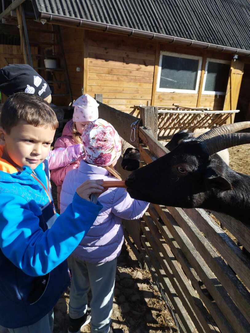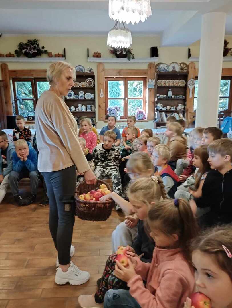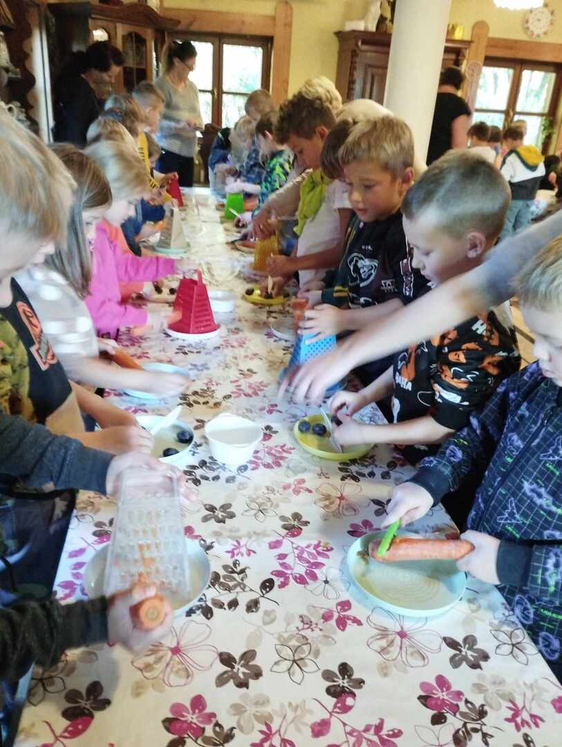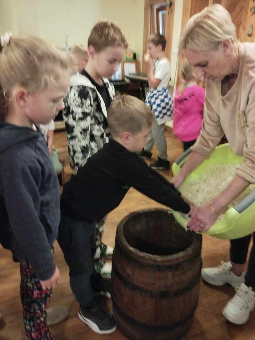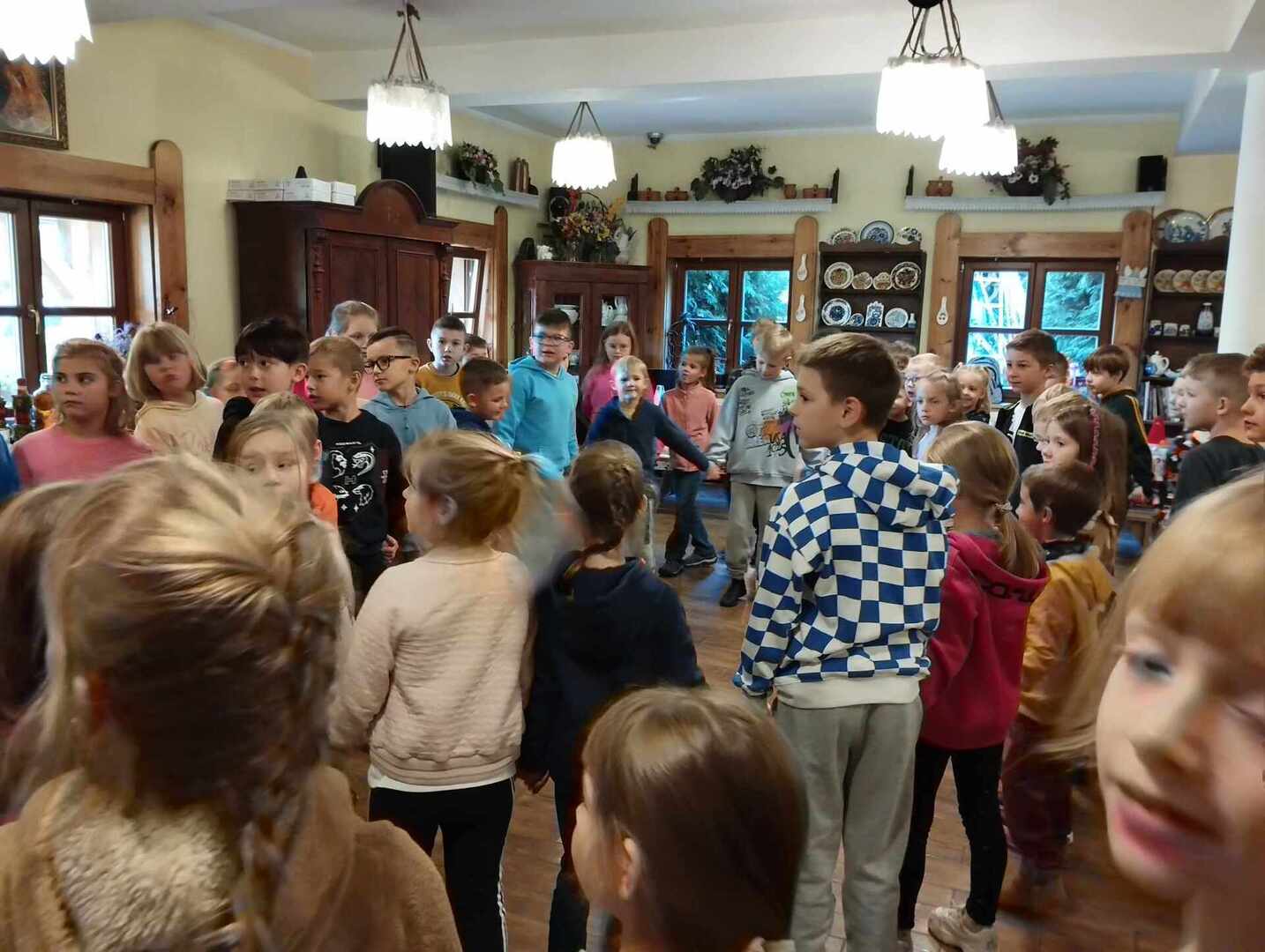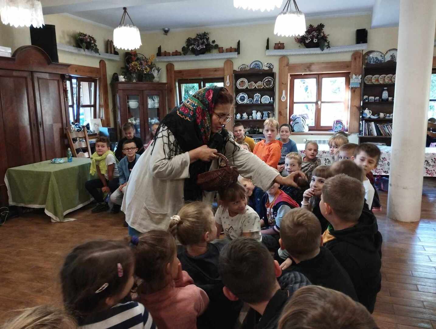 18 października uczniowie klas 0-3 wyruszyły na wycieczkę do gospodarstwa agroturystycznego „Wymysły pod Lasem”. Wielki rwetes był u Basi, bo kapustę Basia kwasi. Jednak nim to zrobi, musi przygotować produkty niezbędne do kiszenia. I tu z pomocą przyszły dzieci. Obieranie, tarcie, czy szatkowanie warzyw dostarczyło milusińskim wielu emocji. Oprócz kiszenia dzieci poznały inne naturalne sposoby konserwowania żywności. Była też okazja do upieczenia ciasta ze śliwkami. I to według przepisu prosto z piosenki. Po pracy związanej z przetworami, dzieci przygotowały „warzywne ogródki” do zakonserwowania w domu. W czasie posiłków na warsztatach dzieci próbowały kiszonej kapusty oraz własnoręcznie upieczonego ciasta – na deser oczywiście. Duży plac zabaw sprzyjał grze w piłkę, „wykopaliskom” w piasku i wielu innym aktywnościom. Podczas wizyty u Basi dzieci odwiedziły również zagrodę ze zwierzętami, gdzie karmiły kozy, owce, gęsi, kury i króliki. To była pełna radości, niezapomniana wycieczka, która na długo pozostanie w naszej pamięci.