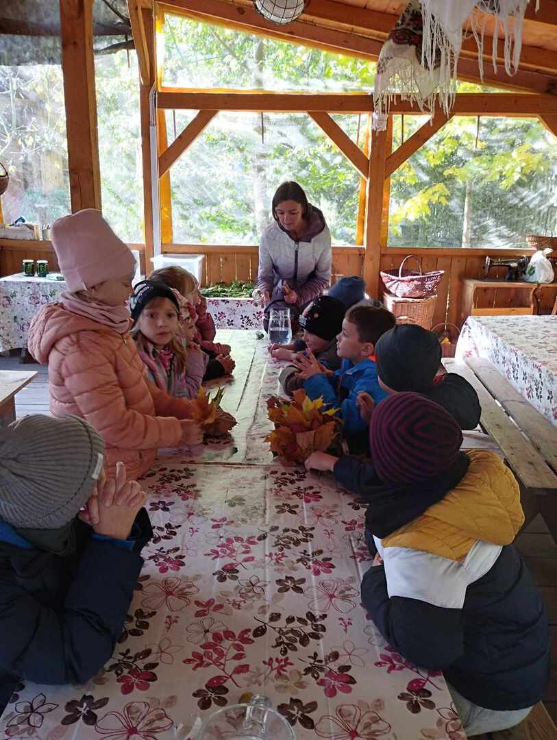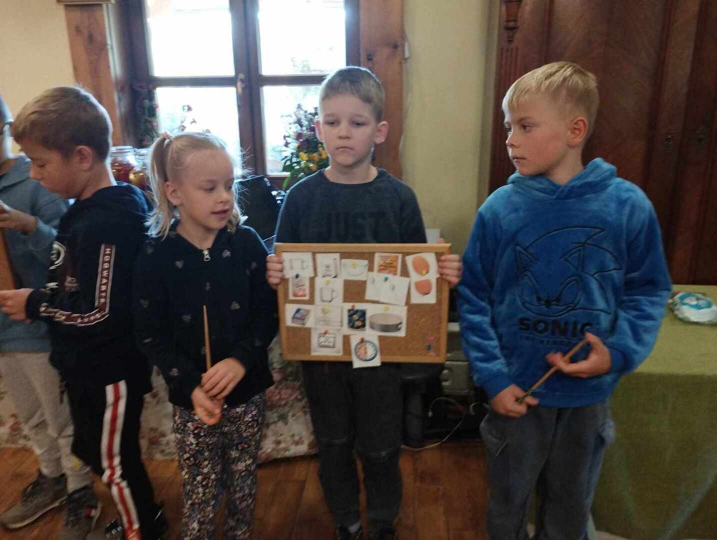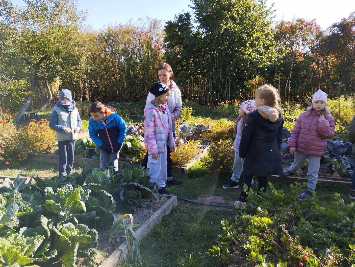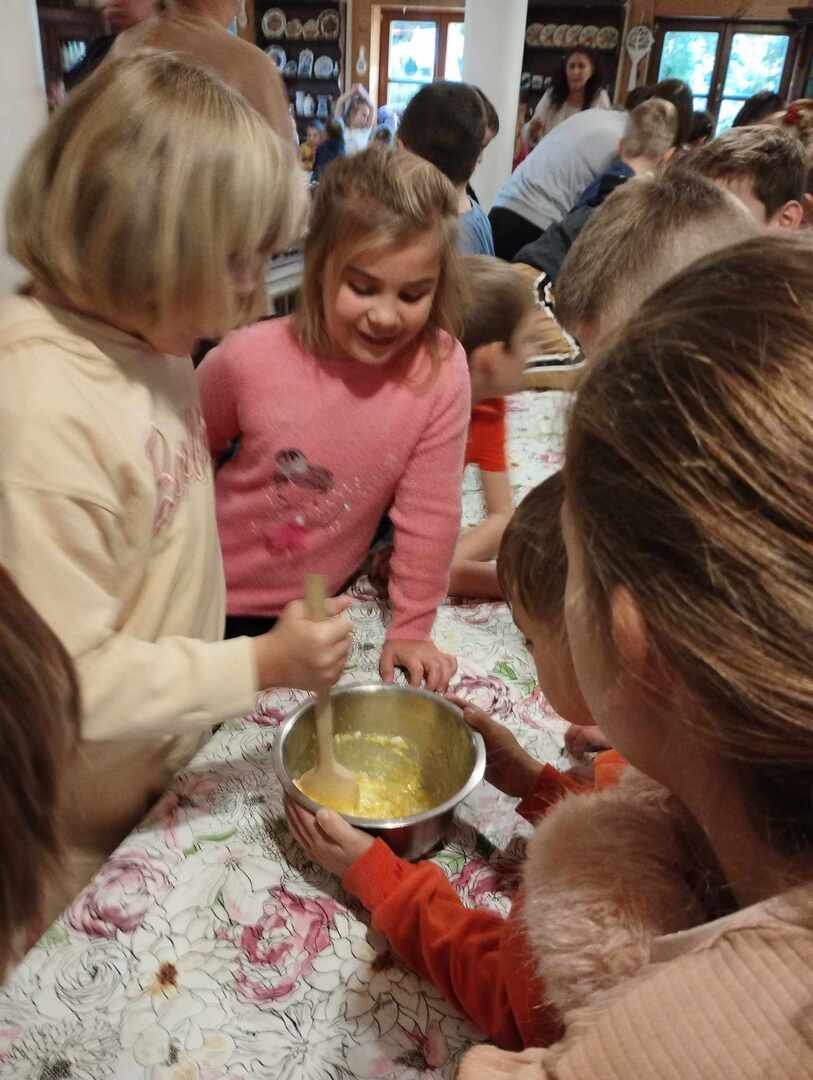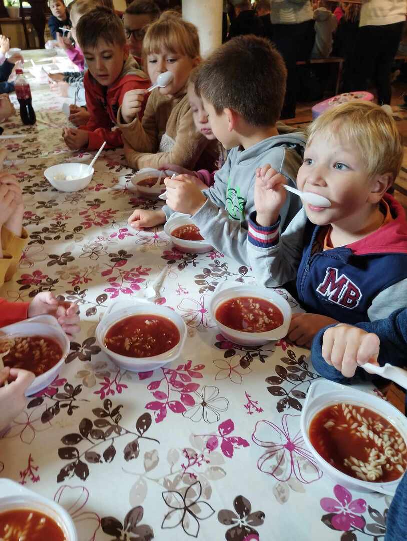 18 października uczniowie klas 0-3 wyruszyły na wycieczkę do gospodarstwa agroturystycznego „Wymysły pod Lasem”. Wielki rwetes był u Basi, bo kapustę Basia kwasi. Jednak nim to zrobi, musi przygotować produkty niezbędne do kiszenia. I tu z pomocą przyszły dzieci. Obieranie, tarcie, czy szatkowanie warzyw dostarczyło milusińskim wielu emocji. Oprócz kiszenia dzieci poznały inne naturalne sposoby konserwowania żywności. Była też okazja do upieczenia ciasta ze śliwkami. I to według przepisu prosto z piosenki. Po pracy związanej z przetworami, dzieci przygotowały „warzywne ogródki” do zakonserwowania w domu. W czasie posiłków na warsztatach dzieci próbowały kiszonej kapusty oraz własnoręcznie upieczonego ciasta – na deser oczywiście. Duży plac zabaw sprzyjał grze w piłkę, „wykopaliskom” w piasku i wielu innym aktywnościom. Podczas wizyty u Basi dzieci odwiedziły również zagrodę ze zwierzętami, gdzie karmiły kozy, owce, gęsi, kury i króliki. To była pełna radości, niezapomniana wycieczka, która na długo pozostanie w naszej pamięci.