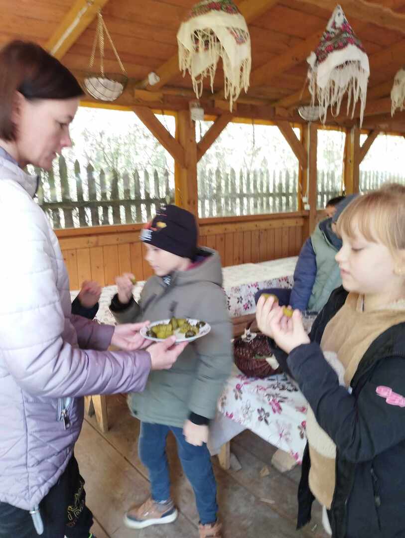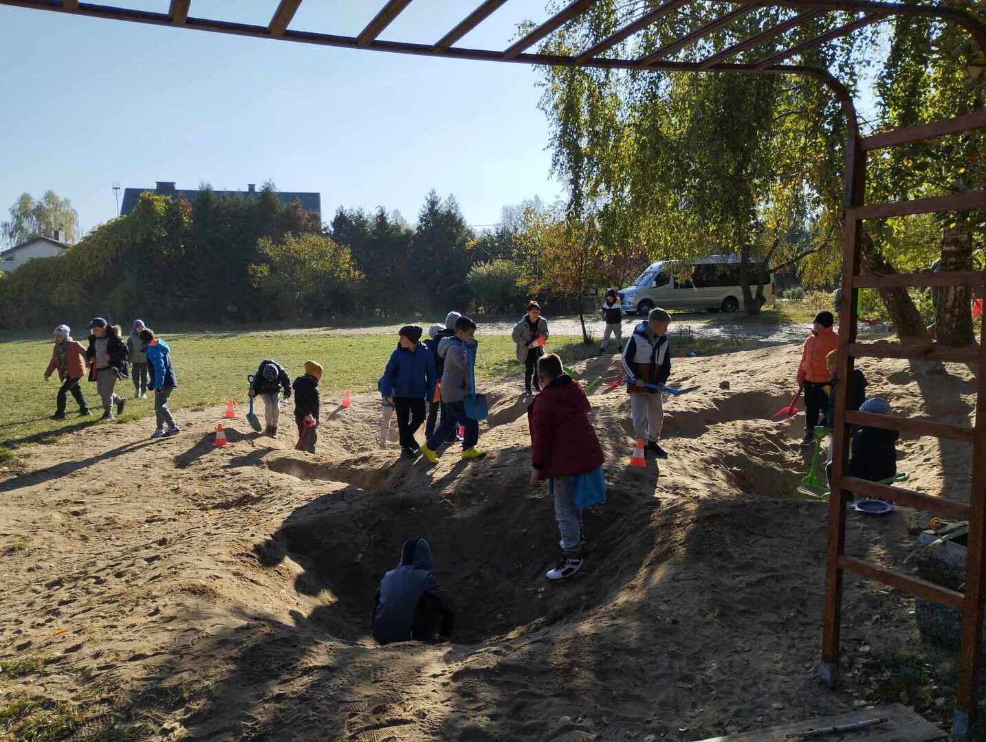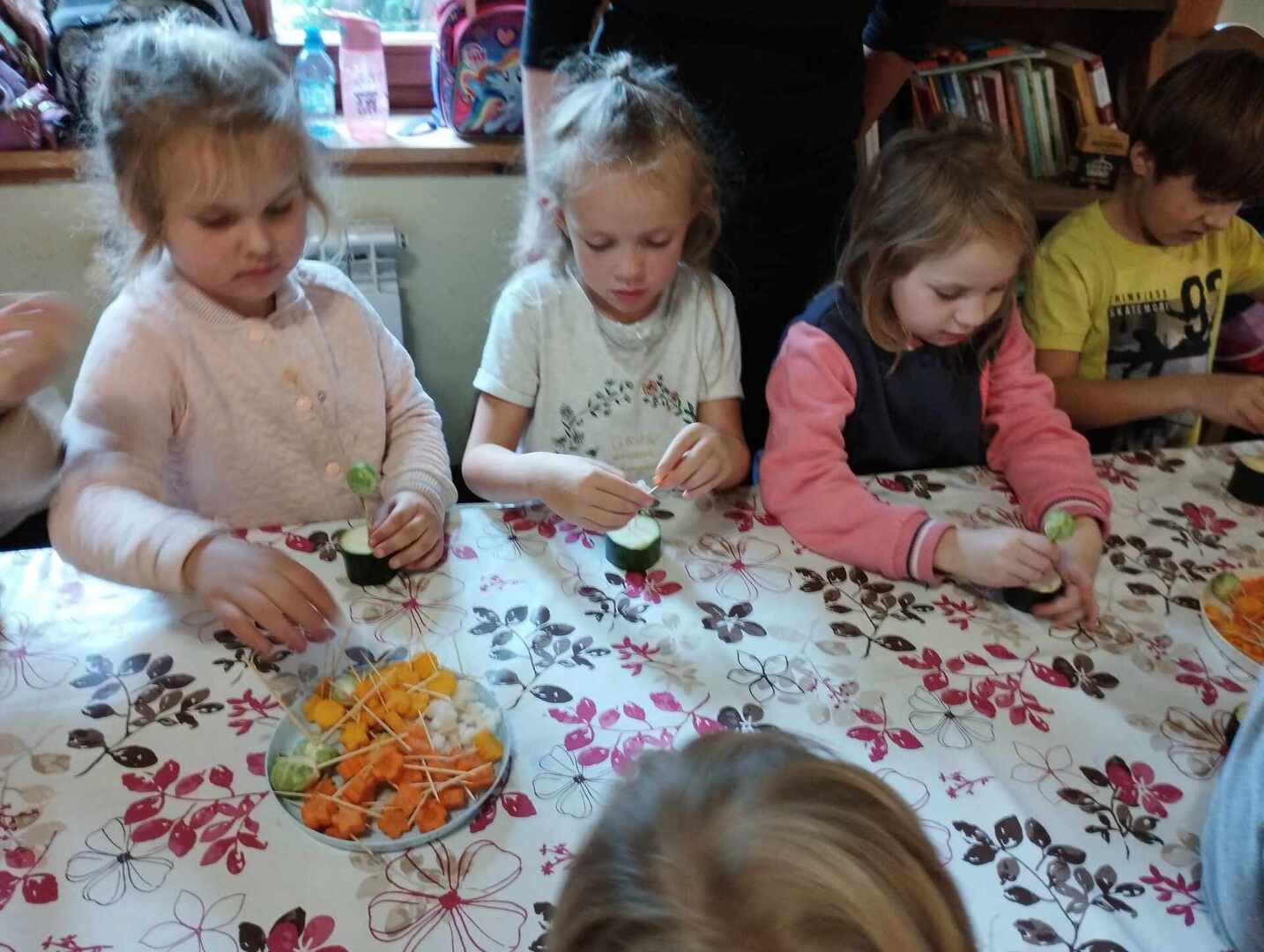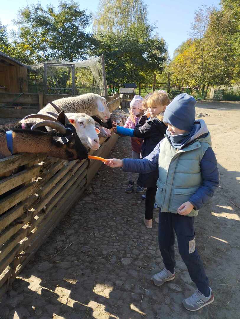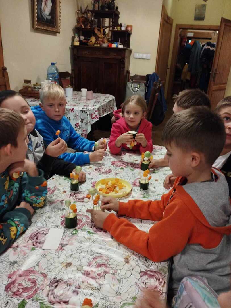 18 października uczniowie klas 0-3 wyruszyły na wycieczkę do gospodarstwa agroturystycznego „Wymysły pod Lasem”. Wielki rwetes był u Basi, bo kapustę Basia kwasi. Jednak nim to zrobi, musi przygotować produkty niezbędne do kiszenia. I tu z pomocą przyszły dzieci. Obieranie, tarcie, czy szatkowanie warzyw dostarczyło milusińskim wielu emocji. Oprócz kiszenia dzieci poznały inne naturalne sposoby konserwowania żywności. Była też okazja do upieczenia ciasta ze śliwkami. I to według przepisu prosto z piosenki. Po pracy związanej z przetworami, dzieci przygotowały „warzywne ogródki” do zakonserwowania w domu. W czasie posiłków na warsztatach dzieci próbowały kiszonej kapusty oraz własnoręcznie upieczonego ciasta – na deser oczywiście. Duży plac zabaw sprzyjał grze w piłkę, „wykopaliskom” w piasku i wielu innym aktywnościom. Podczas wizyty u Basi dzieci odwiedziły również zagrodę ze zwierzętami, gdzie karmiły kozy, owce, gęsi, kury i króliki. To była pełna radości, niezapomniana wycieczka, która na długo pozostanie w naszej pamięci.