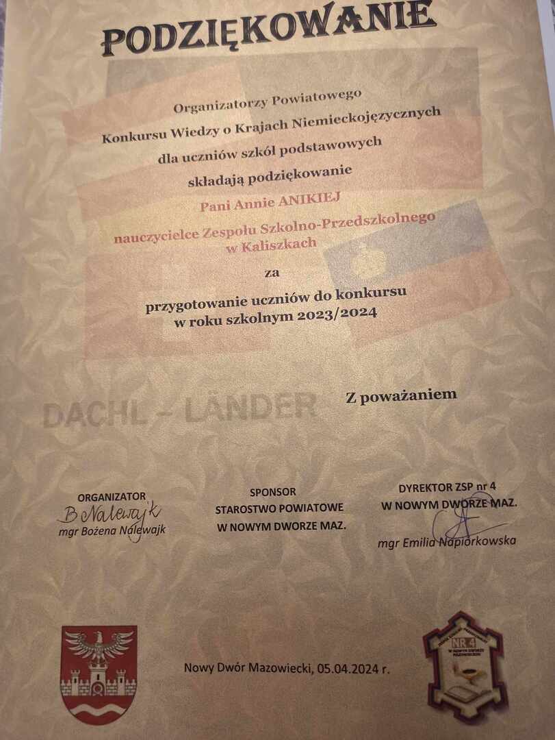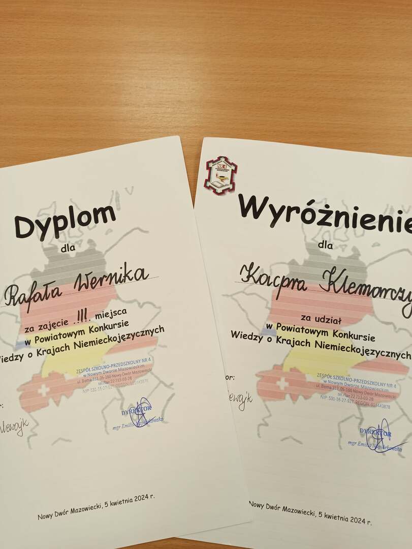 W dniu 05.04.2024 r. odbył się I Powiatowy Konkurs Wiedzy o Krajach Niemieckojęzycznych zorganizowany przez Zespół Szkolno-Przedszkolny nr 4 w Nowym Dworze Mazowieckim.
