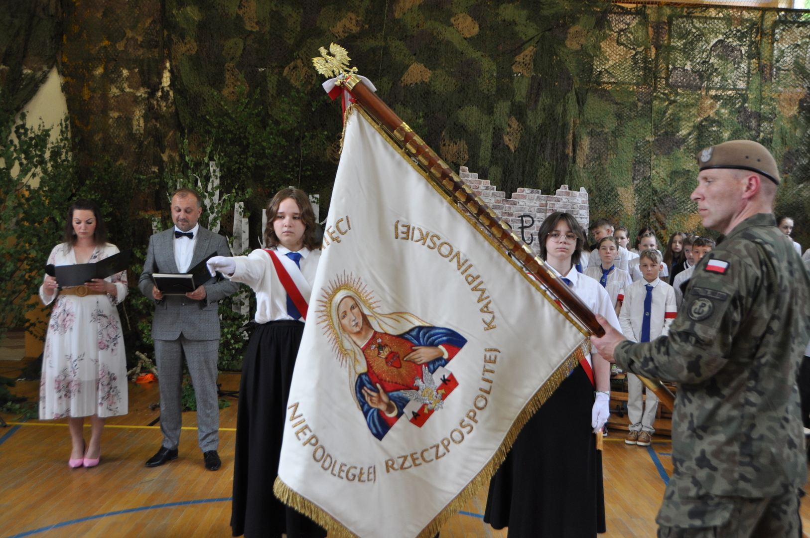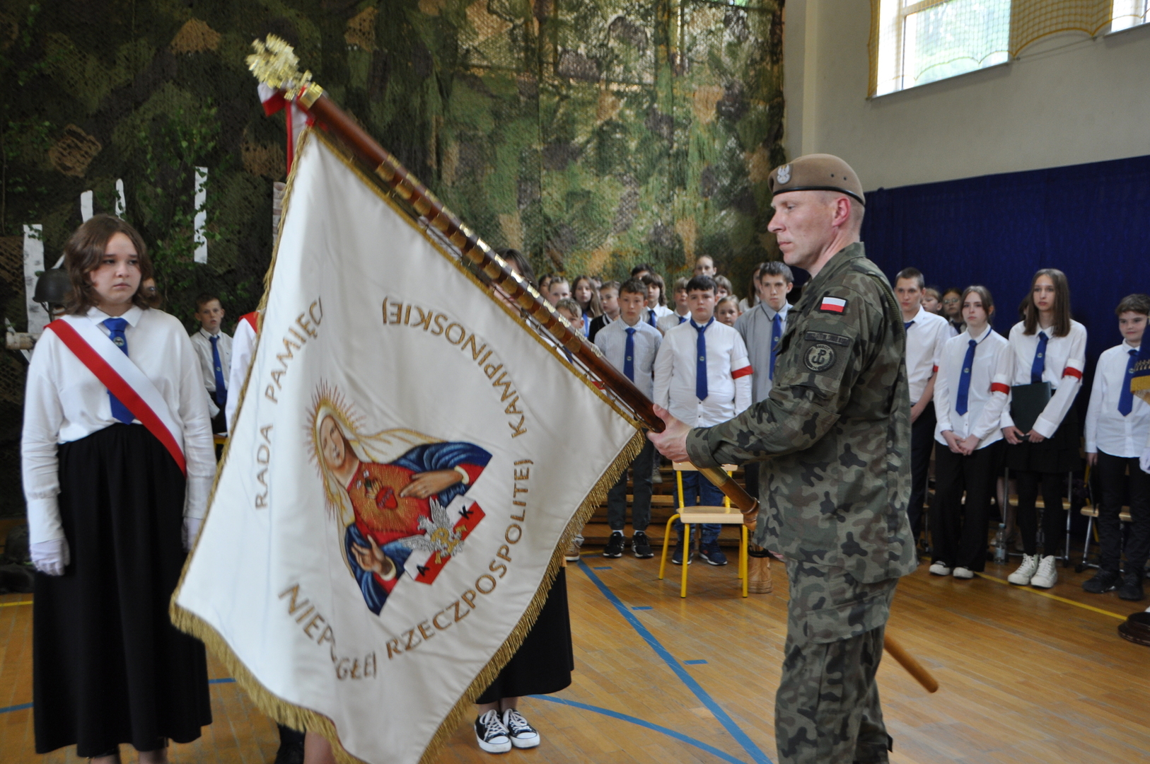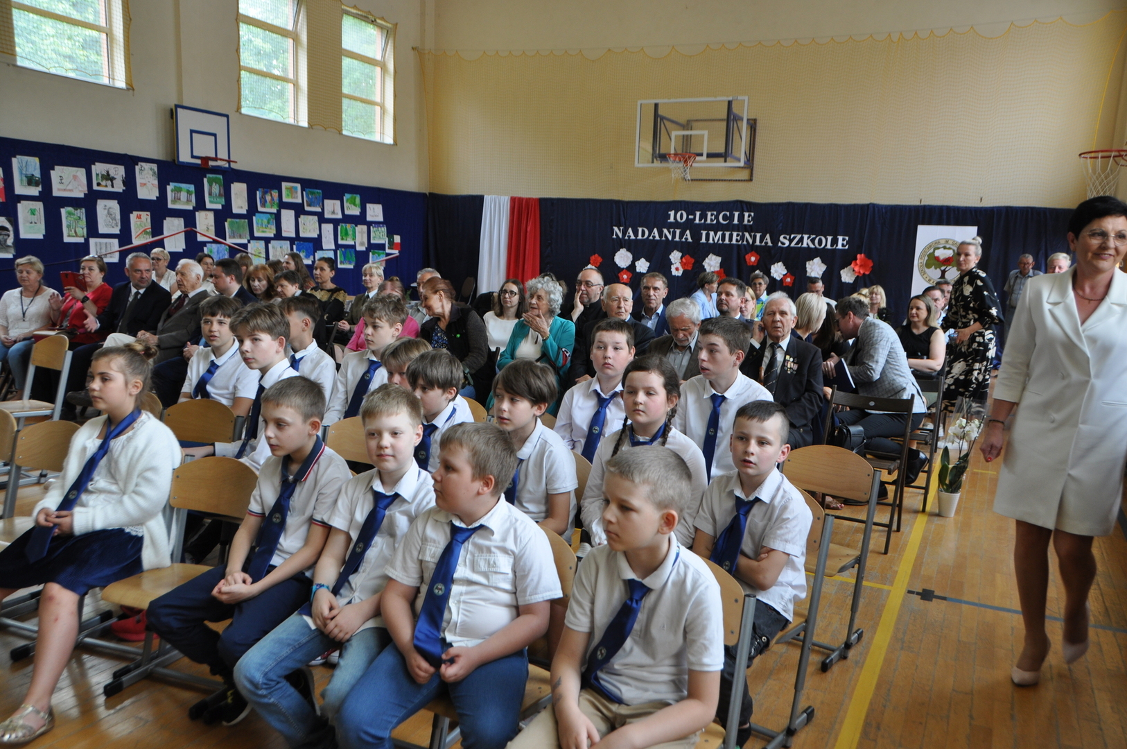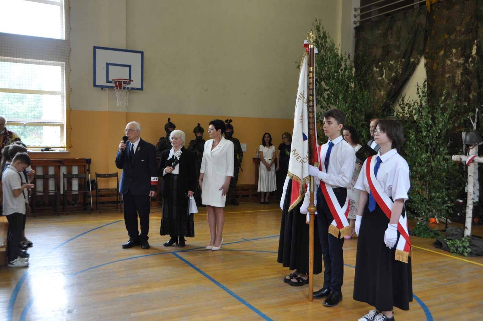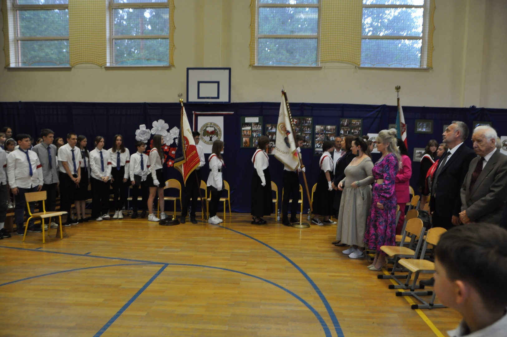 Jednym z ważniejszych punktów Jubileuszu było uroczyste przekazanie p. Dyrektor Annie Tarsale sztandaru Rady Pamięci Niepodległej Rzeczypospolitej Kampinoskiej przez panią Prezes RPNRK p. Urszulę Przymus. Ta chwila zapisała się na kartach historii szkoły złotymi literami ze względu na to, że otrzymaliśmy ważną pamiątkę związaną z działalnością żołnierzy Grupy Kampinos na naszym terytorium. W obecności wszystkich zebranych uczniowie złożyli uroczystą rotę przysięgi.