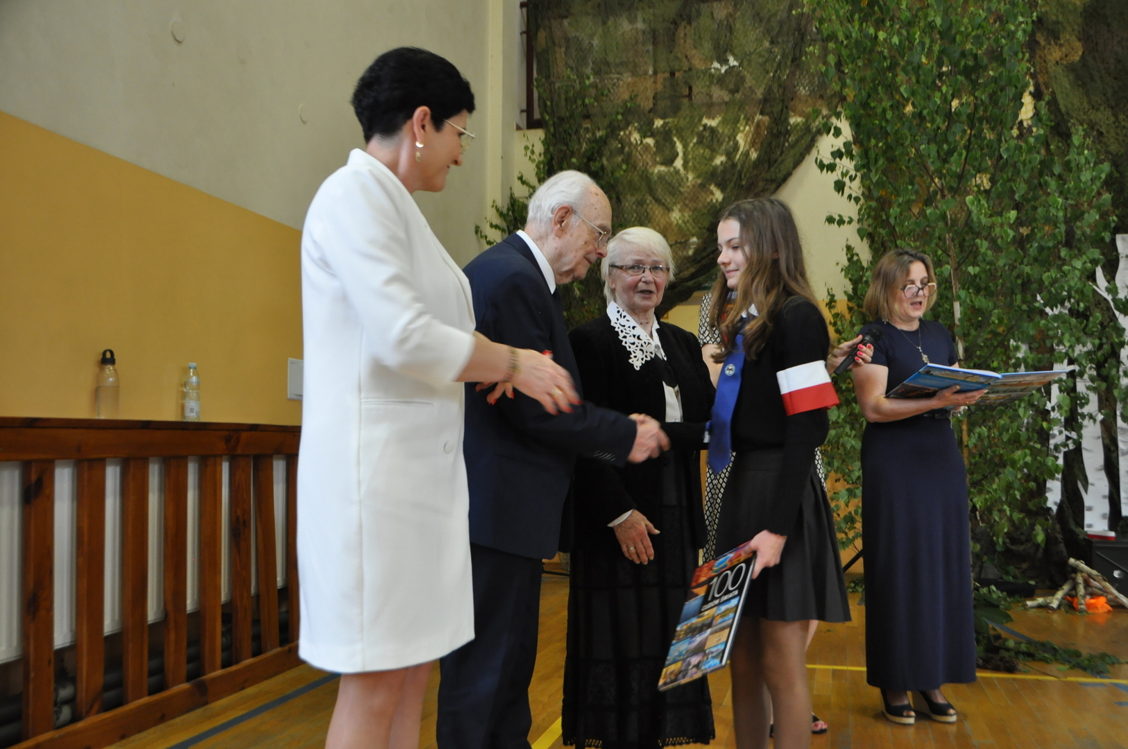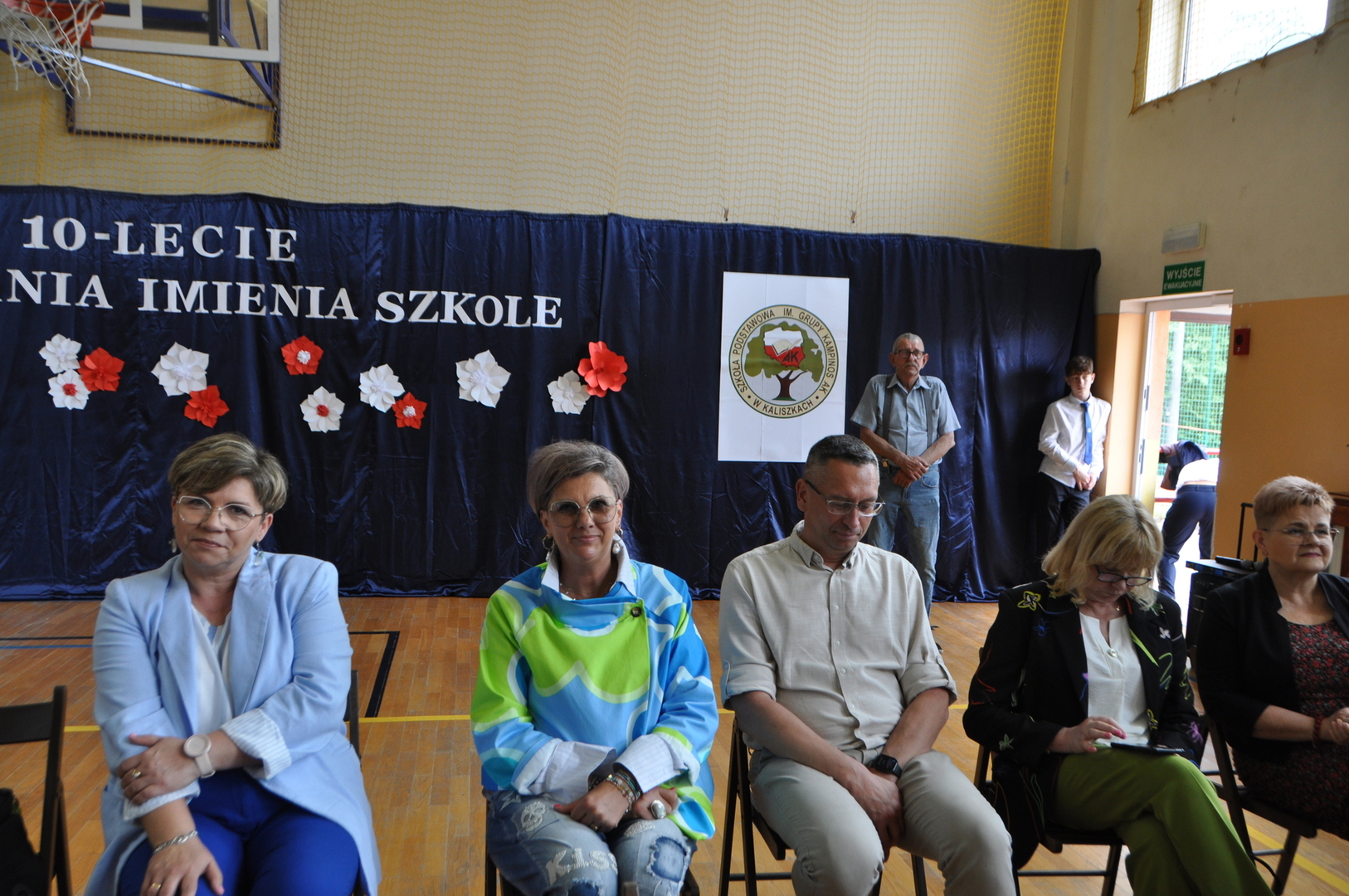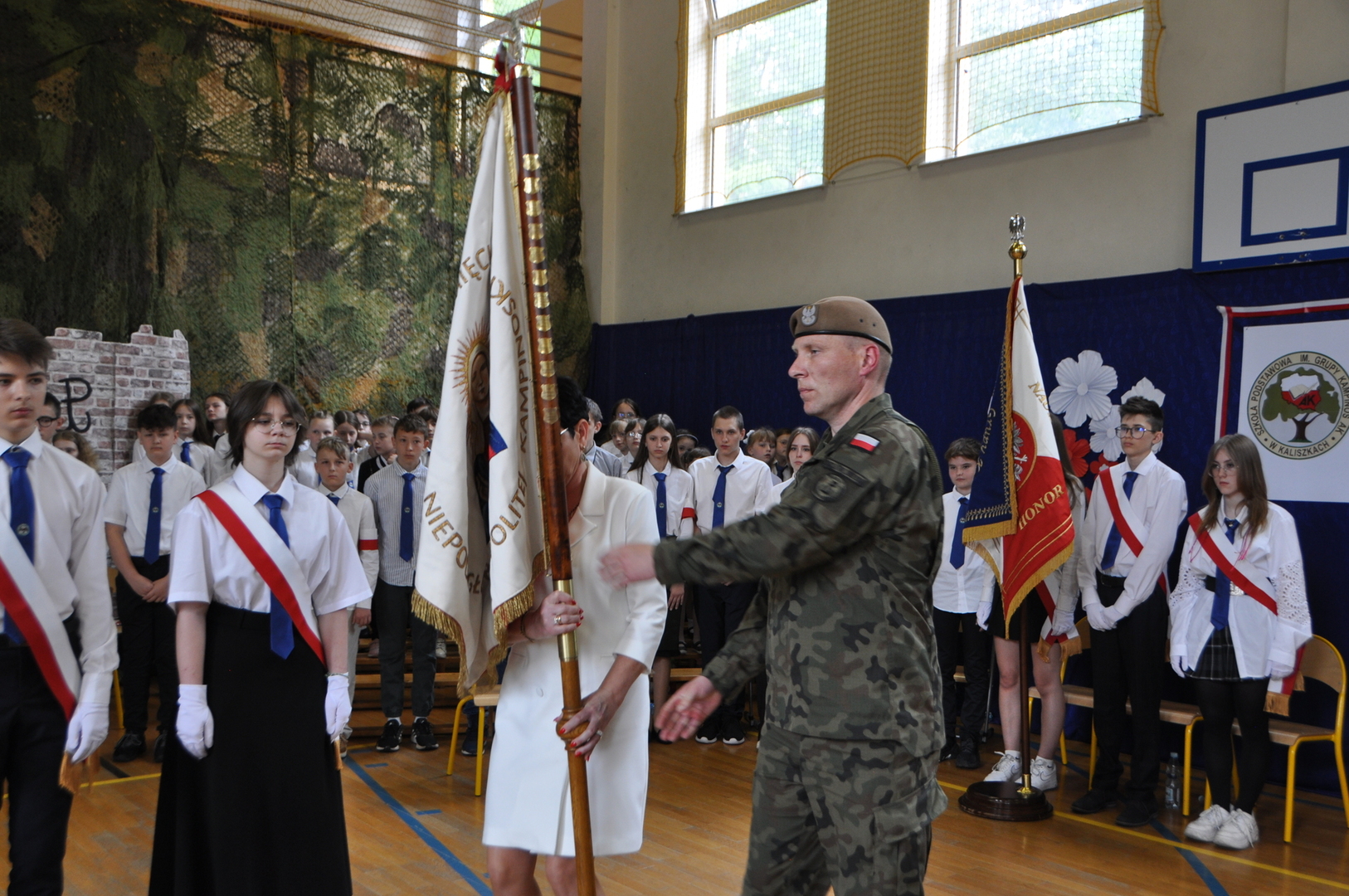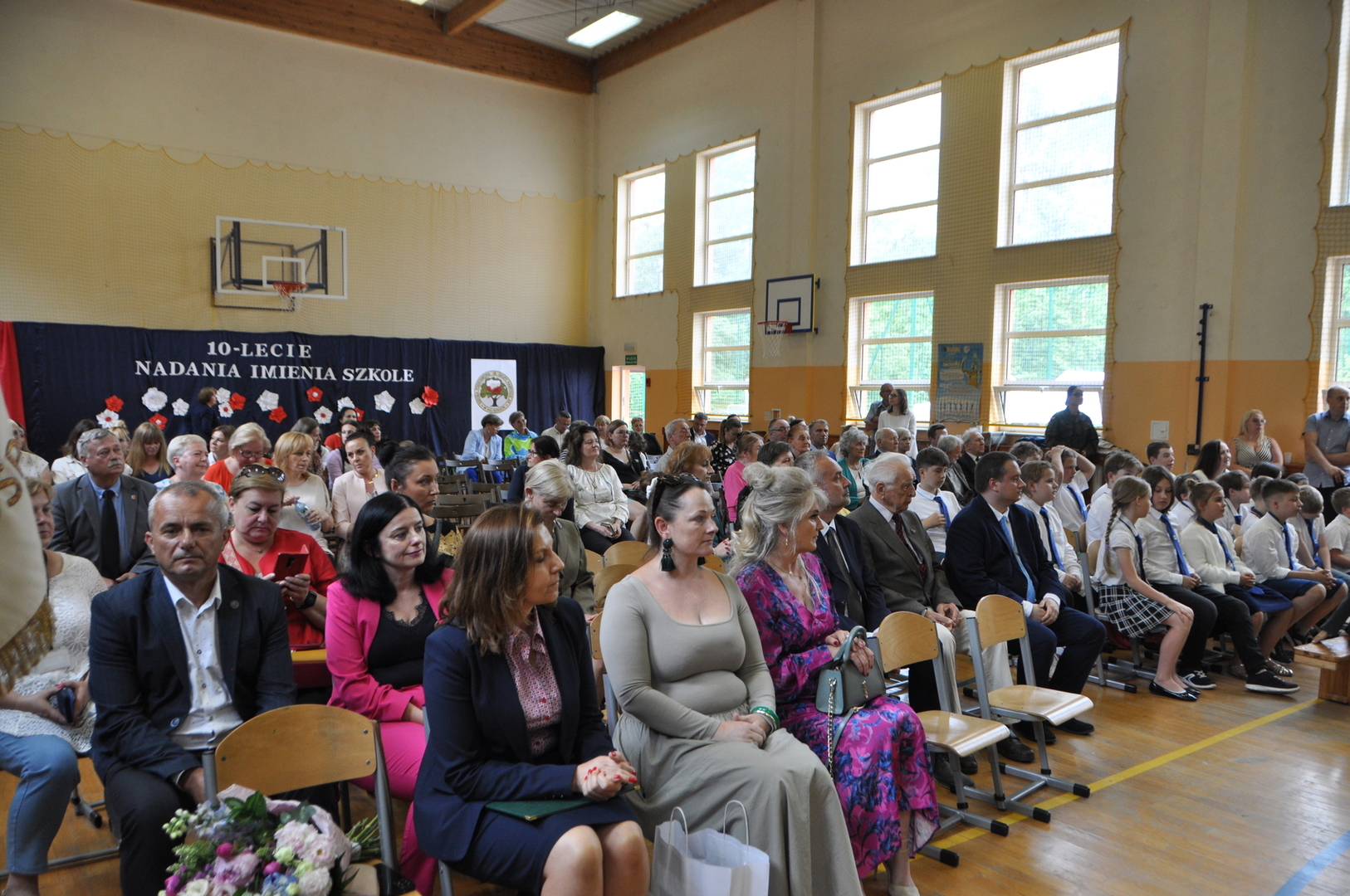 Jednym z ważniejszych punktów Jubileuszu było uroczyste przekazanie p. Dyrektor Annie Tarsale sztandaru Rady Pamięci Niepodległej Rzeczypospolitej Kampinoskiej przez panią Prezes RPNRK p. Urszulę Przymus. Ta chwila zapisała się na kartach historii szkoły złotymi literami ze względu na to, że otrzymaliśmy ważną pamiątkę związaną z działalnością żołnierzy Grupy Kampinos na naszym terytorium. W obecności wszystkich zebranych uczniowie złożyli uroczystą rotę przysięgi.