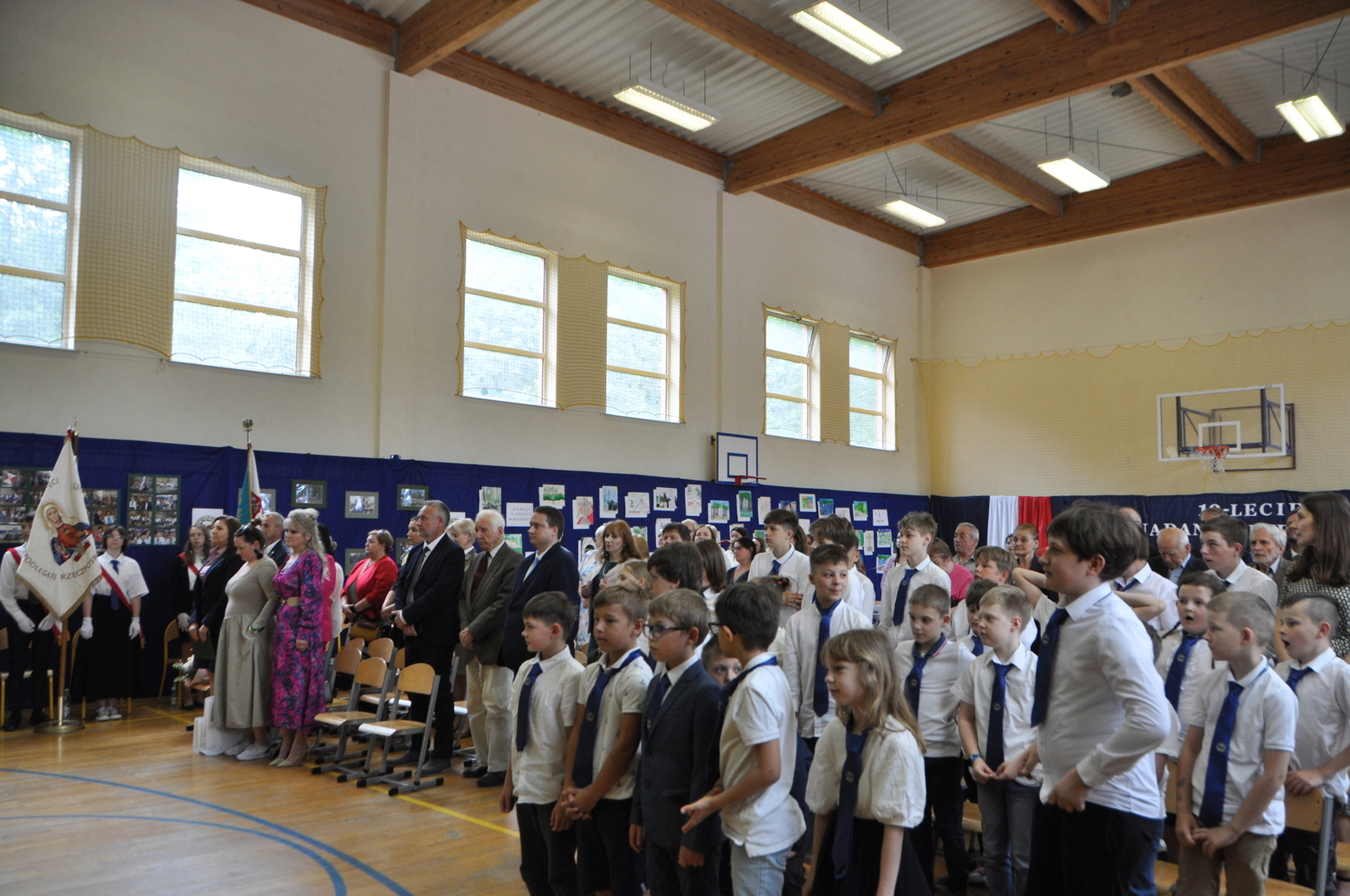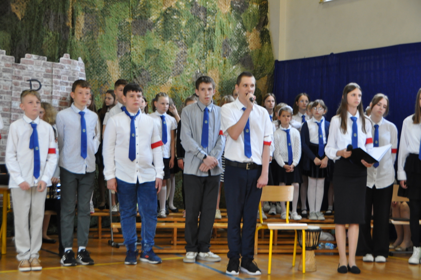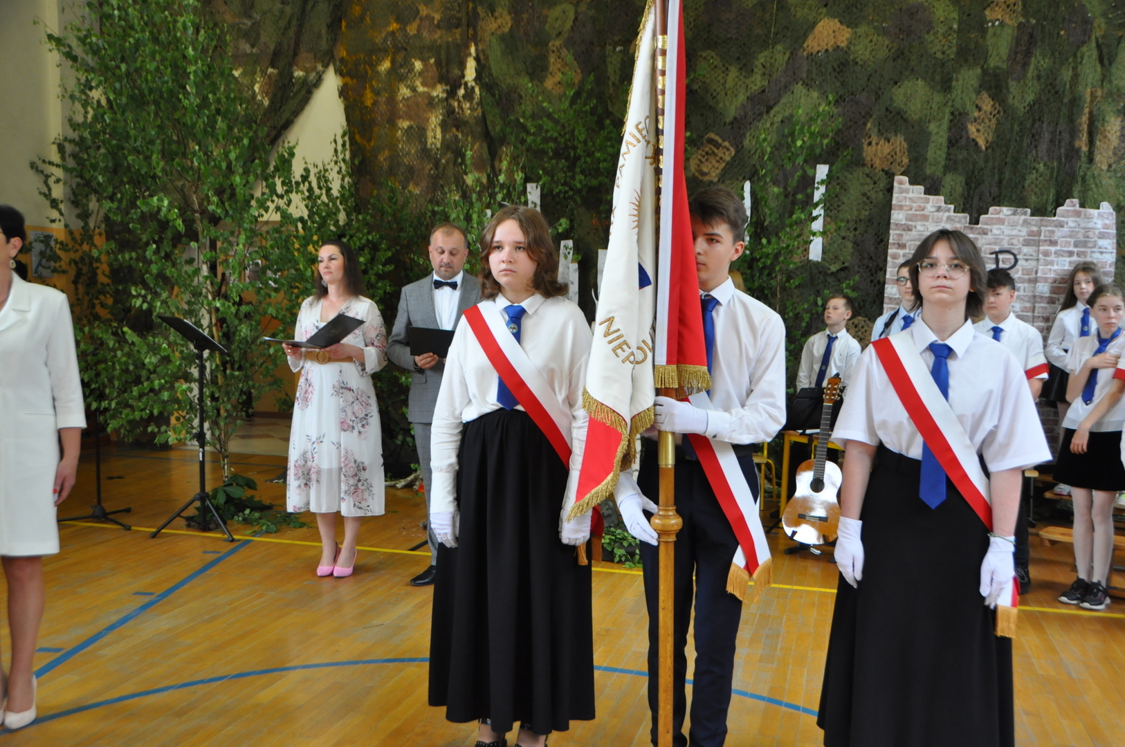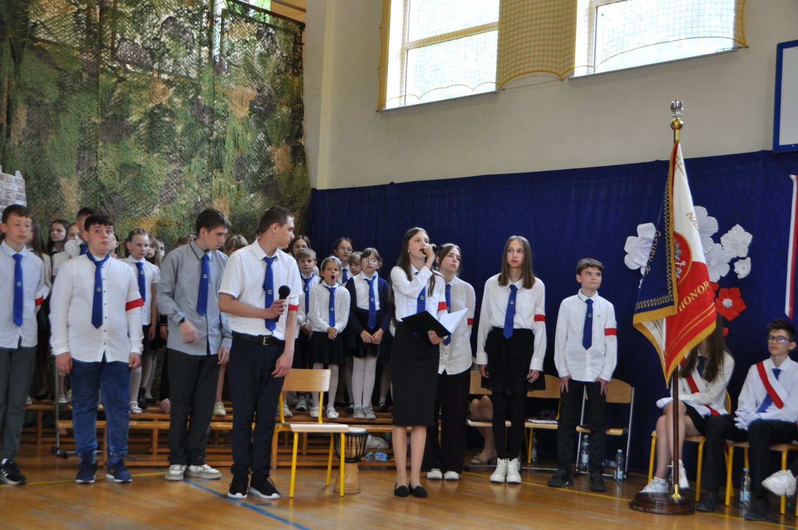 Dalszą uroczystość poprowadzili nauczyciele naszej szkoły p. Joanna Wczysła – Matysiuk i p. Bartłomiej Macherzyński. Sztandary zostały uroczyście wprowadzone w wojskowej asyście. Podczas tej uroczystości gościliśmy Poczty Sztandarowe: Szkoły Podstawowej im. Armii Krajowej Grupy Kampinos w Borzęcinie, Sztandar Armii Krajowej Grupy Kampinos oraz sztandar Naszej Szkoły. Następnie wszyscy zebrani zaśpiewali hymn Polski „Mazurka Dąbrowskiego”, po czym młodzież szkolna zaśpiewała hymn szkoły.
