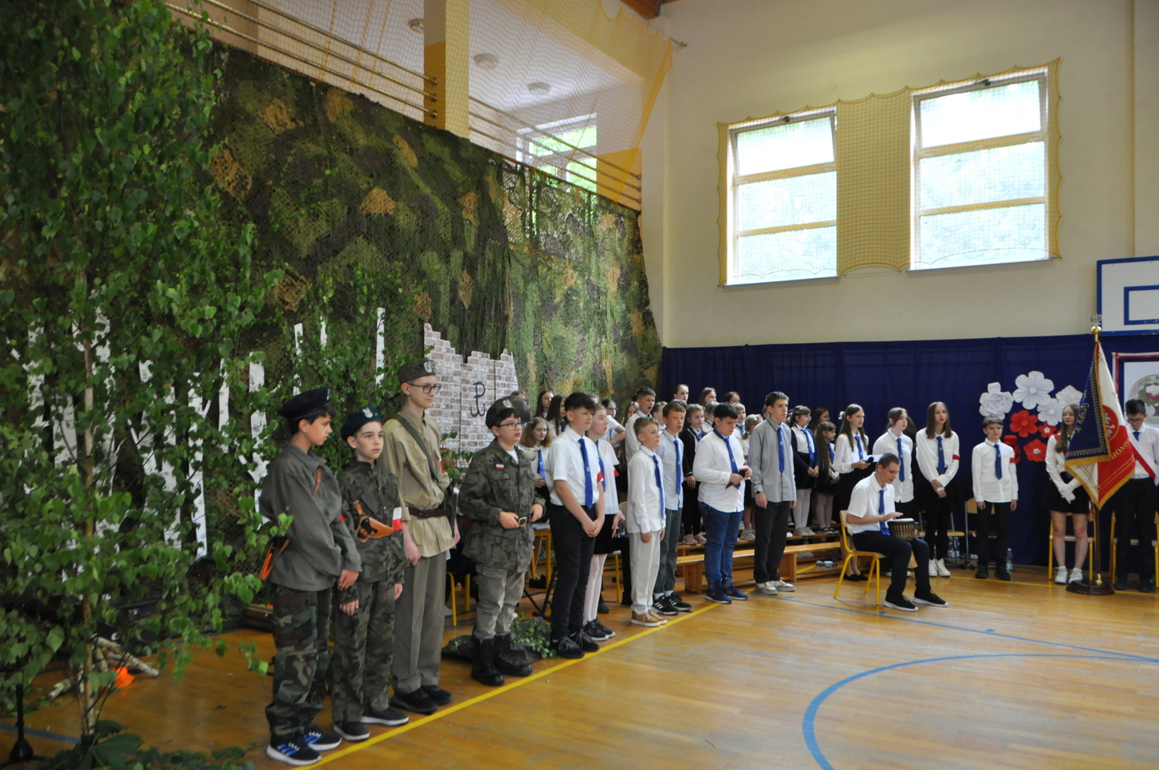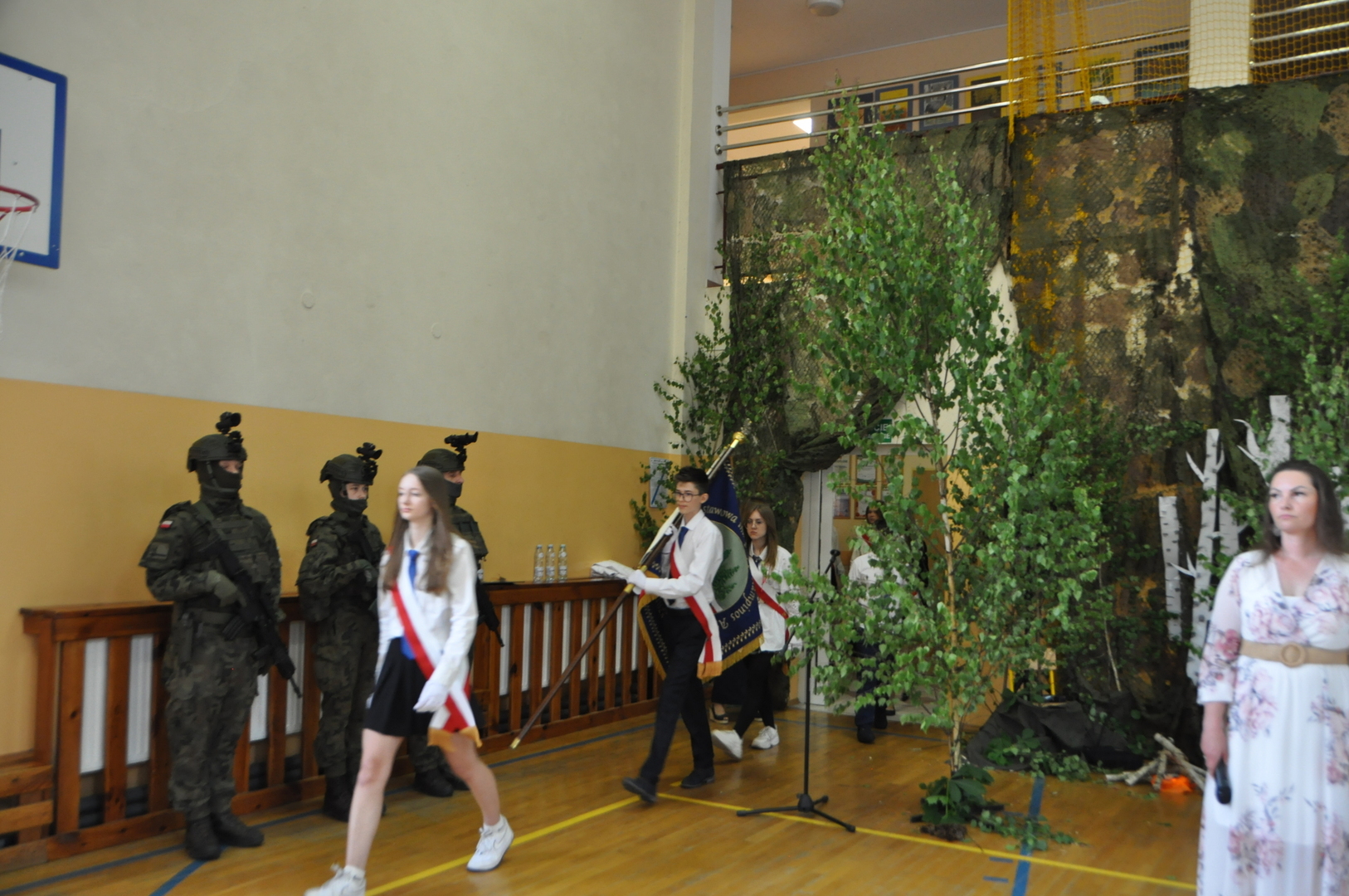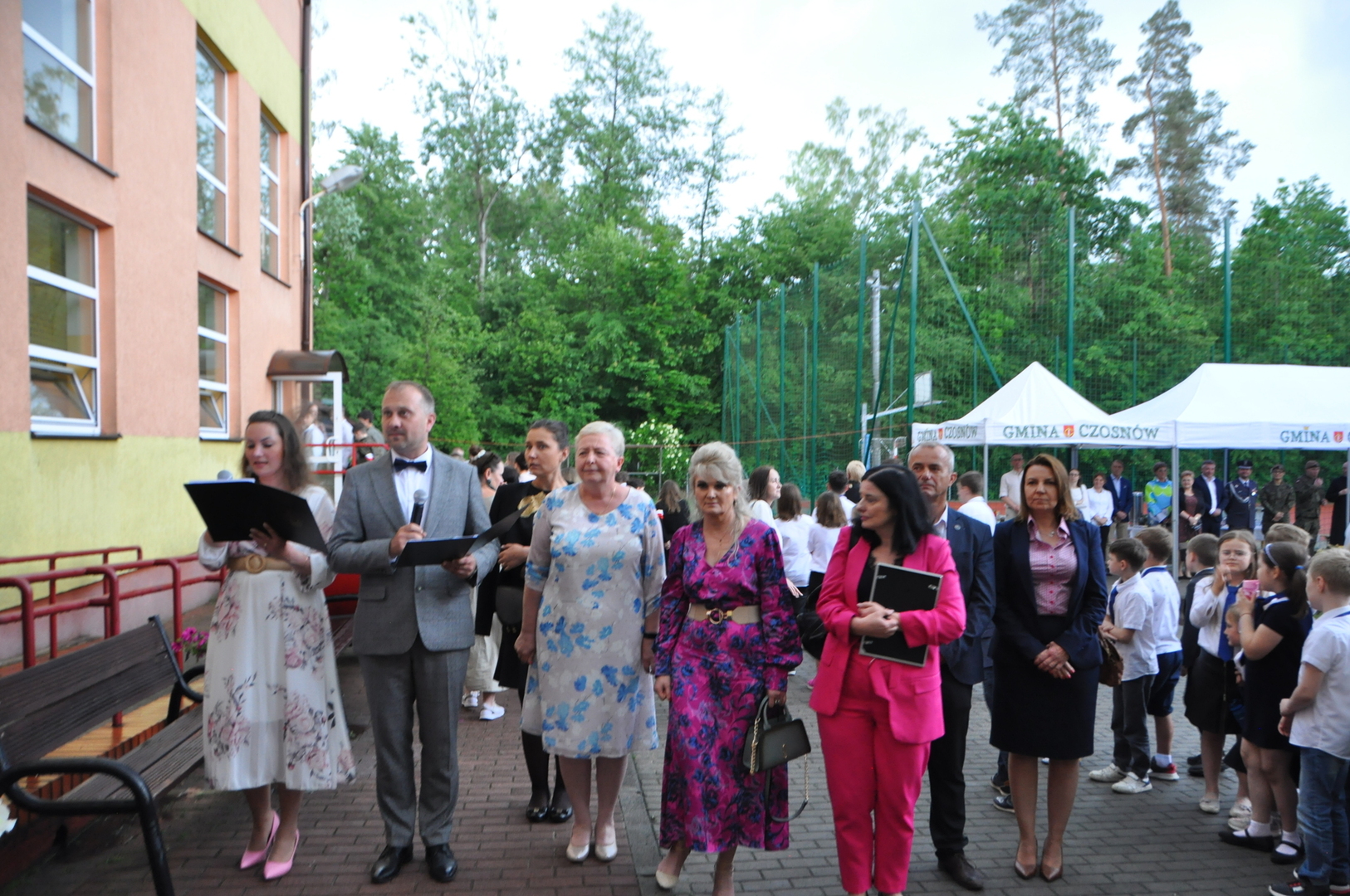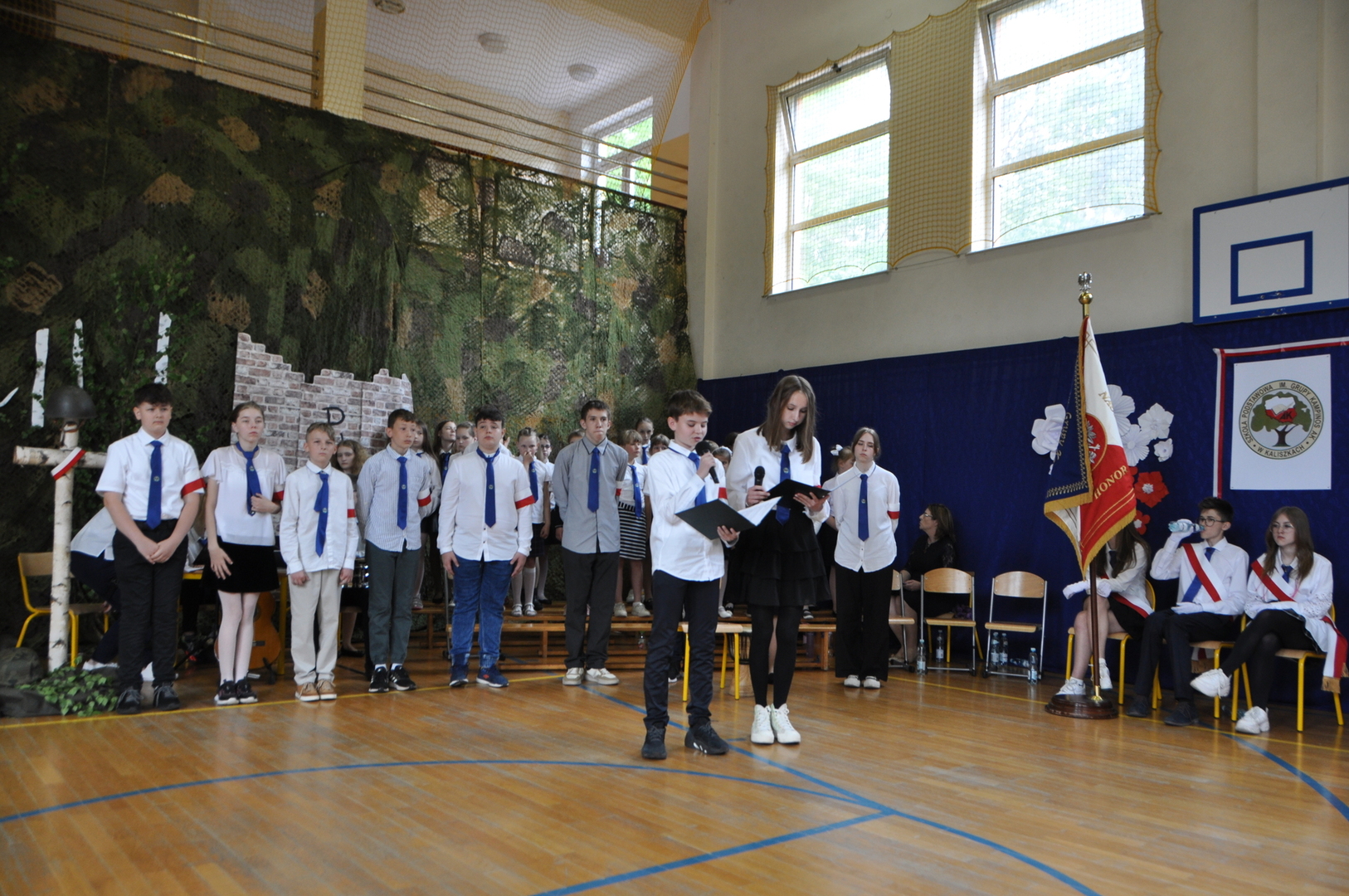 Dalszą uroczystość poprowadzili nauczyciele naszej szkoły p. Joanna Wczysła – Matysiuk i p. Bartłomiej Macherzyński. Sztandary zostały uroczyście wprowadzone w wojskowej asyście. Podczas tej uroczystości gościliśmy Poczty Sztandarowe: Szkoły Podstawowej im. Armii Krajowej Grupy Kampinos w Borzęcinie, Sztandar Armii Krajowej Grupy Kampinos oraz sztandar Naszej Szkoły. Następnie wszyscy zebrani zaśpiewali hymn Polski „Mazurka Dąbrowskiego”, po czym młodzież szkolna zaśpiewała hymn szkoły.