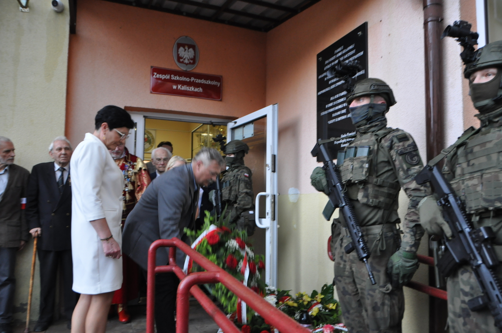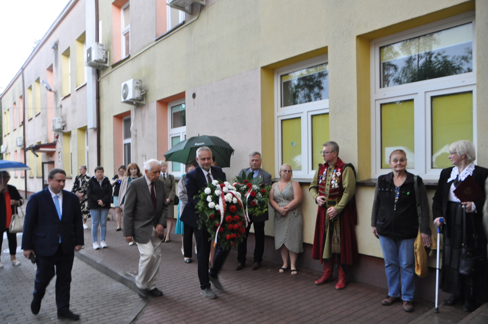 Prowadzący uroczystość p. Joanna Wczysła – Matysiuk i p. Bartłomiej Macherzyński zaprosili wszystkich zebranych do przejścia pod pamiątkową tablicę upamiętniającą wydarzenia sprzed 10 lat, gdzie minutą ciszy uczczono pamięć poległych i zmarłych żołnierzy Grupy Kampinos AK. Kombatant p. Witold Grzybowski w towarzystwie pani Dyrektor Anny Tarsały zapalił znicz miłości do Ojczyzny oraz delegacje złożyły wiązanki.