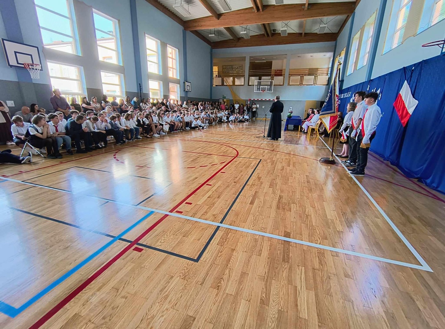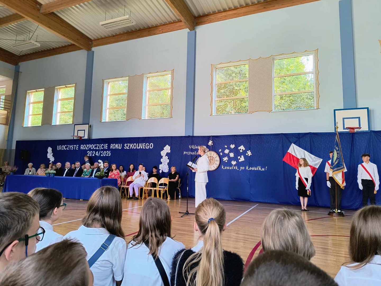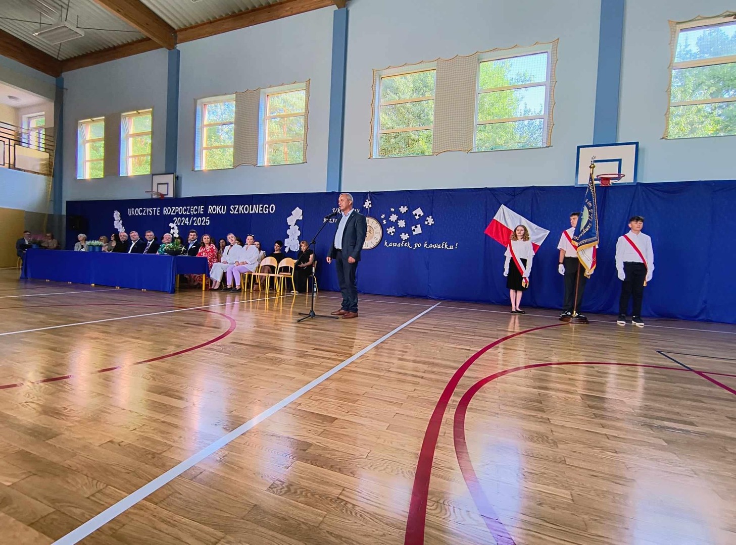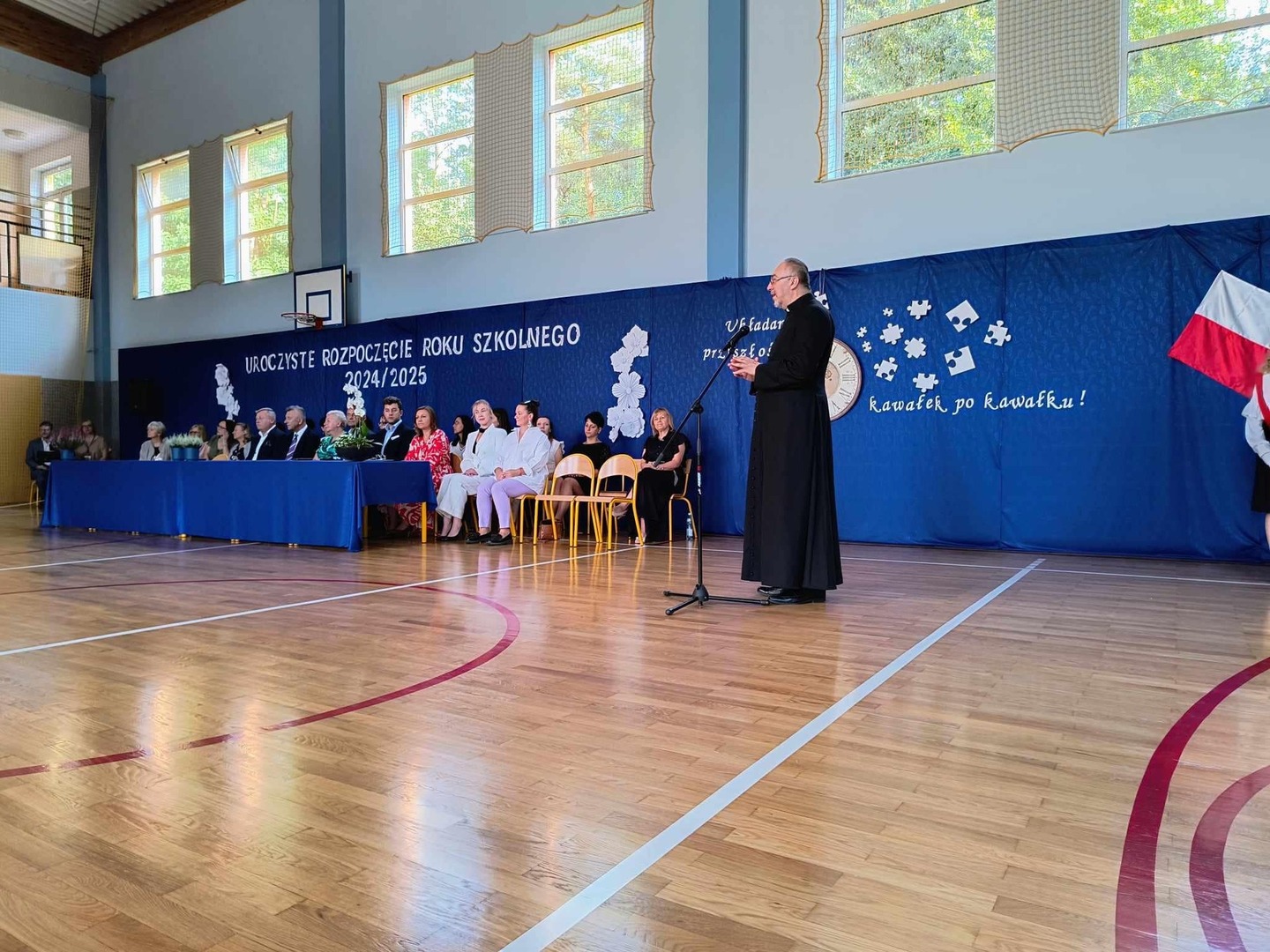 Ksiądz proboszcz Adam Bednarek, który był kolejnym mówcą, pobłogosławił zgromadzonych oraz życzył wszystkim uczniom, nauczycielom i rodzicom pomyślności i Bożego błogosławieństwa na nadchodzący rok szkolny. W swoim wystąpieniu nawiązał do wartości wspólnoty i wzajemnego wsparcia, które są kluczowe w codziennym życiu szkoły.