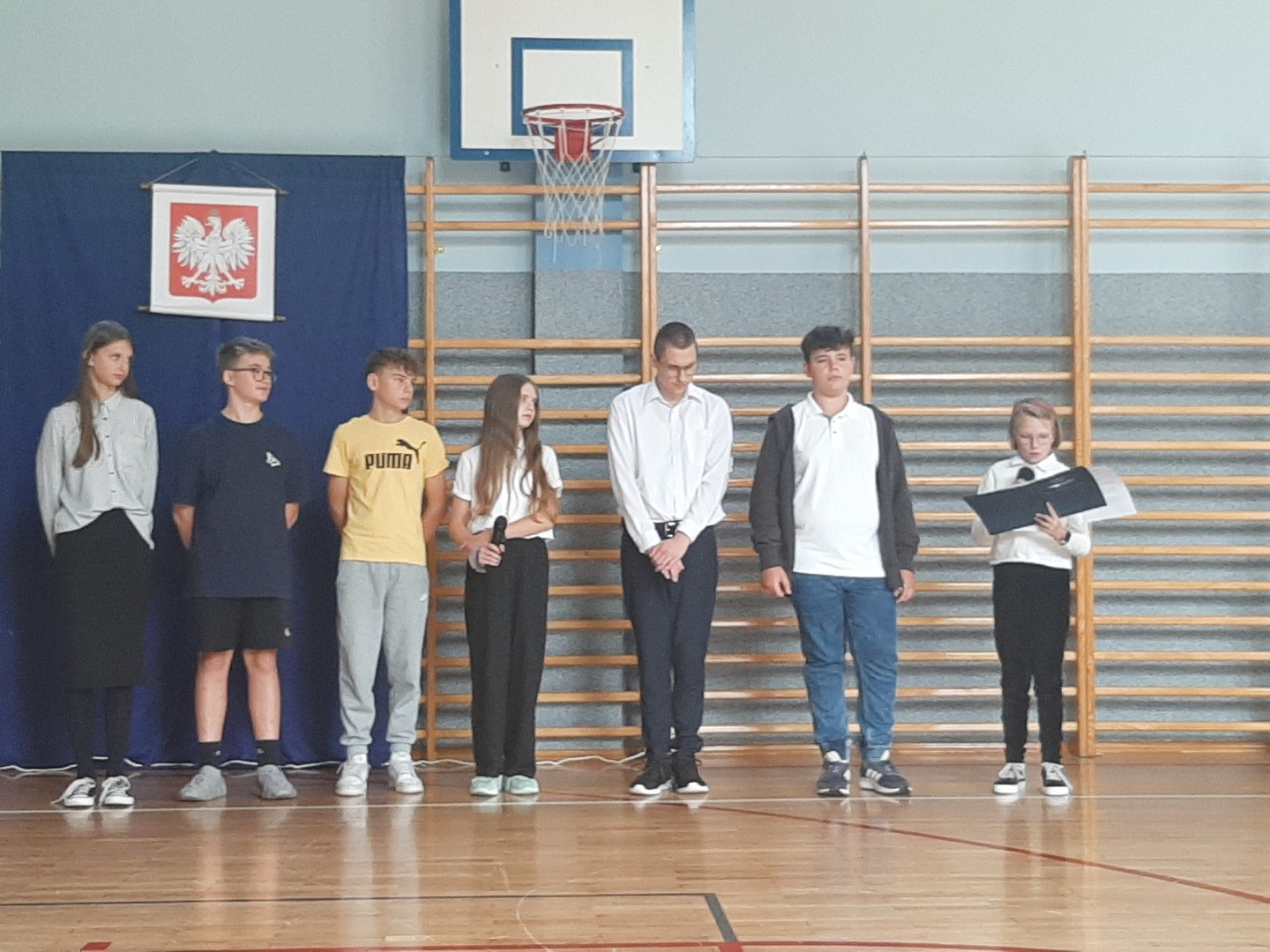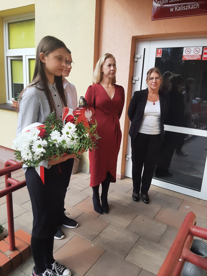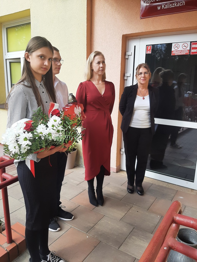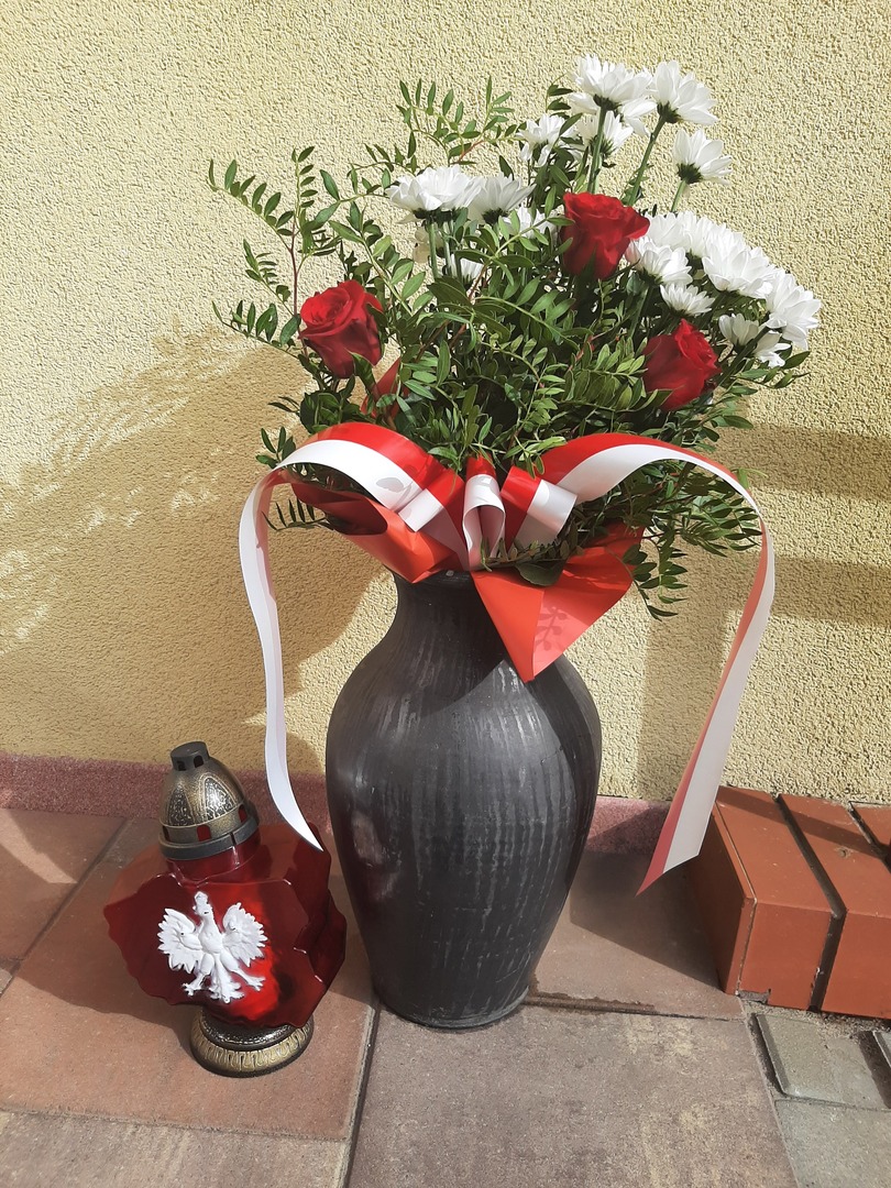 W imieniu całej społeczności szkolnej przedstawiciele starszych klas, razem z panią dyrektor Eweliną Siwek-Jagodzińską oraz panią Ewą Dudek zapalili znicz i złożyli kwiaty przed tablicą pamiątkową patrona naszej szkoły.