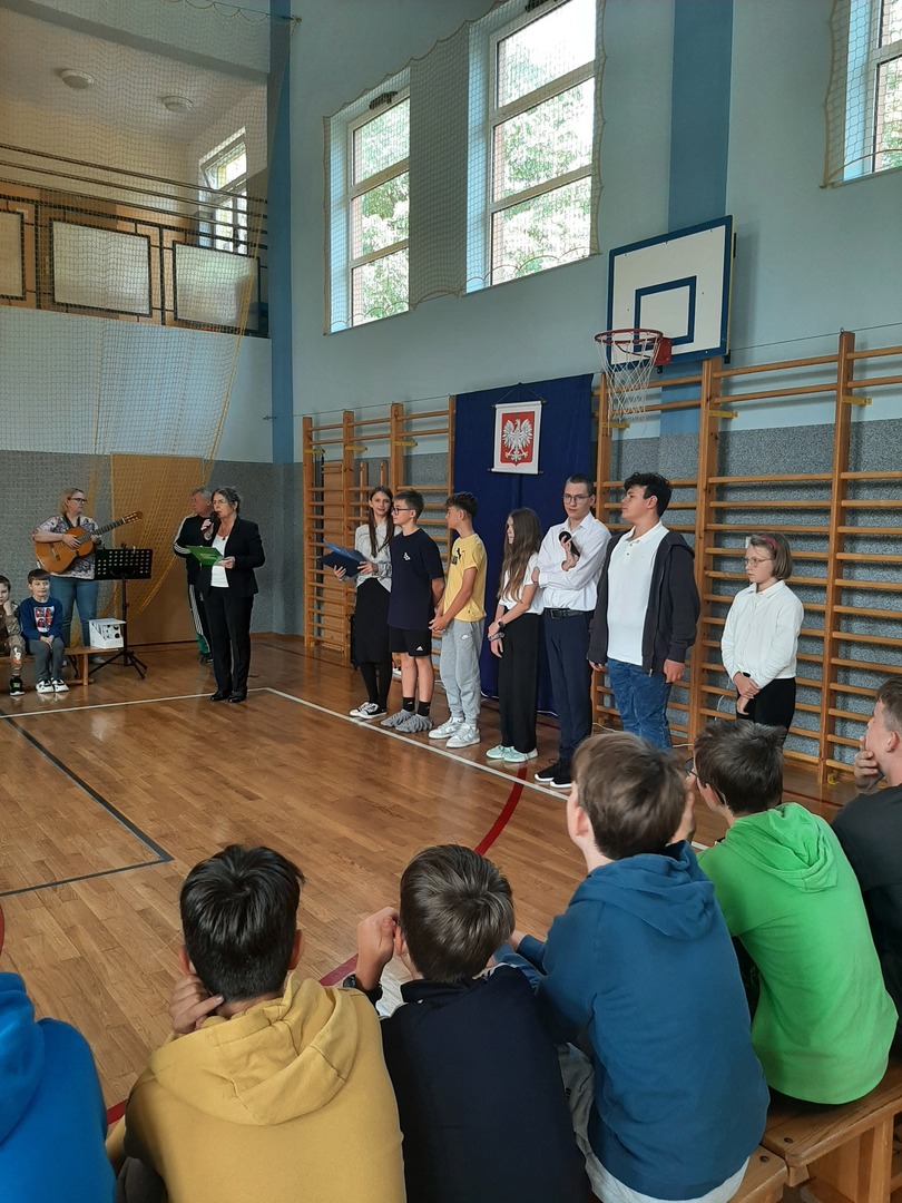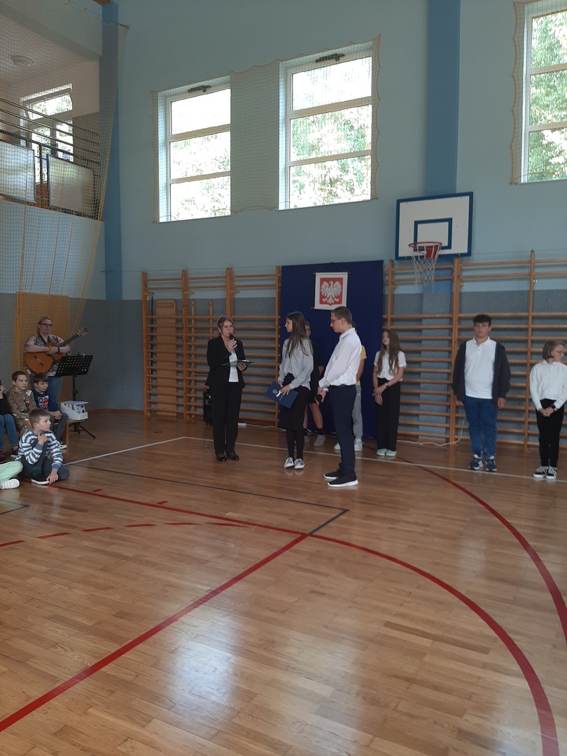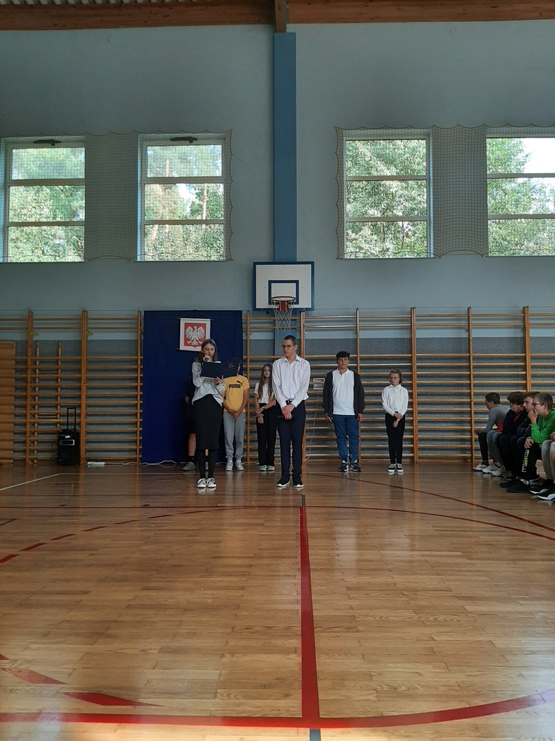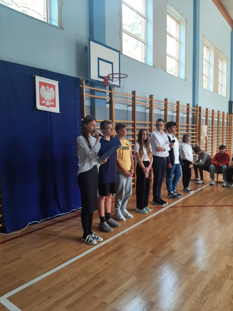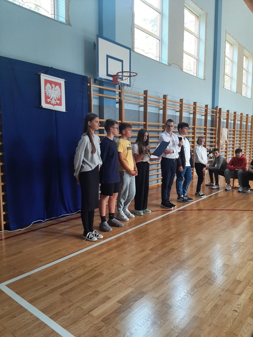 W imieniu całej społeczności szkolnej przedstawiciele starszych klas, razem z panią dyrektor Eweliną Siwek-Jagodzińską oraz panią Ewą Dudek zapalili znicz i złożyli kwiaty przed tablicą pamiątkową patrona naszej szkoły.