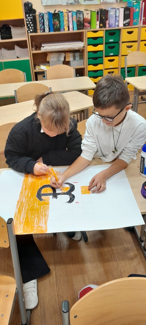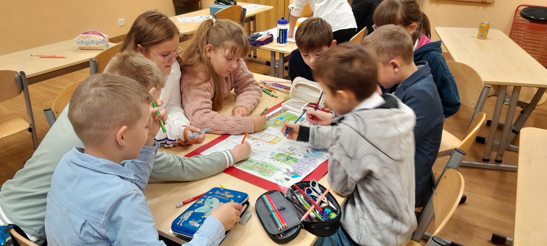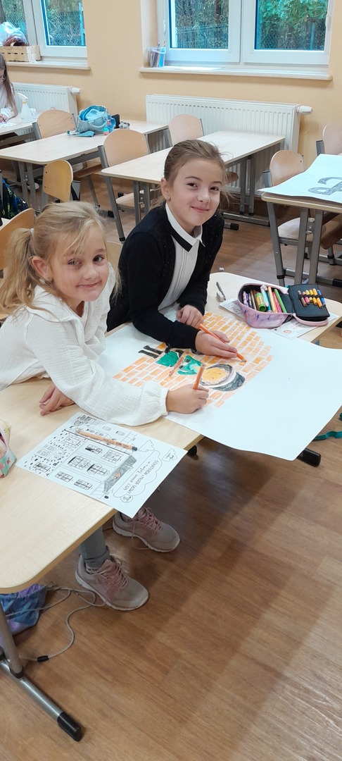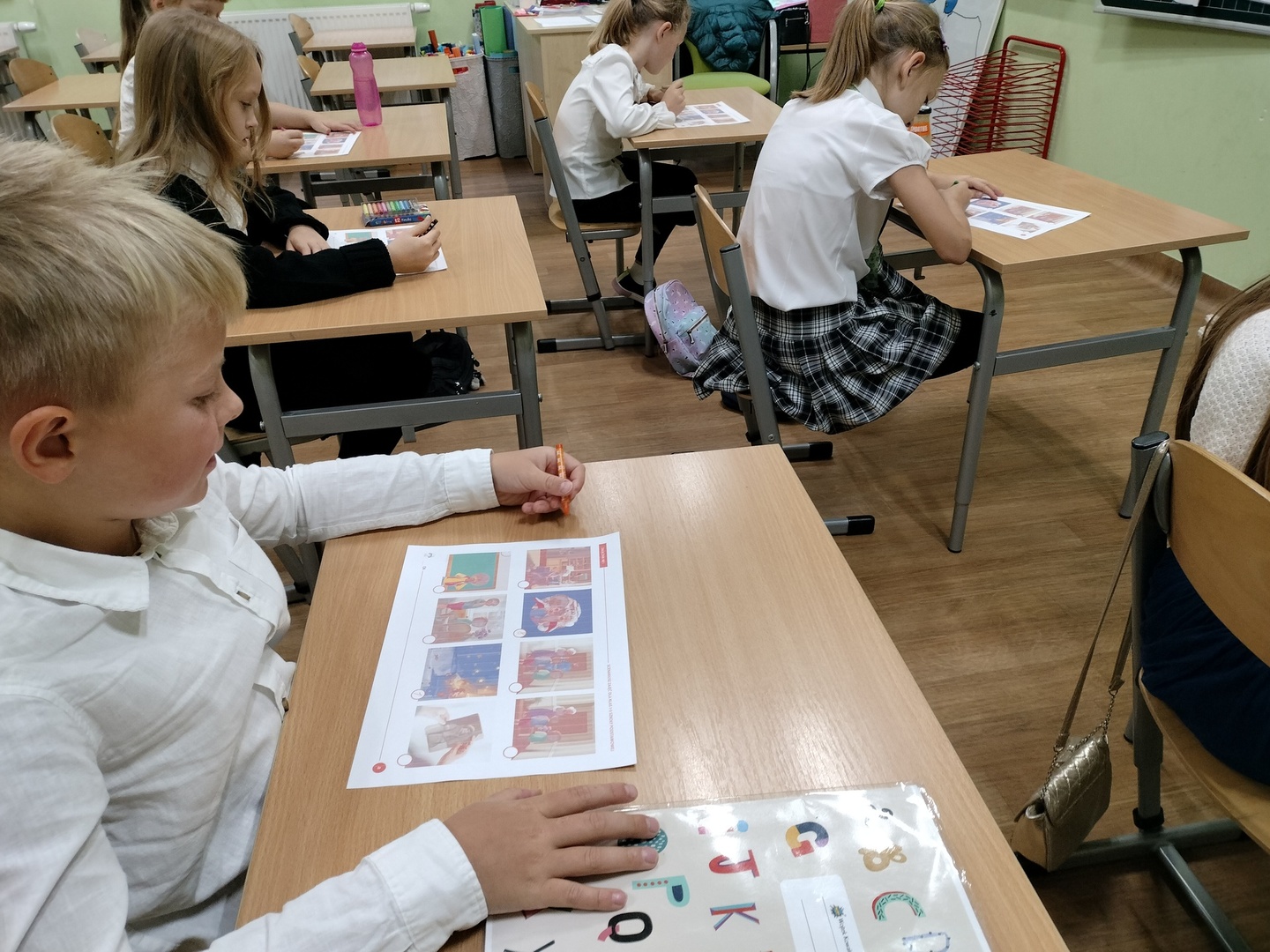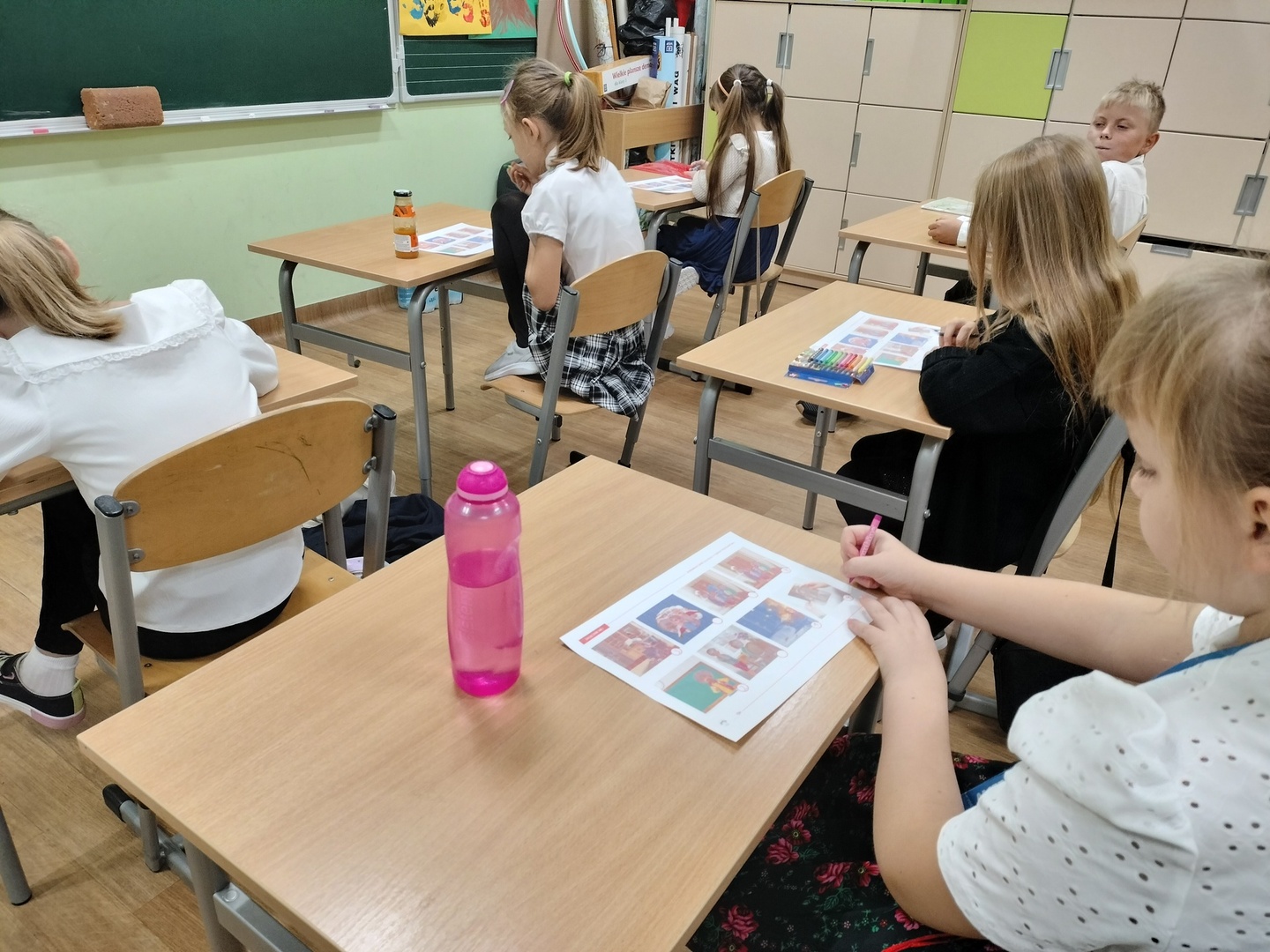 Następnie uczniowie malowali kolorowanki, z których powstał plakat „BohaterON w Twojej szkole 2024” przedstawiający kilkanaście sytuacji – przykładów zachowań dzieci i dorosłych, którzy kochają swój kraj i o niego dbają. Zwieńczeniem lekcji była zabawa w postaci ISKIERKI PRZYJAŹNI oraz wystawa plakatów.