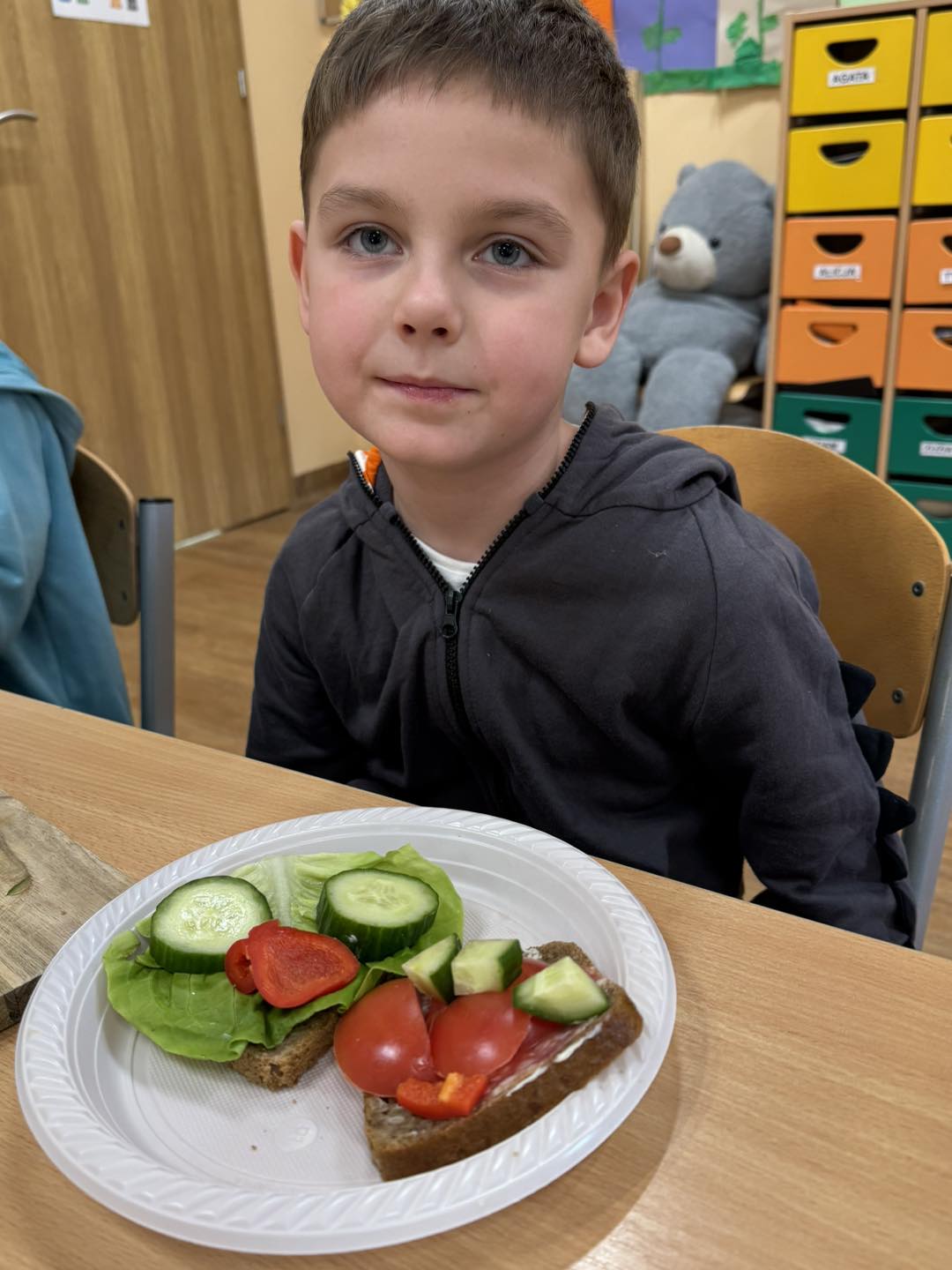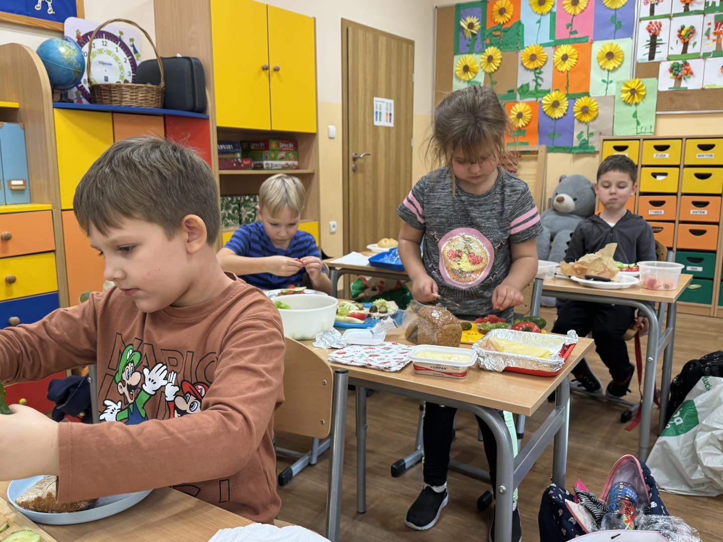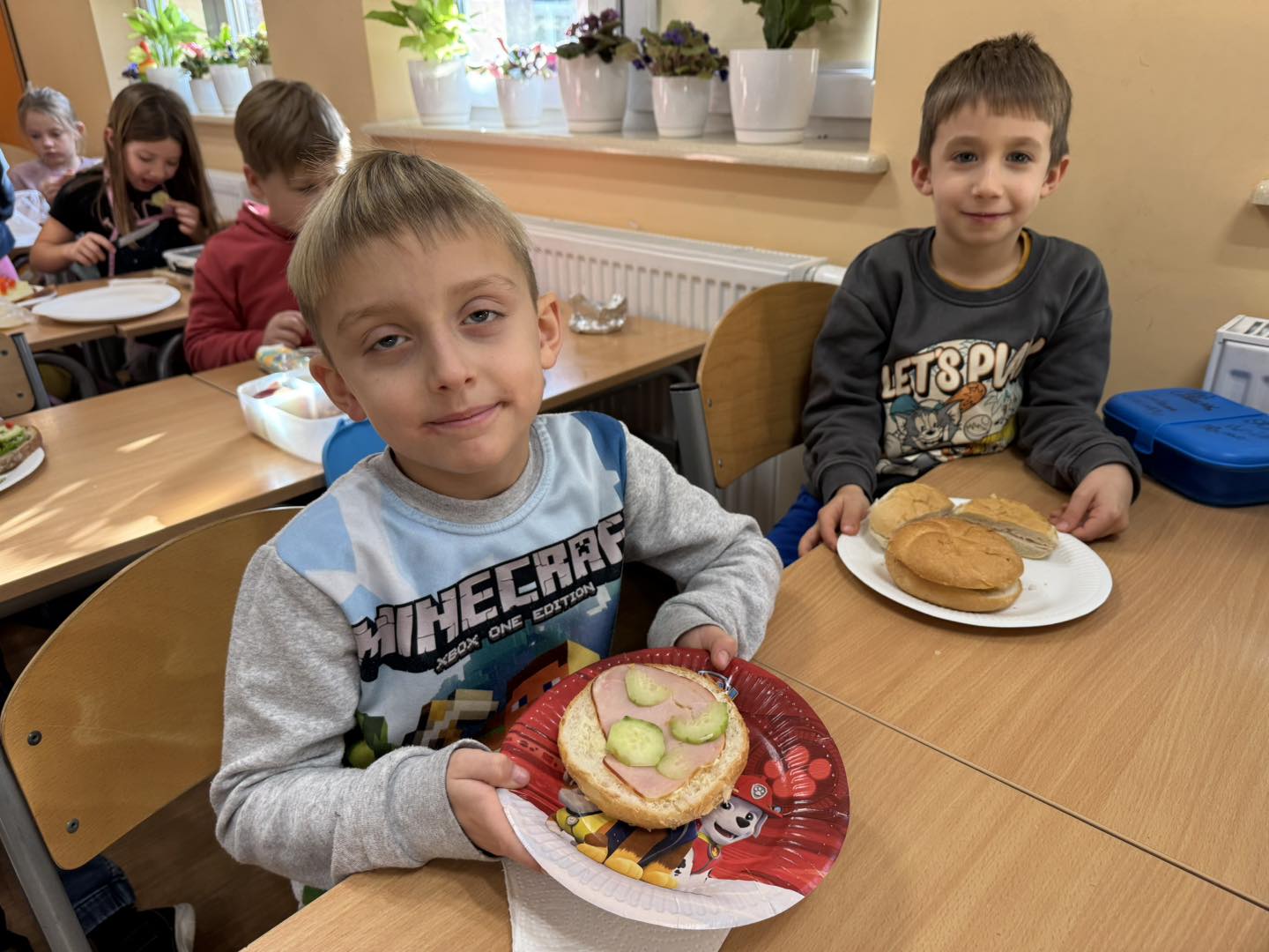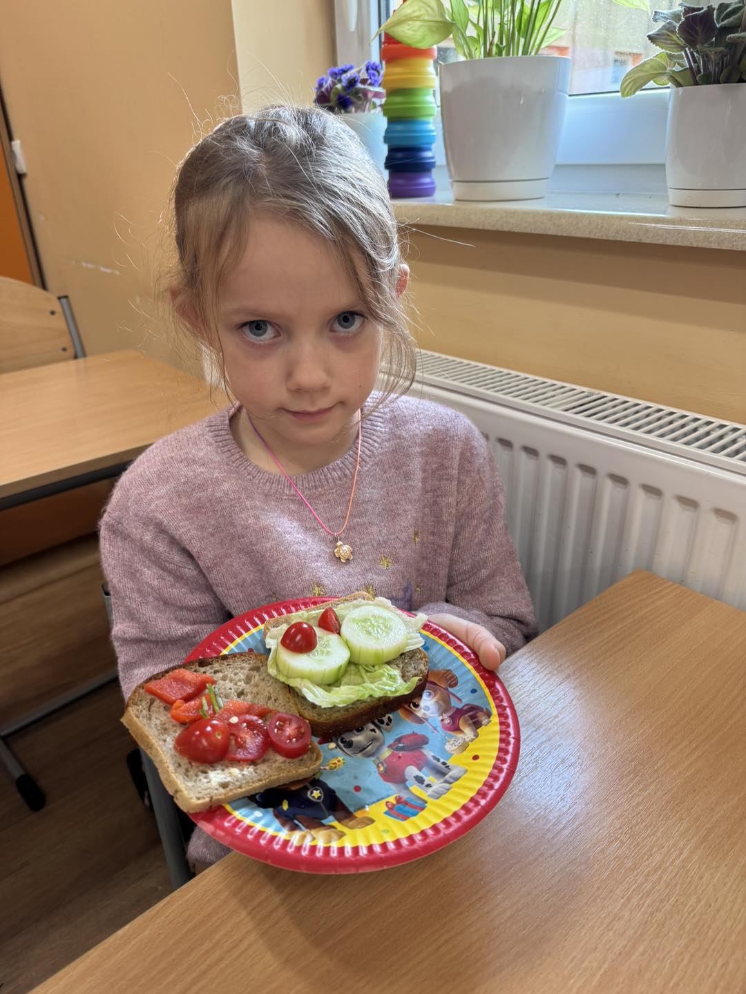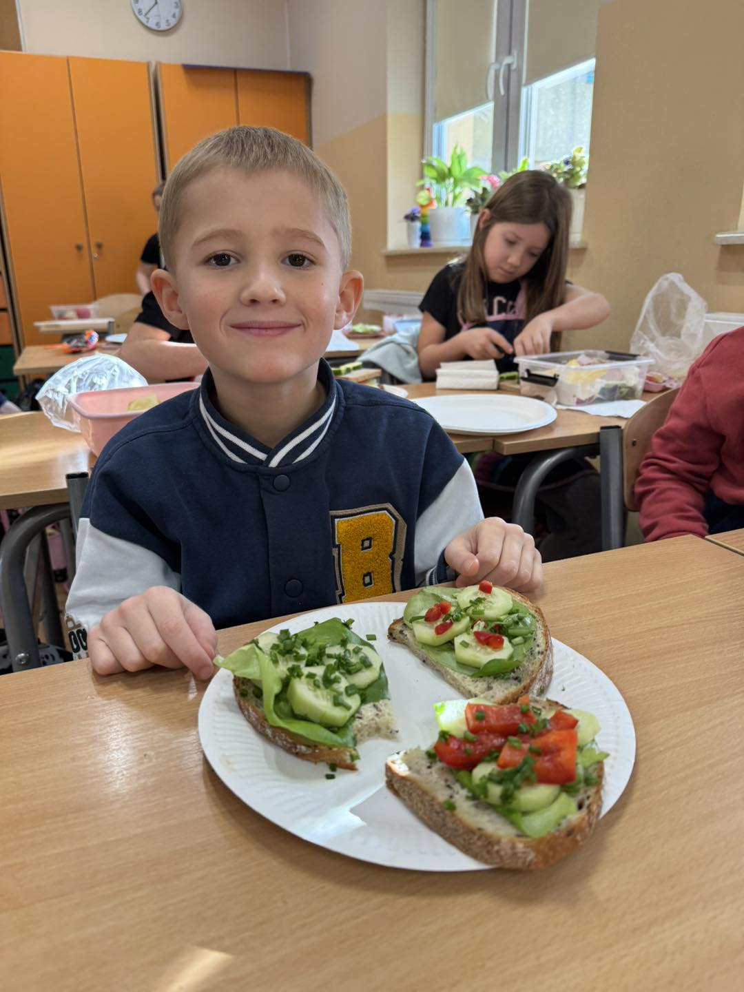 W osatnim czasie klasa 1 realizowała różne zadania zawarte w projekcie „ZDROWA ŚNIADANIÓWKA”. Pierwszaki rozpoczęły przygodę z edukacją prozdrowotną od zapoznania się z zasadami zdrowego odżywiania i aktywnego stylu życia na podstawie piramidy żywienia. Od teorii uczniowie przeszli do praktyki i samodzielnie przygotowali zdrowe, kolorowe kanapki. Wszystkie dzieci z zaangażowaniem dobierały składniki tak, aby każda kanapka wyglądała wyjątkowo. Na stołach królowały warzywa: i inne zdrowe produkty. Z pewnością samodzielnie wykonane potrawy smakują wyśmienicie. Kolejnym kreatywnym działaniem było stworzenie klasowej piramidy żywienia oraz aktywnego stylu życia. Uczniowie z ogromnym zapałem wypełniali kolejne piętra piramidy, wykorzystując do tego wycięte z gazet obrazki produktów żywnościowych. Pamiętali również o ważnych elementach zdrowego stylu życia takich, jak: aktywność fizyczna, picie wody, higiena osobista oraz sen. Nauka poprzez zabawę to najbardziej efektywny sposób przyswajania wiedzy!
