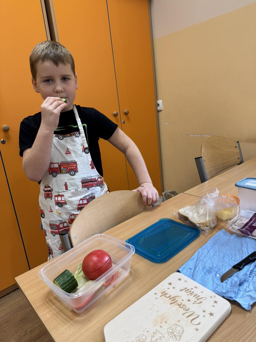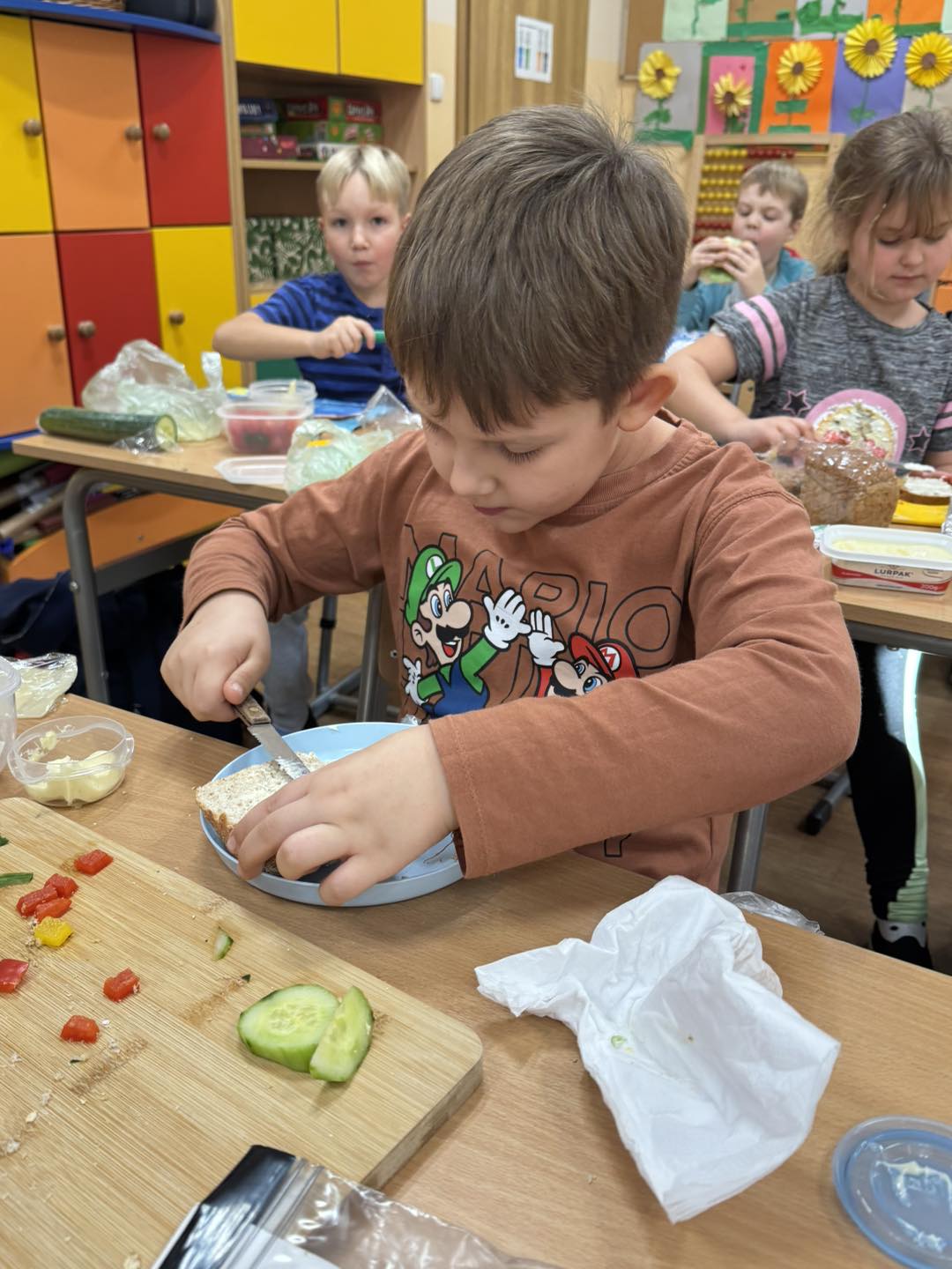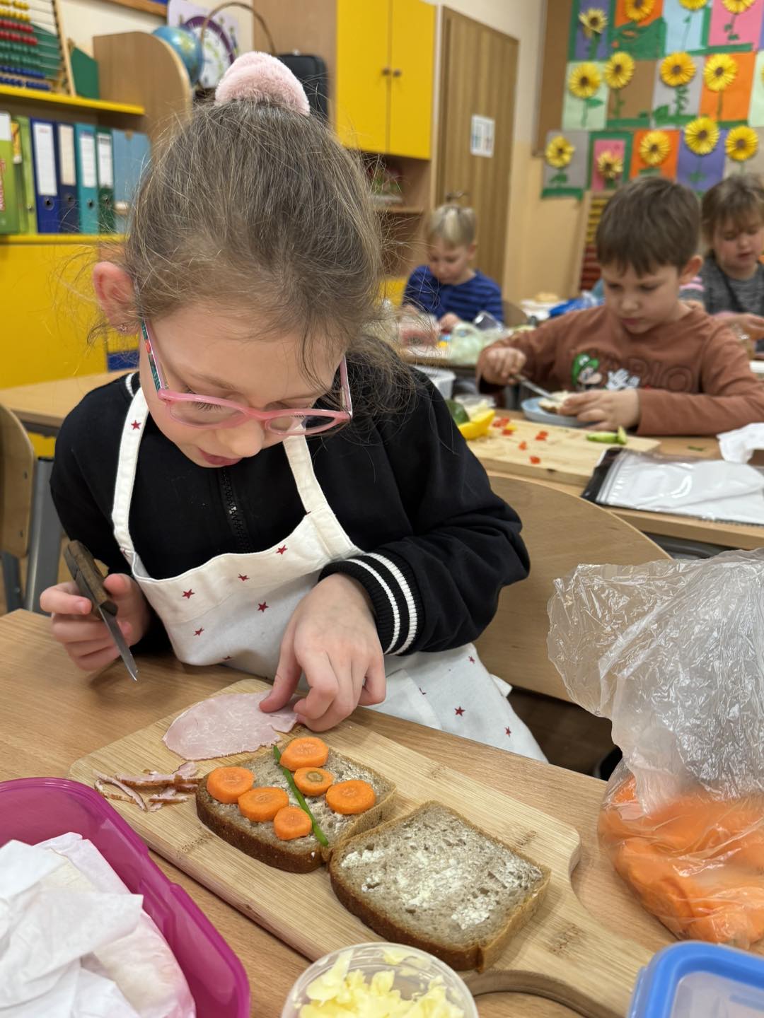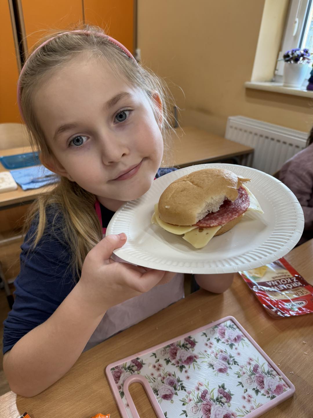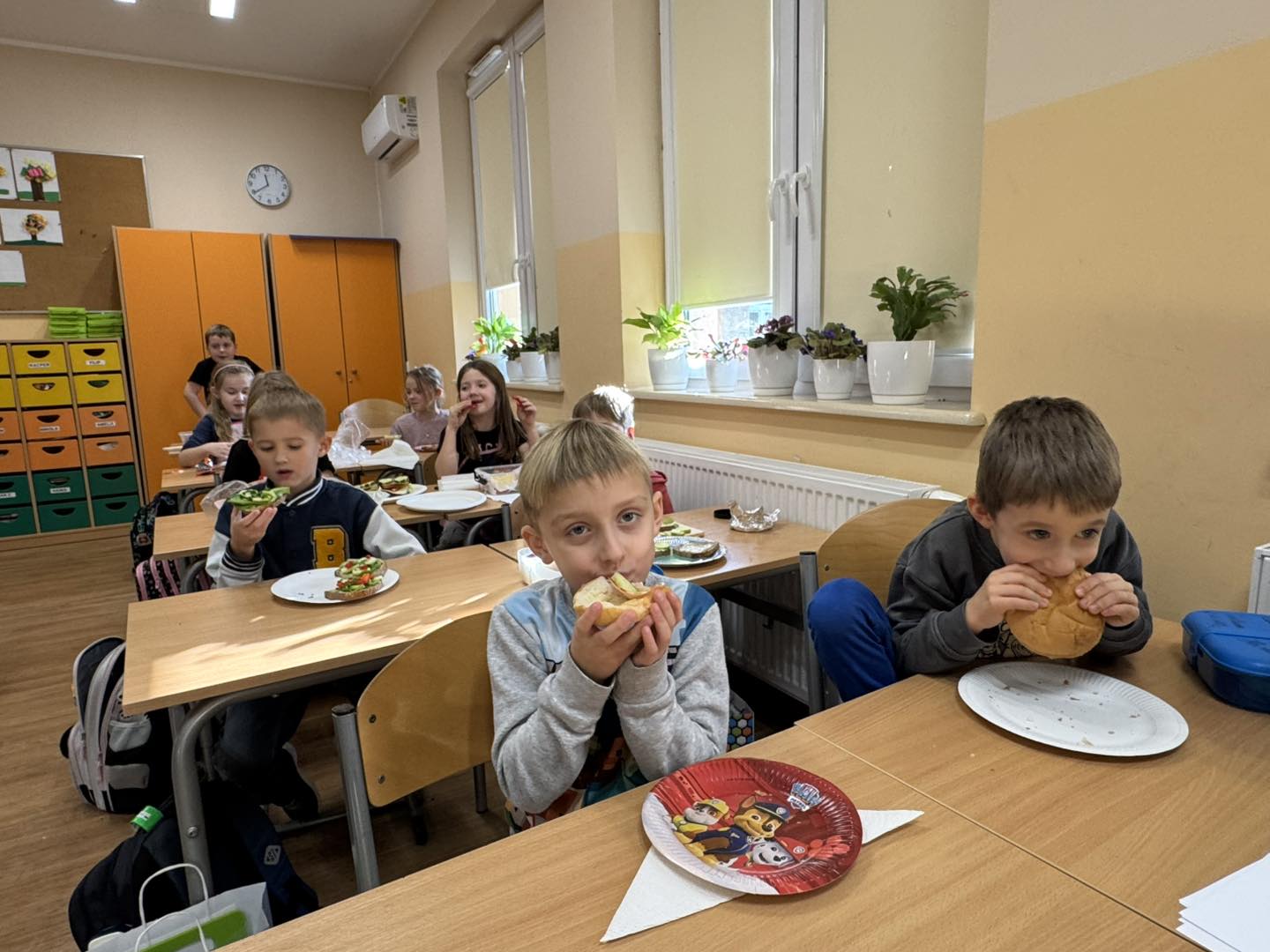 W osatnim czasie klasa 1 realizowała różne zadania zawarte w projekcie „ZDROWA ŚNIADANIÓWKA”. Pierwszaki rozpoczęły przygodę z edukacją prozdrowotną od zapoznania się z zasadami zdrowego odżywiania i aktywnego stylu życia na podstawie piramidy żywienia. Od teorii uczniowie przeszli do praktyki i samodzielnie przygotowali zdrowe, kolorowe kanapki. Wszystkie dzieci z zaangażowaniem dobierały składniki tak, aby każda kanapka wyglądała wyjątkowo. Na stołach królowały warzywa: i inne zdrowe produkty. Z pewnością samodzielnie wykonane potrawy smakują wyśmienicie. Kolejnym kreatywnym działaniem było stworzenie klasowej piramidy żywienia oraz aktywnego stylu życia. Uczniowie z ogromnym zapałem wypełniali kolejne piętra piramidy, wykorzystując do tego wycięte z gazet obrazki produktów żywnościowych. Pamiętali również o ważnych elementach zdrowego stylu życia takich, jak: aktywność fizyczna, picie wody, higiena osobista oraz sen. Nauka poprzez zabawę to najbardziej efektywny sposób przyswajania wiedzy!