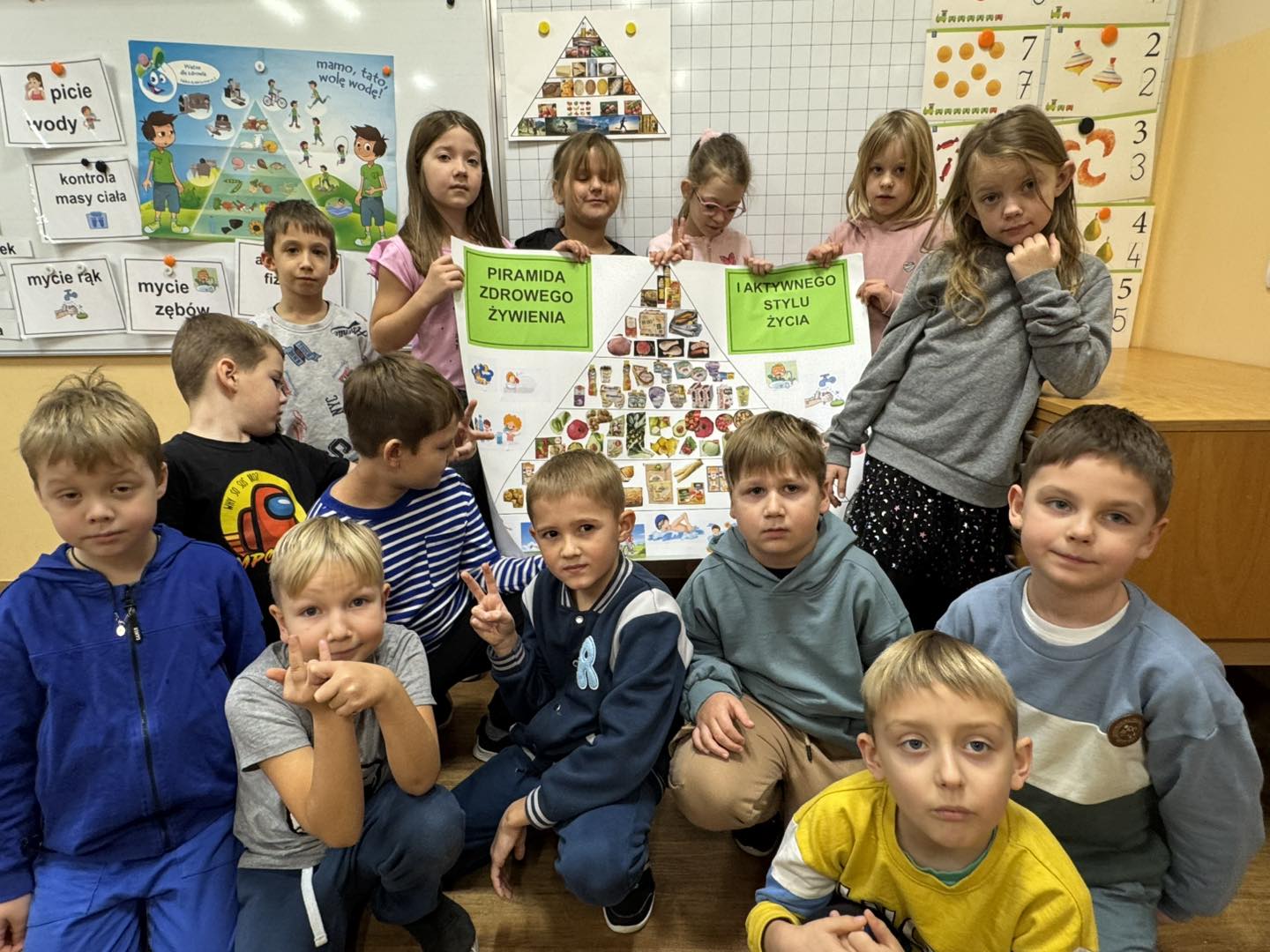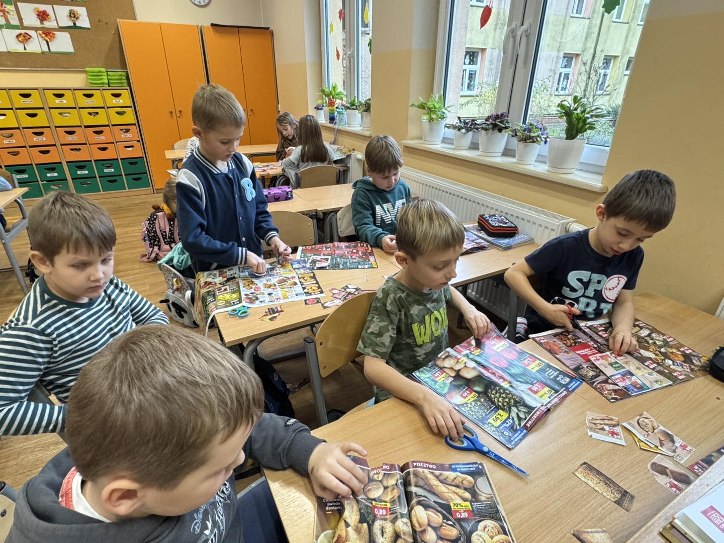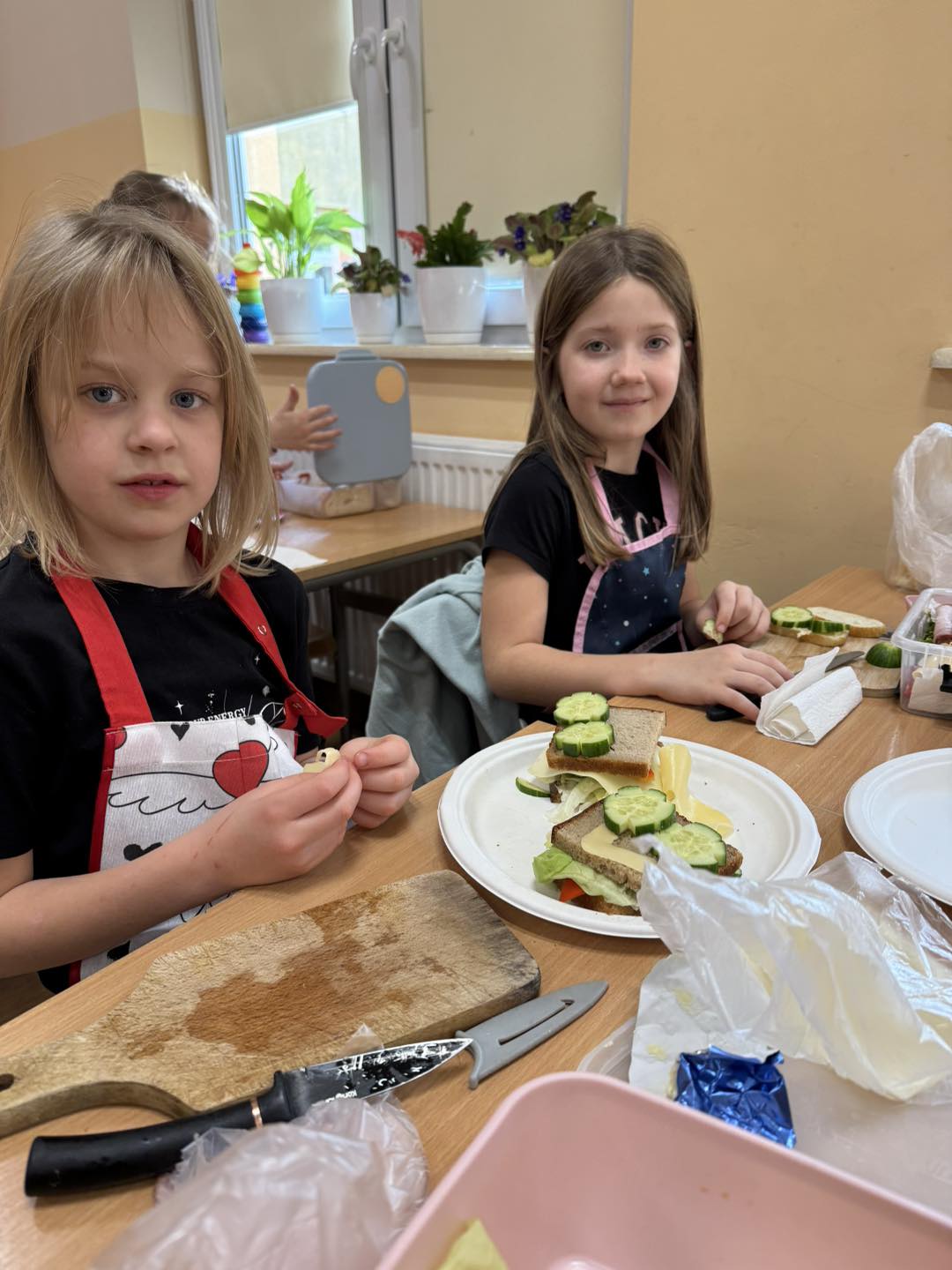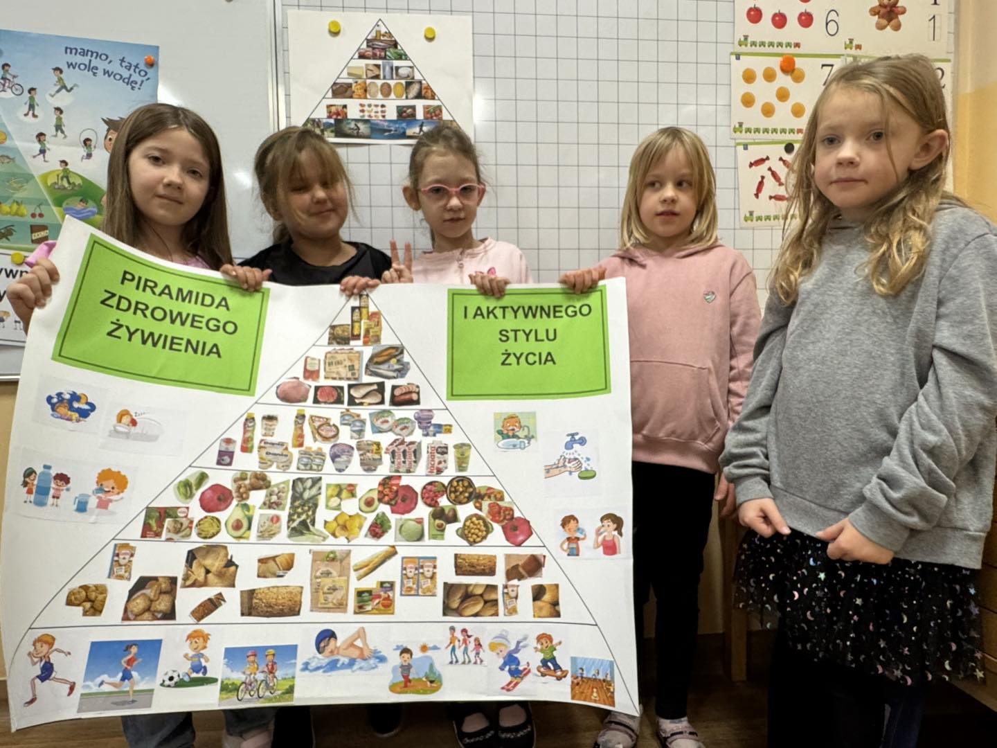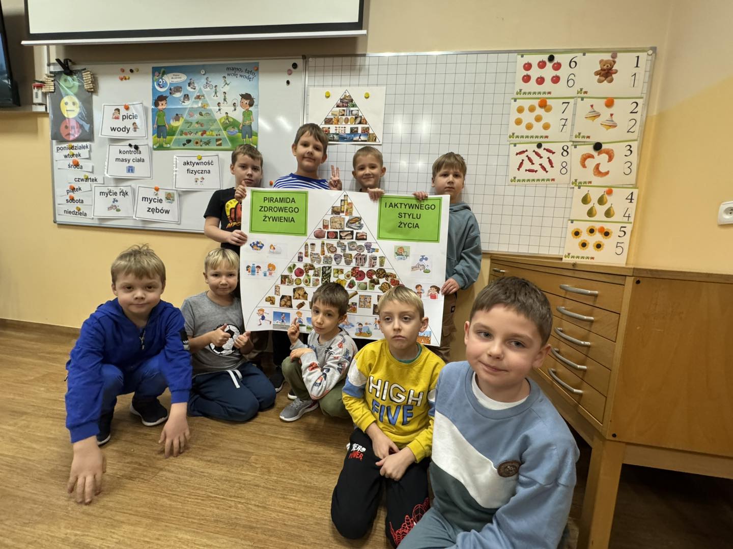 W osatnim czasie klasa 1 realizowała różne zadania zawarte w projekcie „ZDROWA ŚNIADANIÓWKA”. Pierwszaki rozpoczęły przygodę z edukacją prozdrowotną od zapoznania się z zasadami zdrowego odżywiania i aktywnego stylu życia na podstawie piramidy żywienia. Od teorii uczniowie przeszli do praktyki i samodzielnie przygotowali zdrowe, kolorowe kanapki. Wszystkie dzieci z zaangażowaniem dobierały składniki tak, aby każda kanapka wyglądała wyjątkowo. Na stołach królowały warzywa: i inne zdrowe produkty. Z pewnością samodzielnie wykonane potrawy smakują wyśmienicie. Kolejnym kreatywnym działaniem było stworzenie klasowej piramidy żywienia oraz aktywnego stylu życia. Uczniowie z ogromnym zapałem wypełniali kolejne piętra piramidy, wykorzystując do tego wycięte z gazet obrazki produktów żywnościowych. Pamiętali również o ważnych elementach zdrowego stylu życia takich, jak: aktywność fizyczna, picie wody, higiena osobista oraz sen. Nauka poprzez zabawę to najbardziej efektywny sposób przyswajania wiedzy!