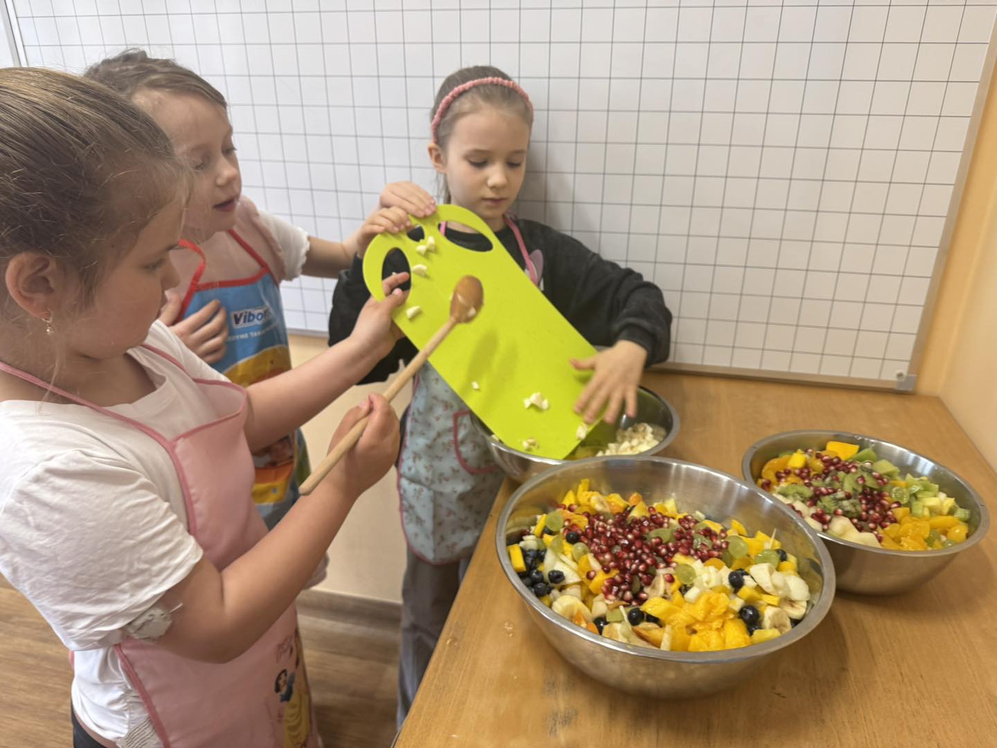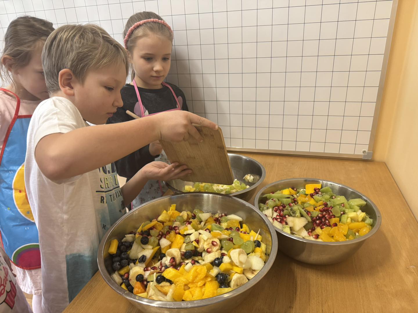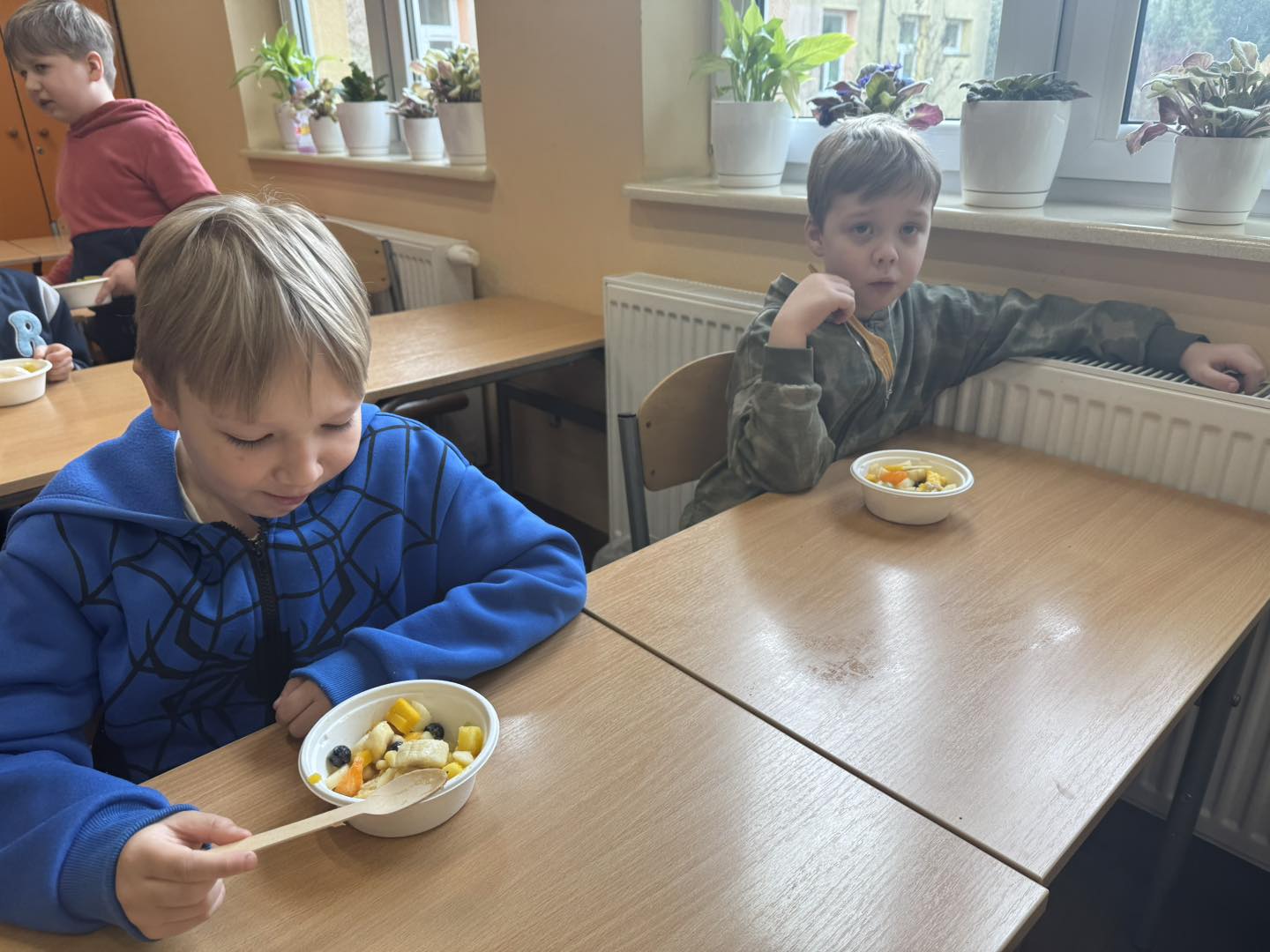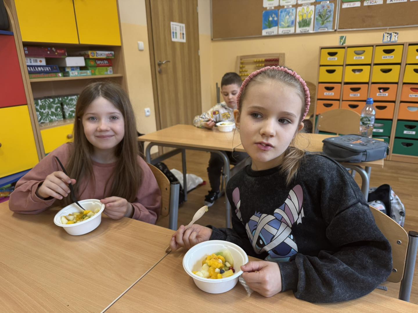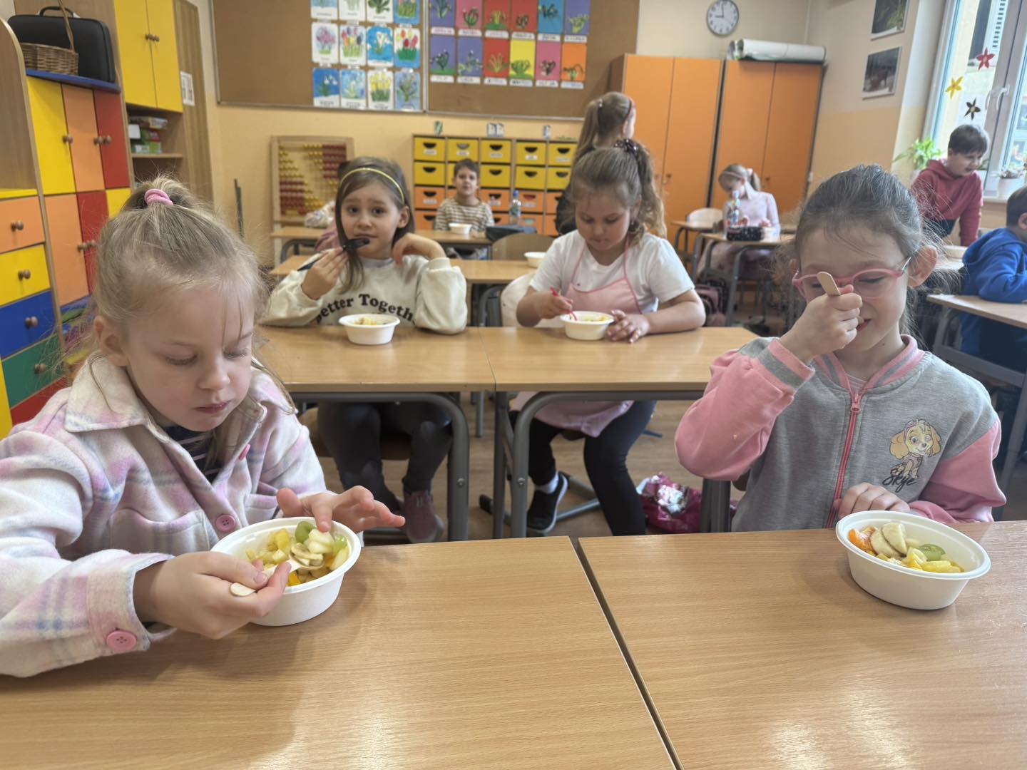 Klasa 1 przygotowała samodzielnie witaminowy zawrót głowy na drugie śniadanie - sałatkę owocową. Uczniowie z zaangażowaniem obierali, kroili, wkładali do miski oraz mieszali różnego rodzaju owoce. Najprzyjemniejszym momentem była oczywiście degustacja pysznej, zdrowej i kolorowej sałatki.
