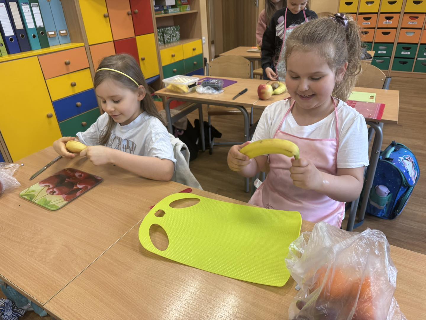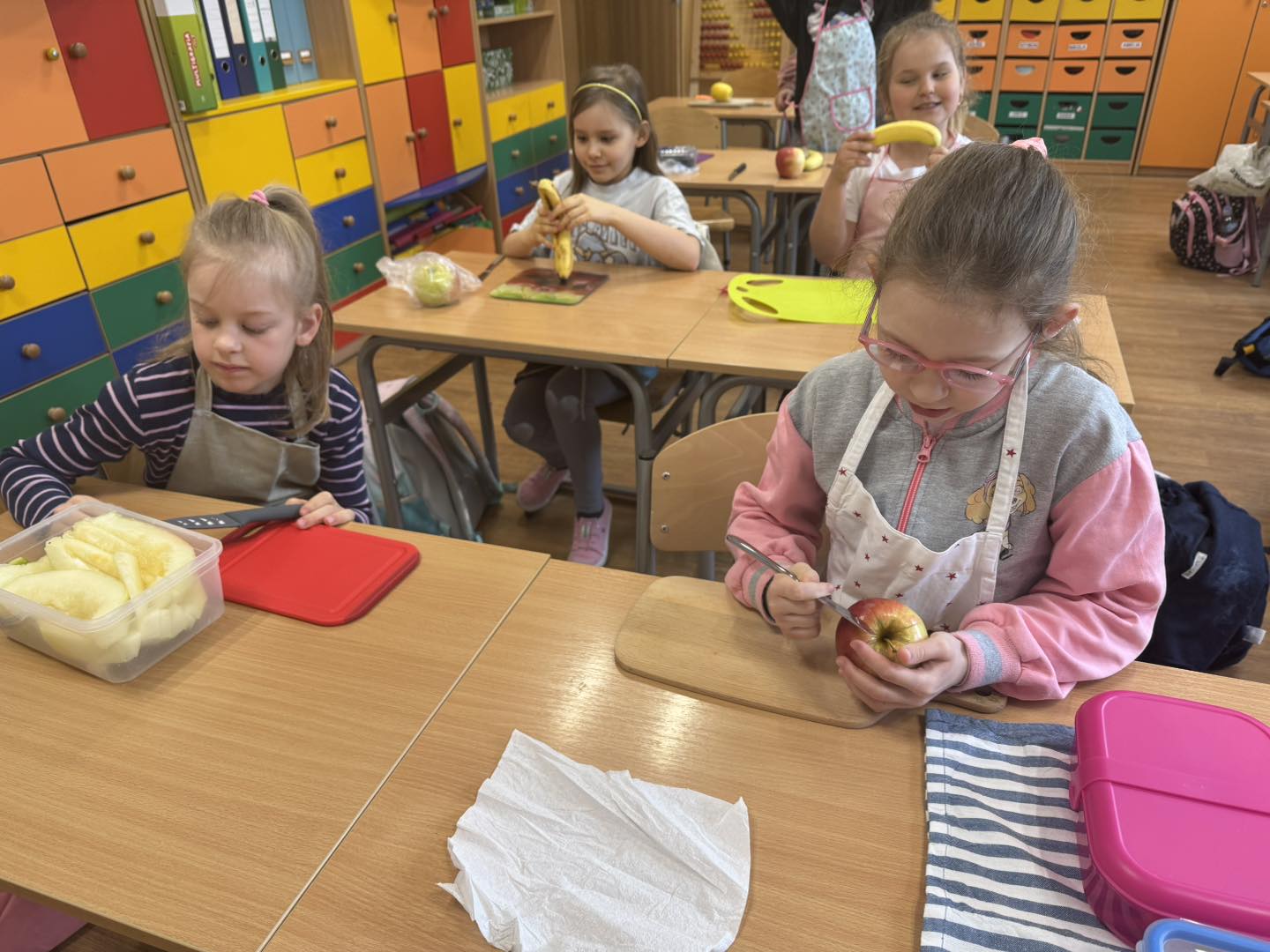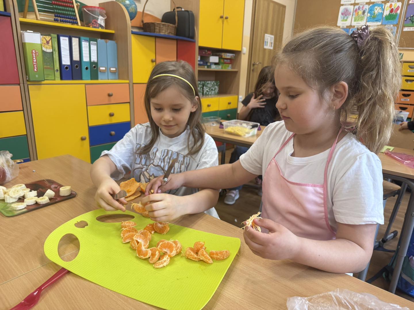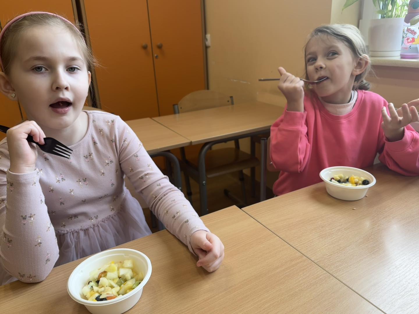 Klasa 1 przygotowała samodzielnie witaminowy zawrót głowy na drugie śniadanie - sałatkę owocową. Uczniowie z zaangażowaniem obierali, kroili, wkładali do miski oraz mieszali różnego rodzaju owoce. Najprzyjemniejszym momentem była oczywiście degustacja pysznej, zdrowej i kolorowej sałatki.
