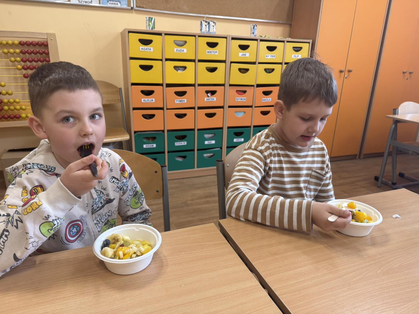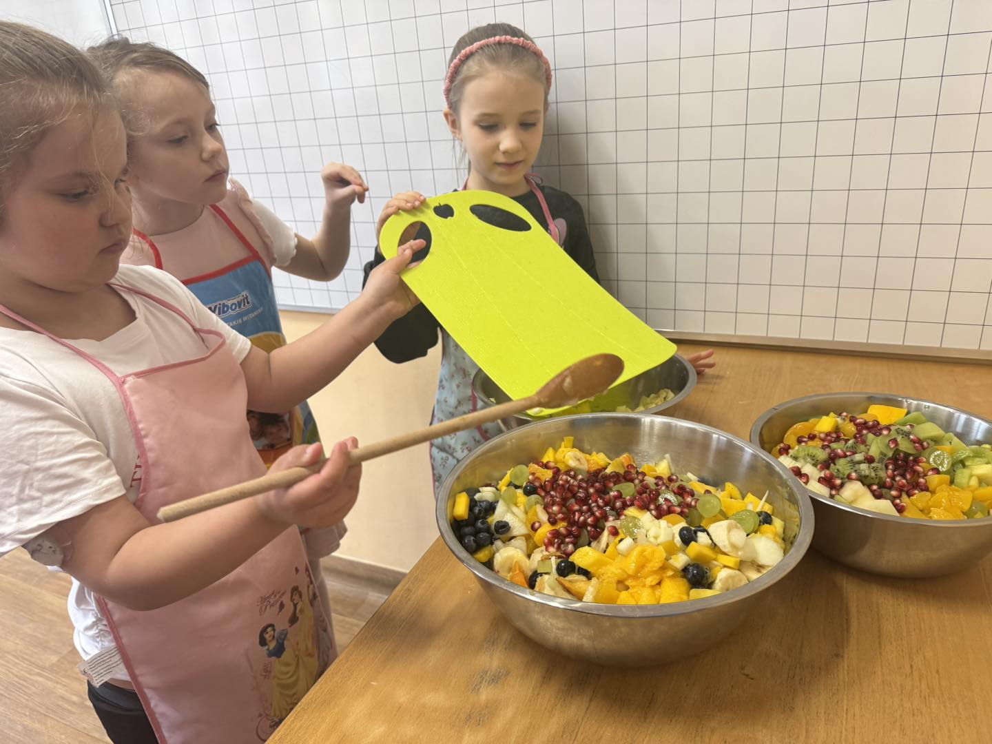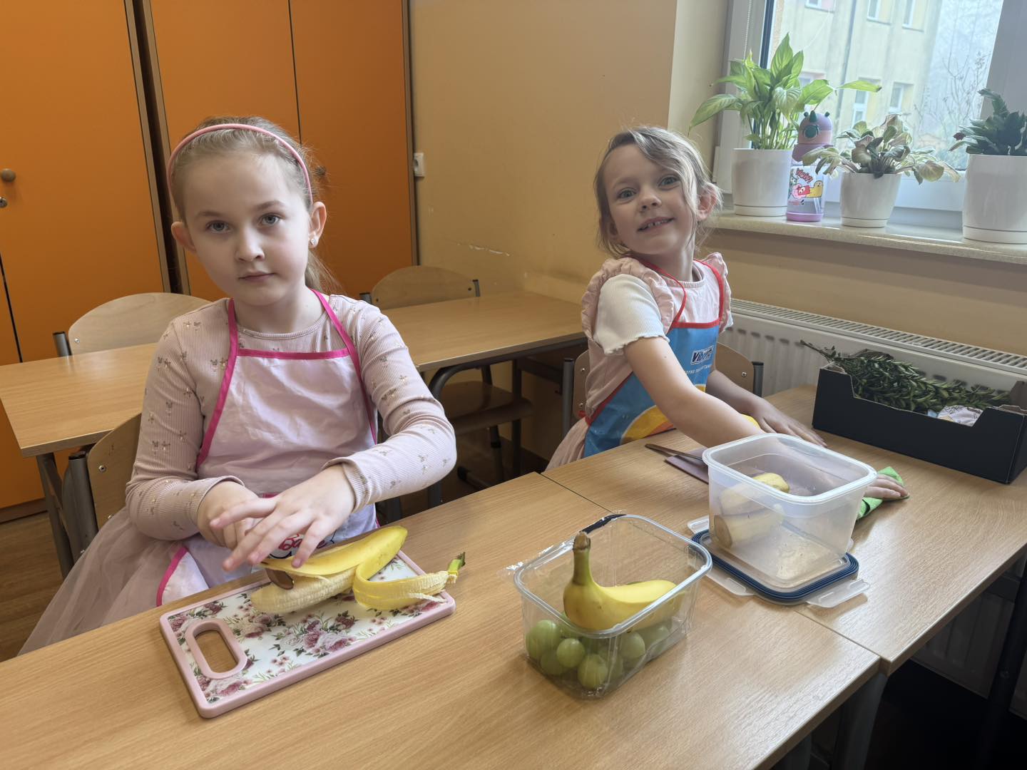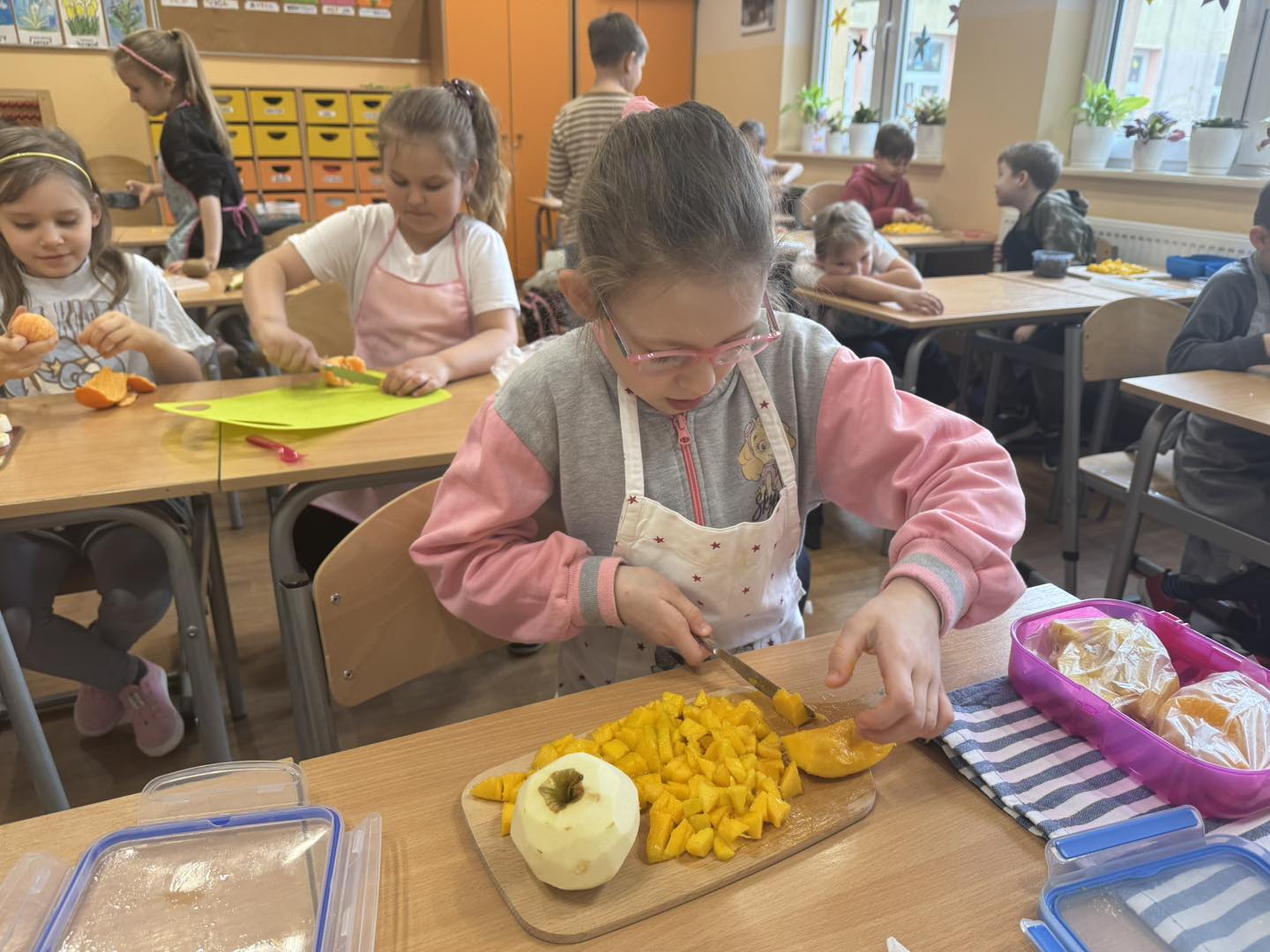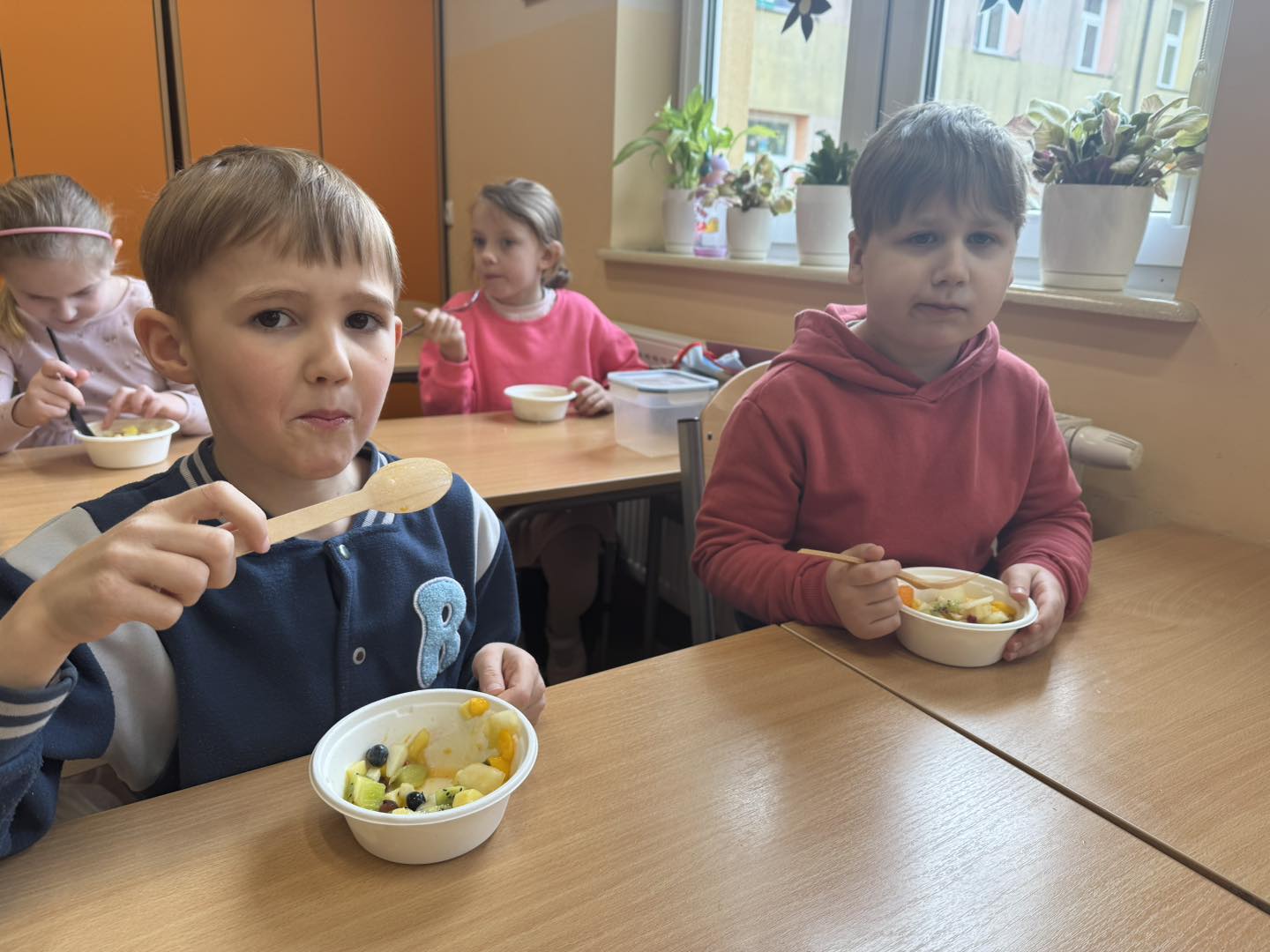 Klasa 1 przygotowała samodzielnie witaminowy zawrót głowy na drugie śniadanie - sałatkę owocową. Uczniowie z zaangażowaniem obierali, kroili, wkładali do miski oraz mieszali różnego rodzaju owoce. Najprzyjemniejszym momentem była oczywiście degustacja pysznej, zdrowej i kolorowej sałatki.