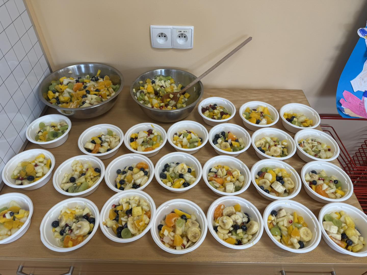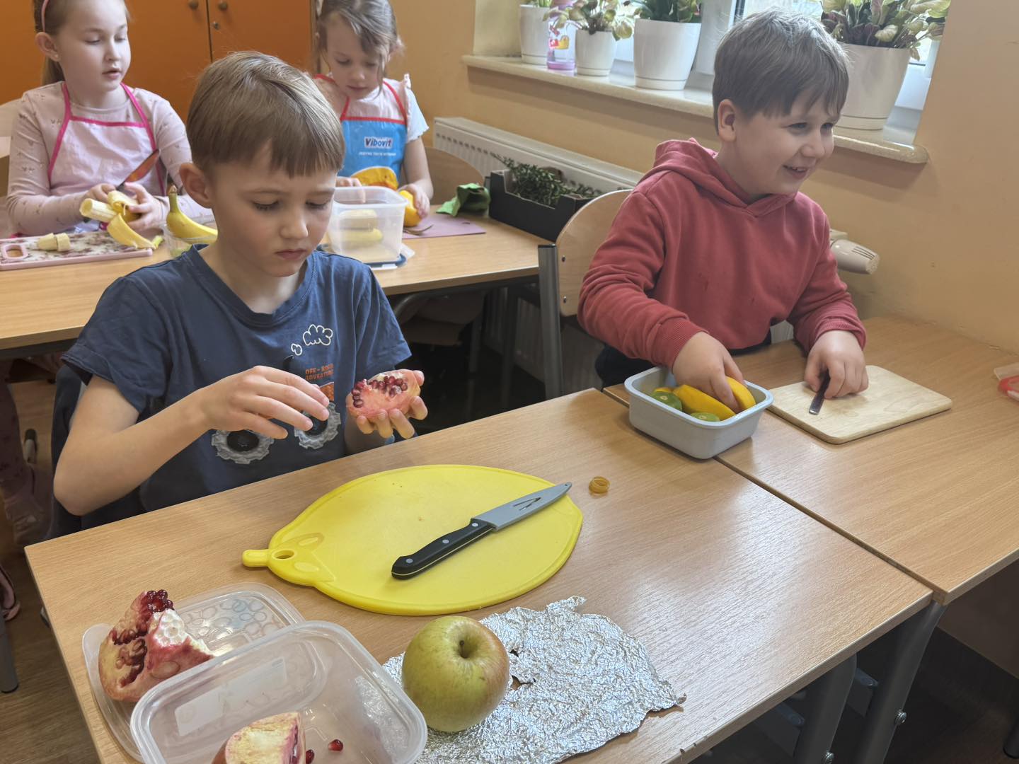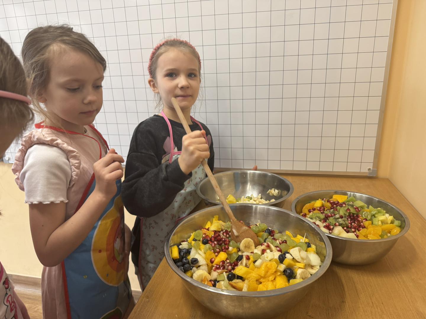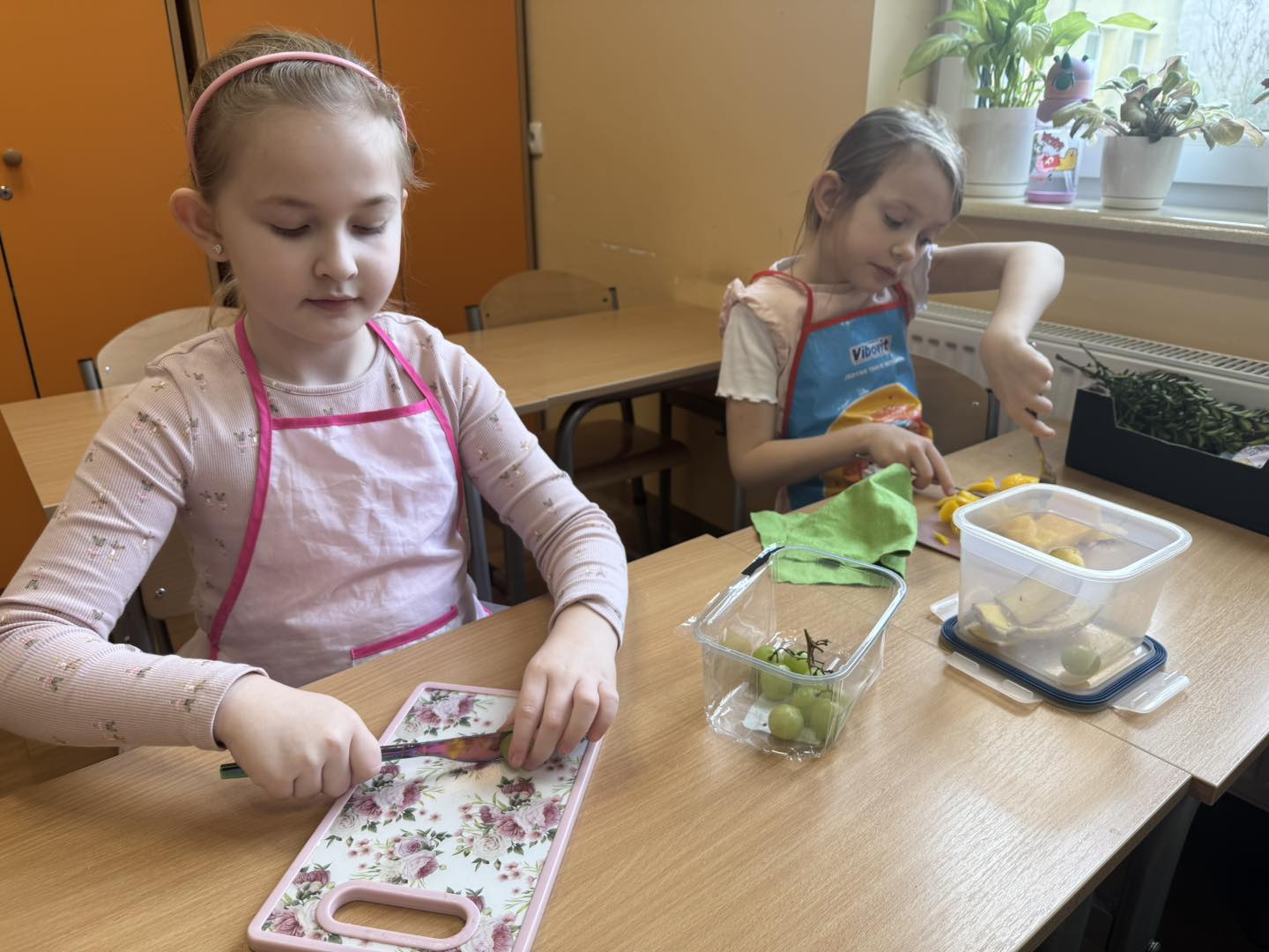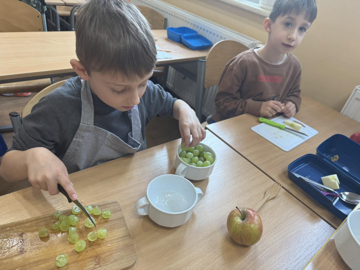 Klasa 1 przygotowała samodzielnie witaminowy zawrót głowy na drugie śniadanie - sałatkę owocową. Uczniowie z zaangażowaniem obierali, kroili, wkładali do miski oraz mieszali różnego rodzaju owoce. Najprzyjemniejszym momentem była oczywiście degustacja pysznej, zdrowej i kolorowej sałatki.