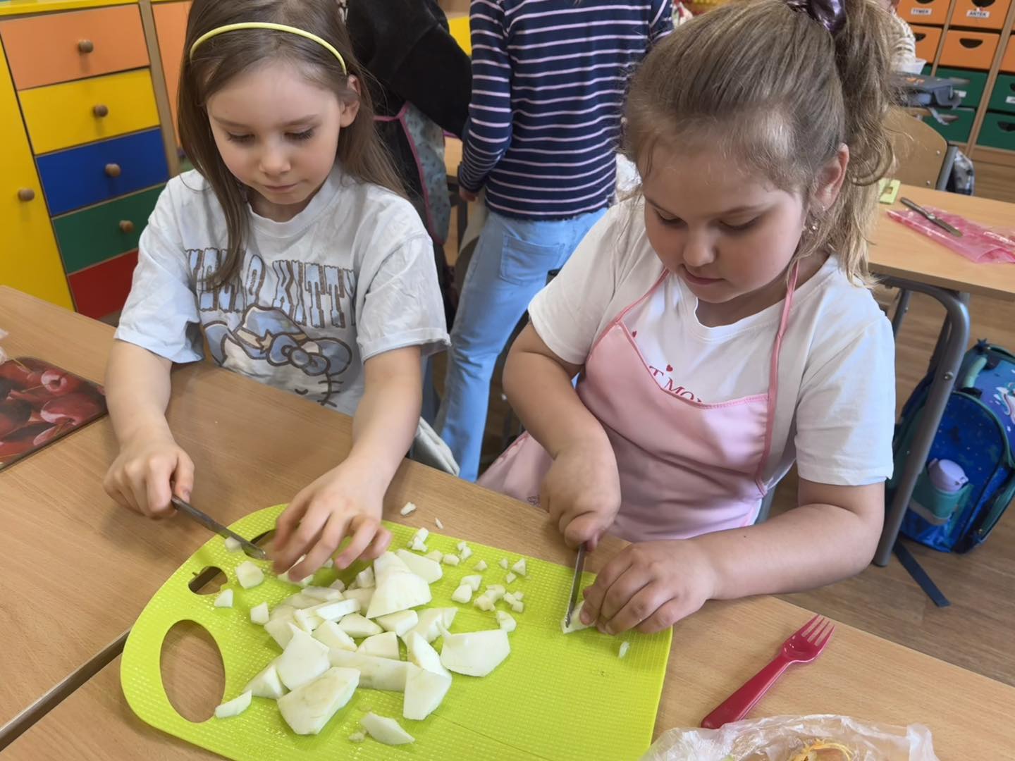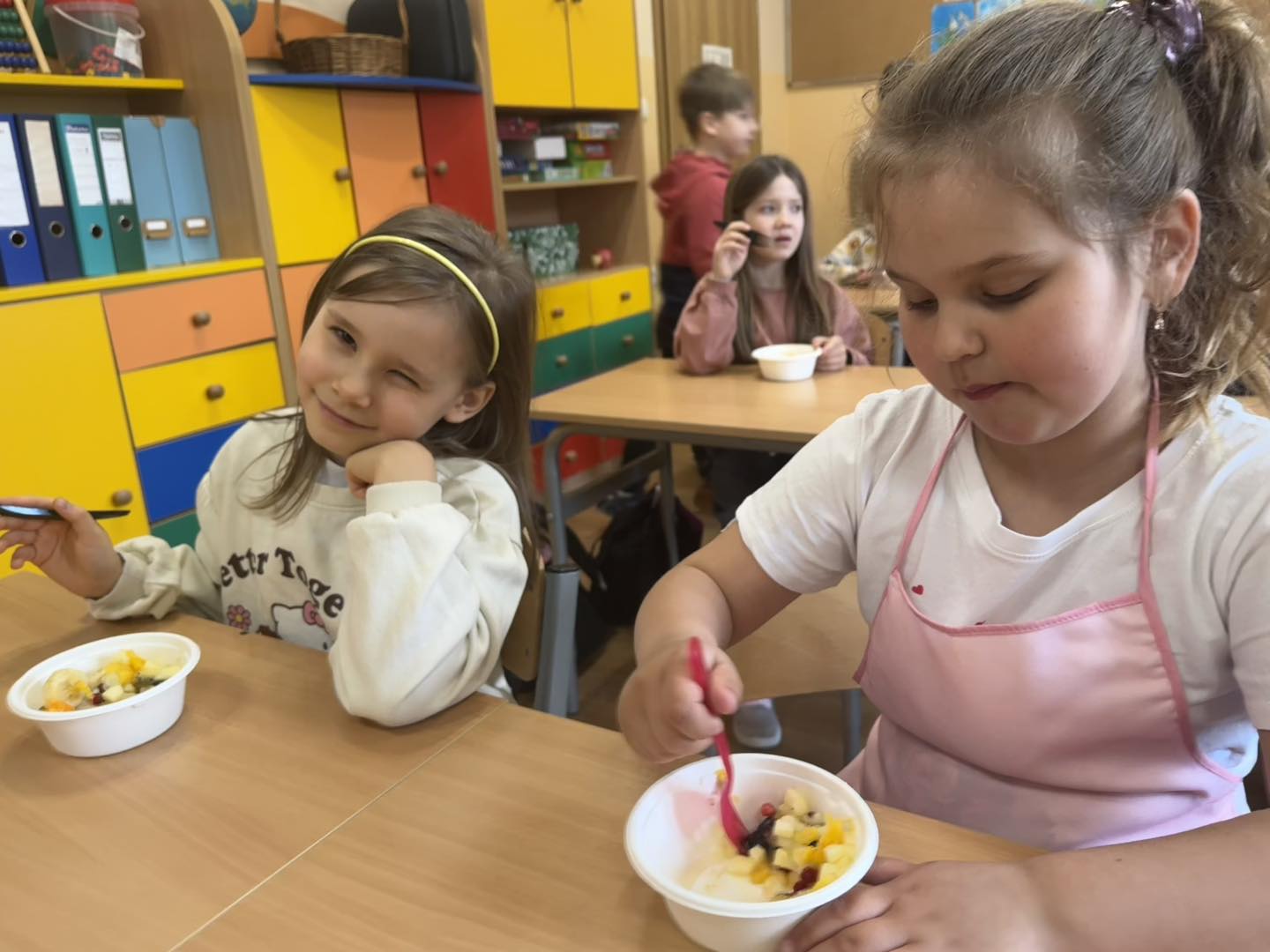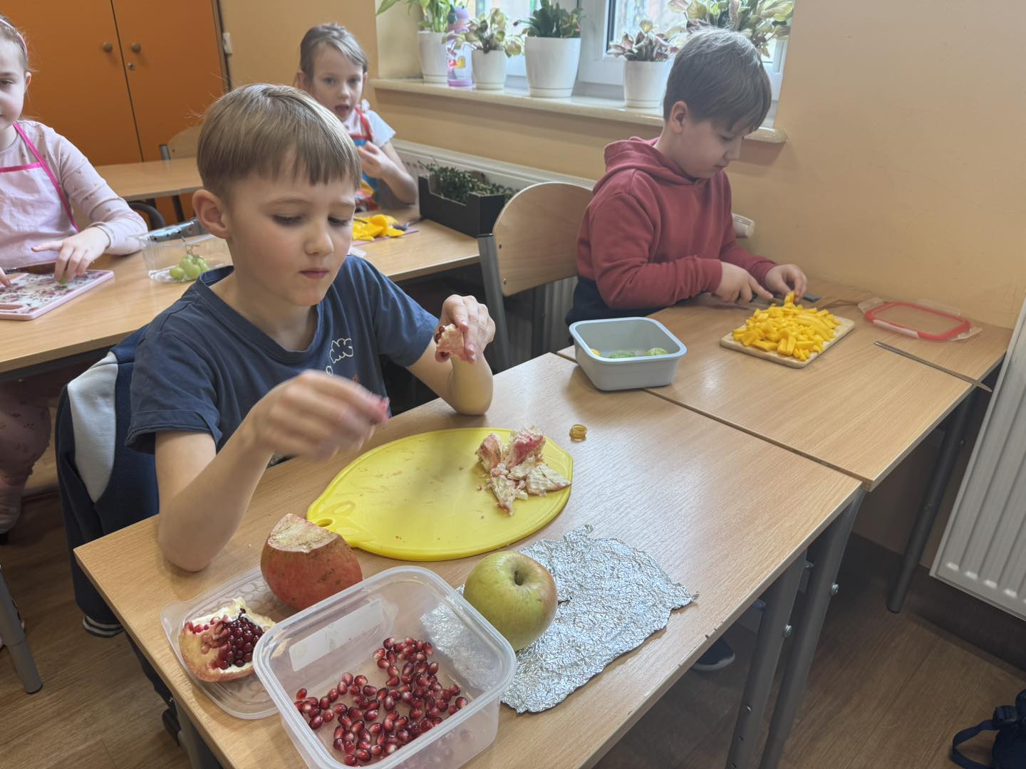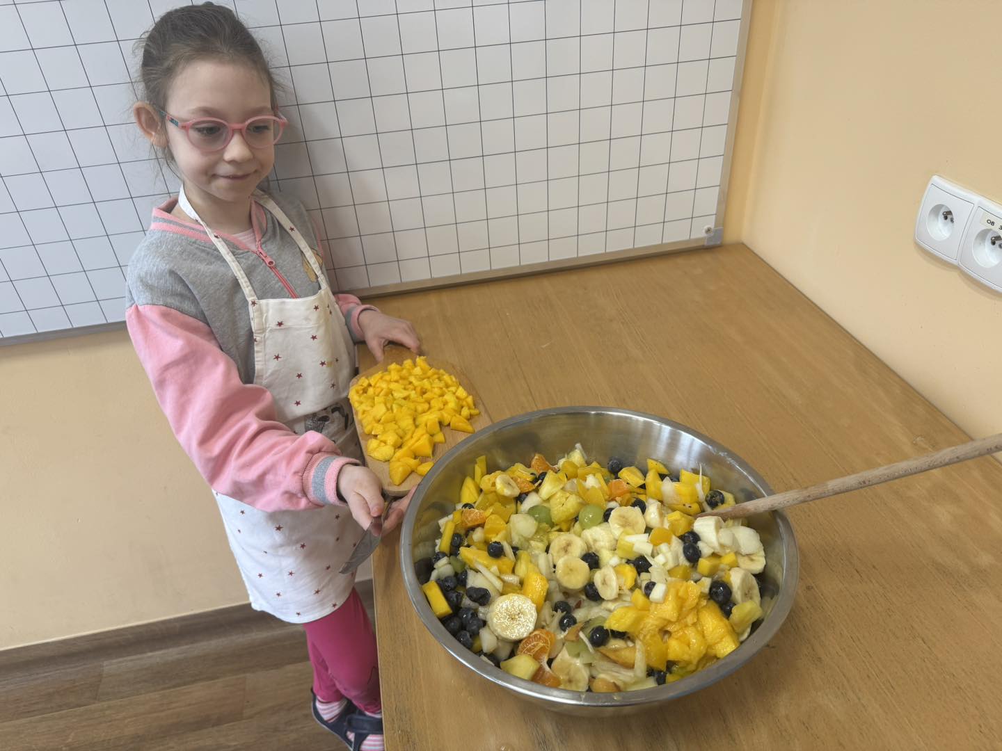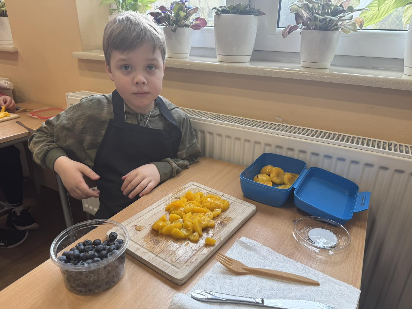 Klasa 1 przygotowała samodzielnie witaminowy zawrót głowy na drugie śniadanie - sałatkę owocową. Uczniowie z zaangażowaniem obierali, kroili, wkładali do miski oraz mieszali różnego rodzaju owoce. Najprzyjemniejszym momentem była oczywiście degustacja pysznej, zdrowej i kolorowej sałatki.