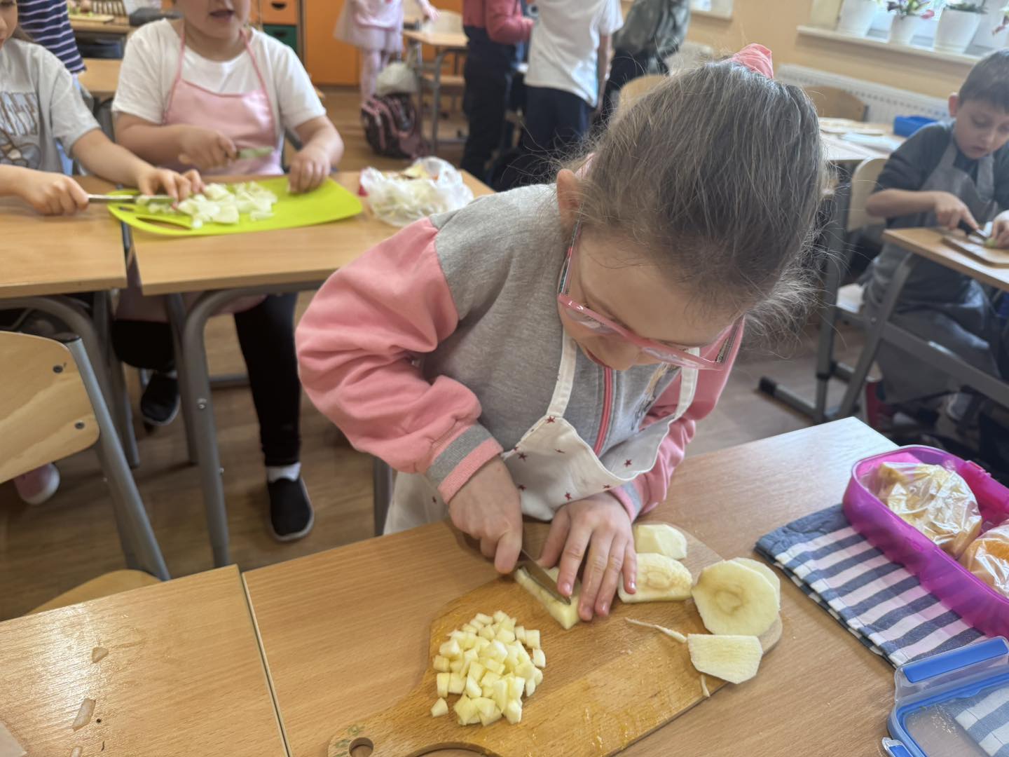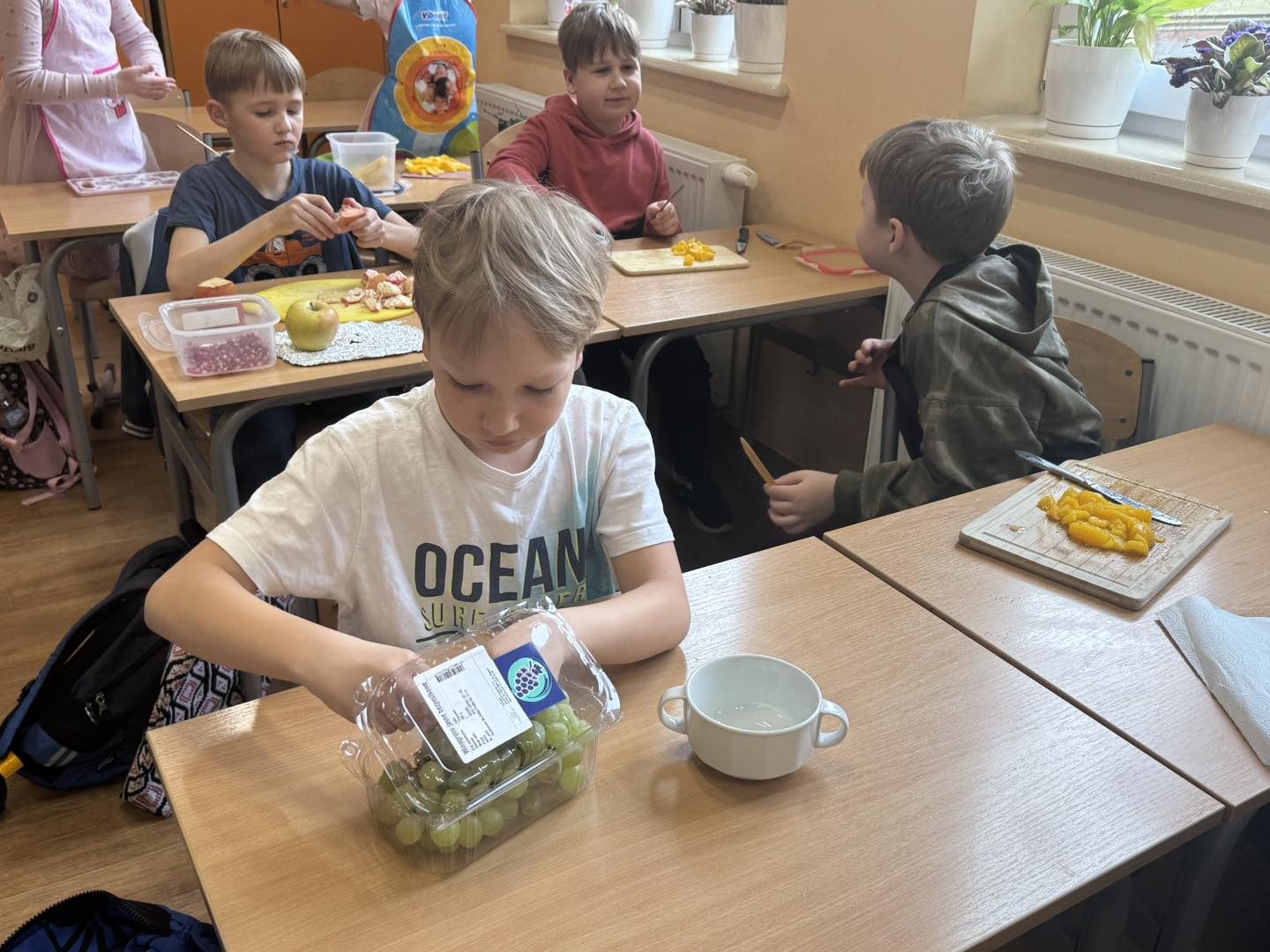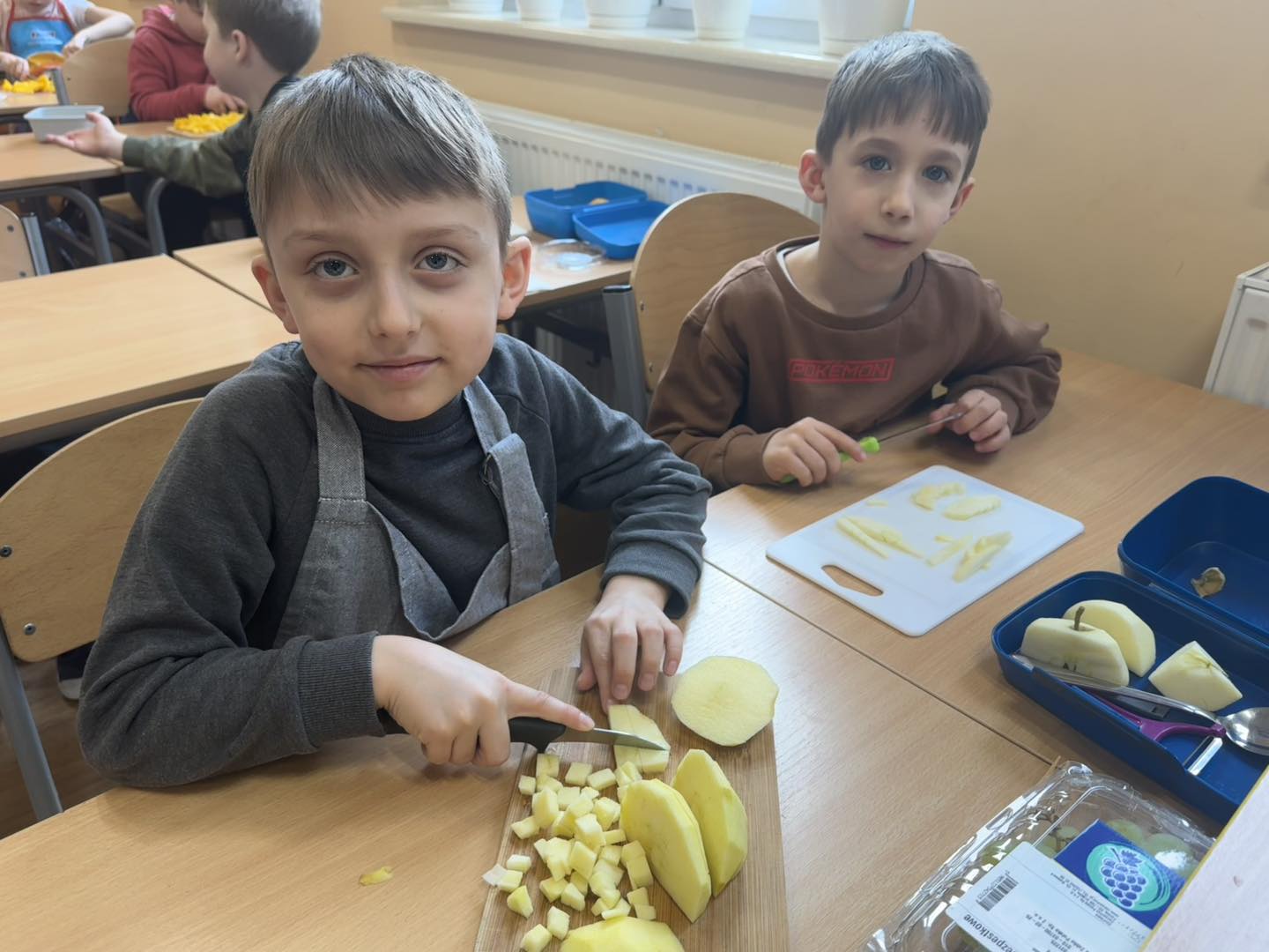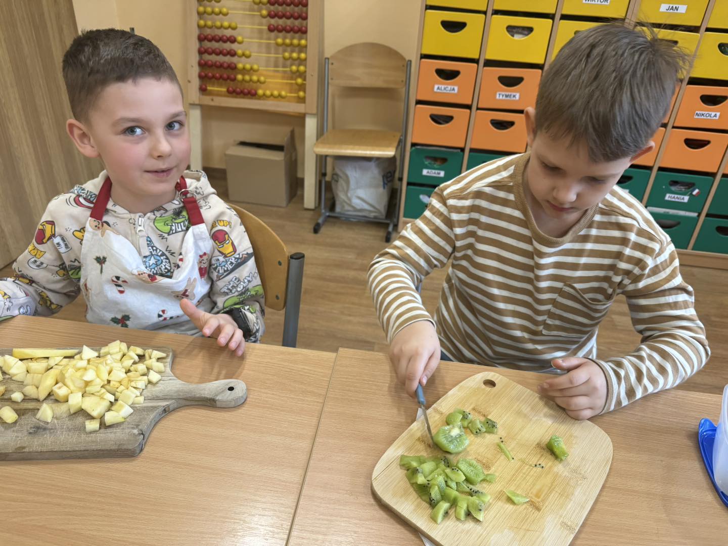Klasa 1 przygotowała samodzielnie witaminowy zawrót głowy na drugie śniadanie - sałatkę owocową. Uczniowie z zaangażowaniem obierali, kroili, wkładali do miski oraz mieszali różnego rodzaju owoce. Najprzyjemniejszym momentem była oczywiście degustacja pysznej, zdrowej i kolorowej sałatki.