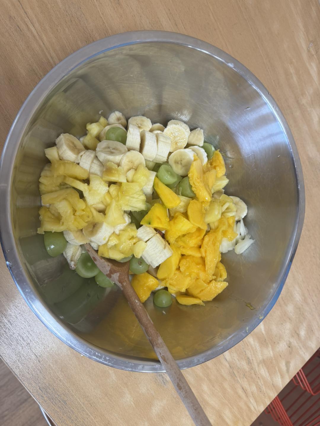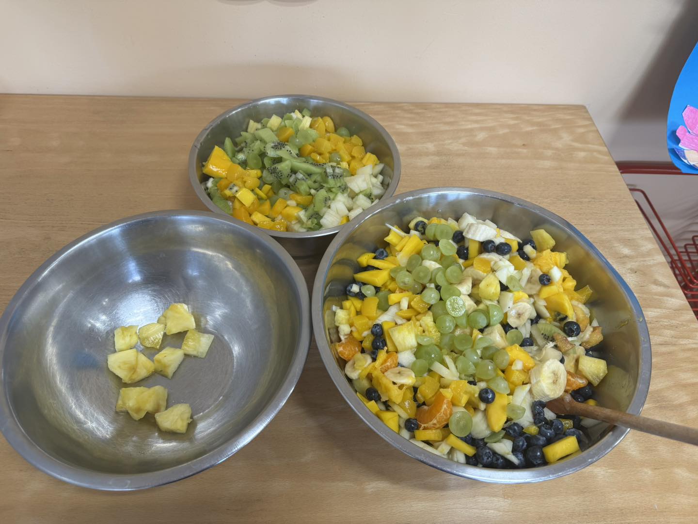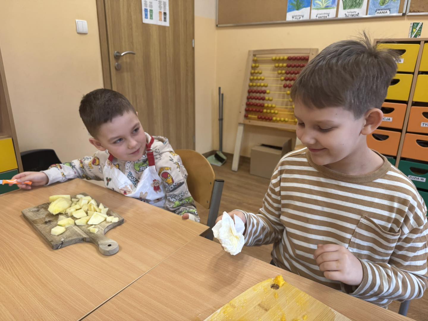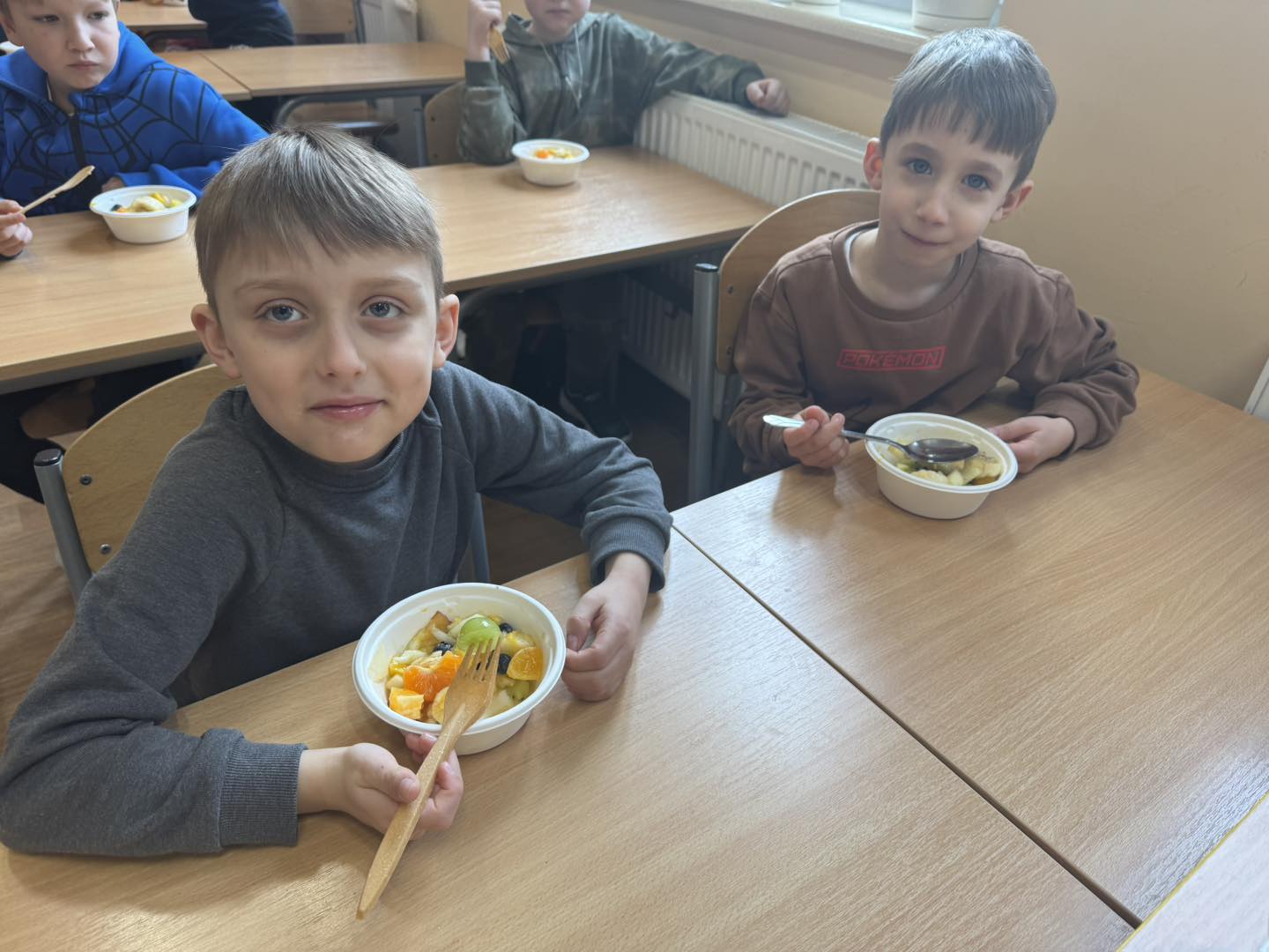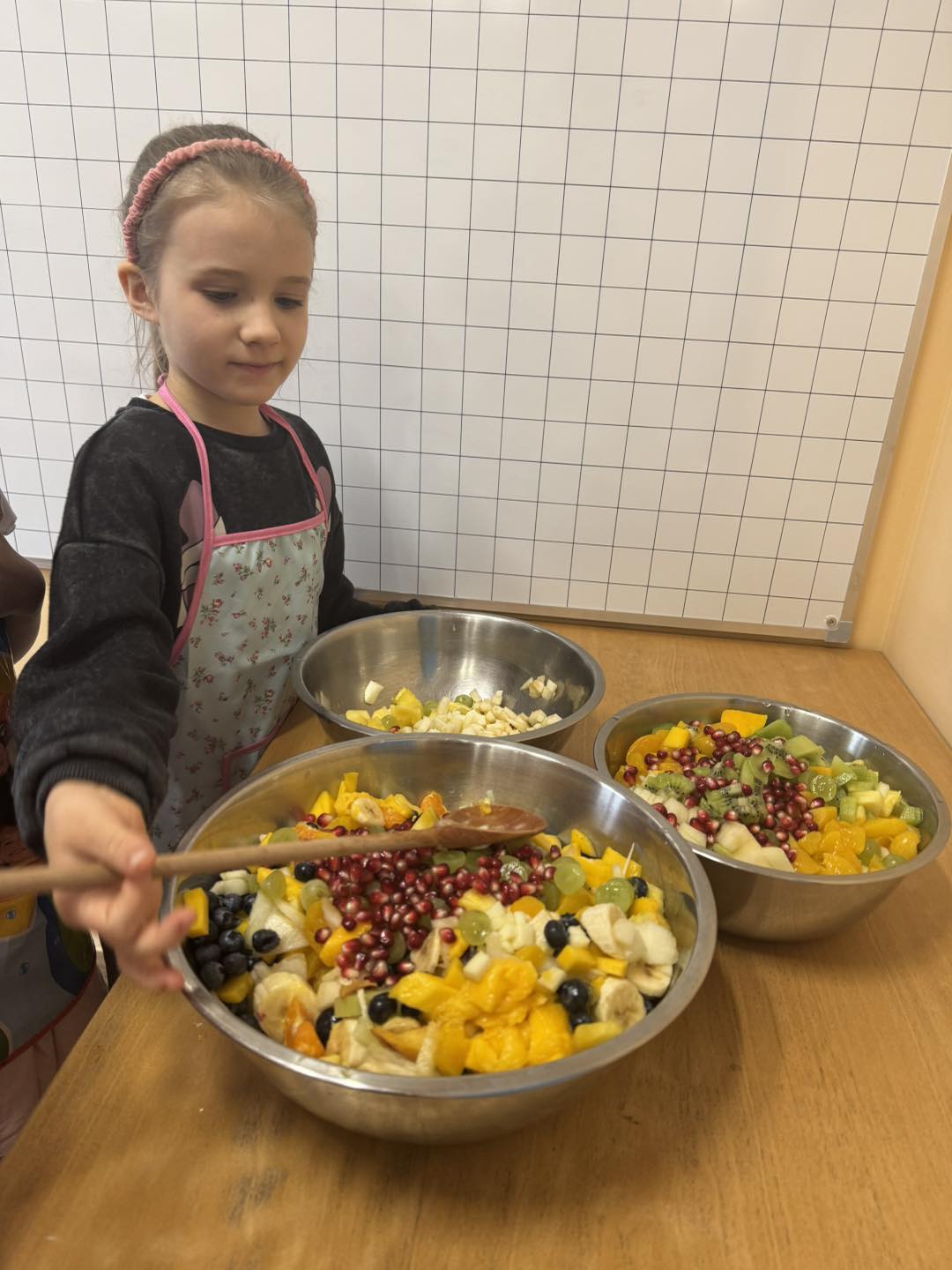 Klasa 1 przygotowała samodzielnie witaminowy zawrót głowy na drugie śniadanie - sałatkę owocową. Uczniowie z zaangażowaniem obierali, kroili, wkładali do miski oraz mieszali różnego rodzaju owoce. Najprzyjemniejszym momentem była oczywiście degustacja pysznej, zdrowej i kolorowej sałatki.
