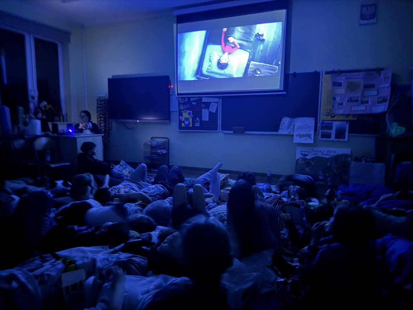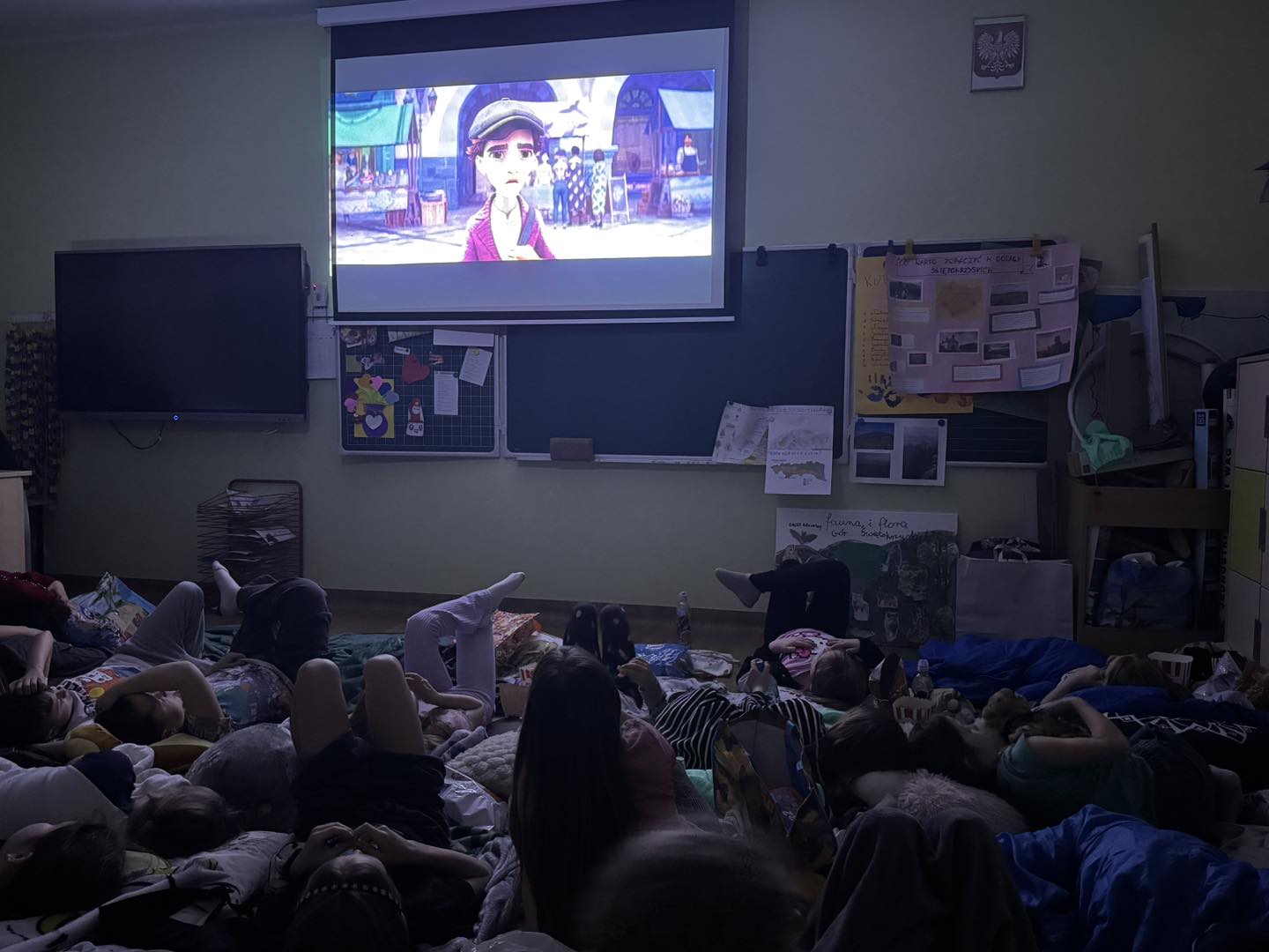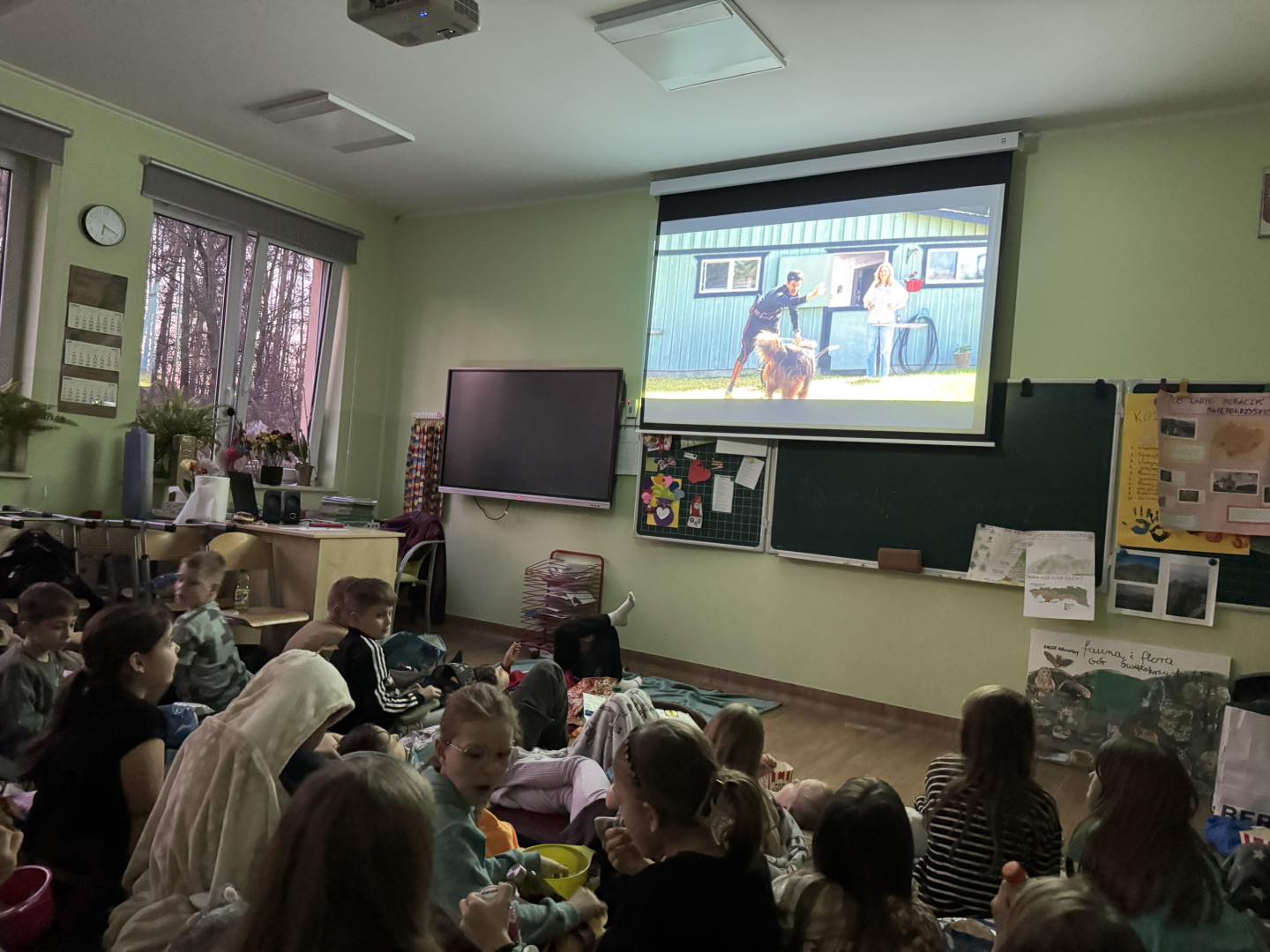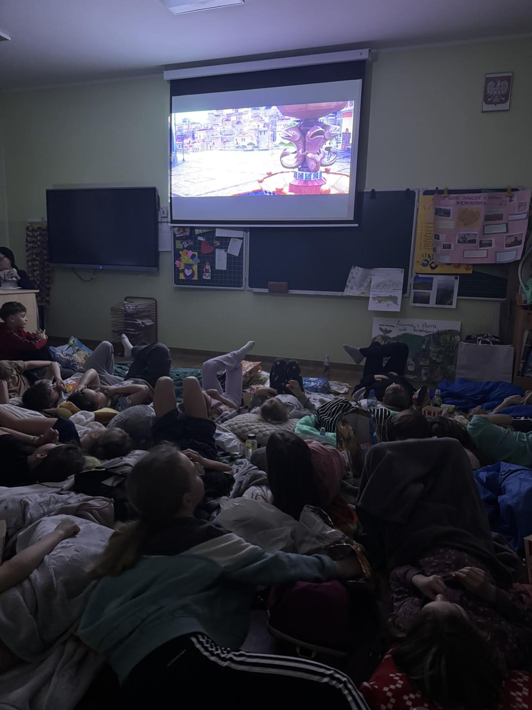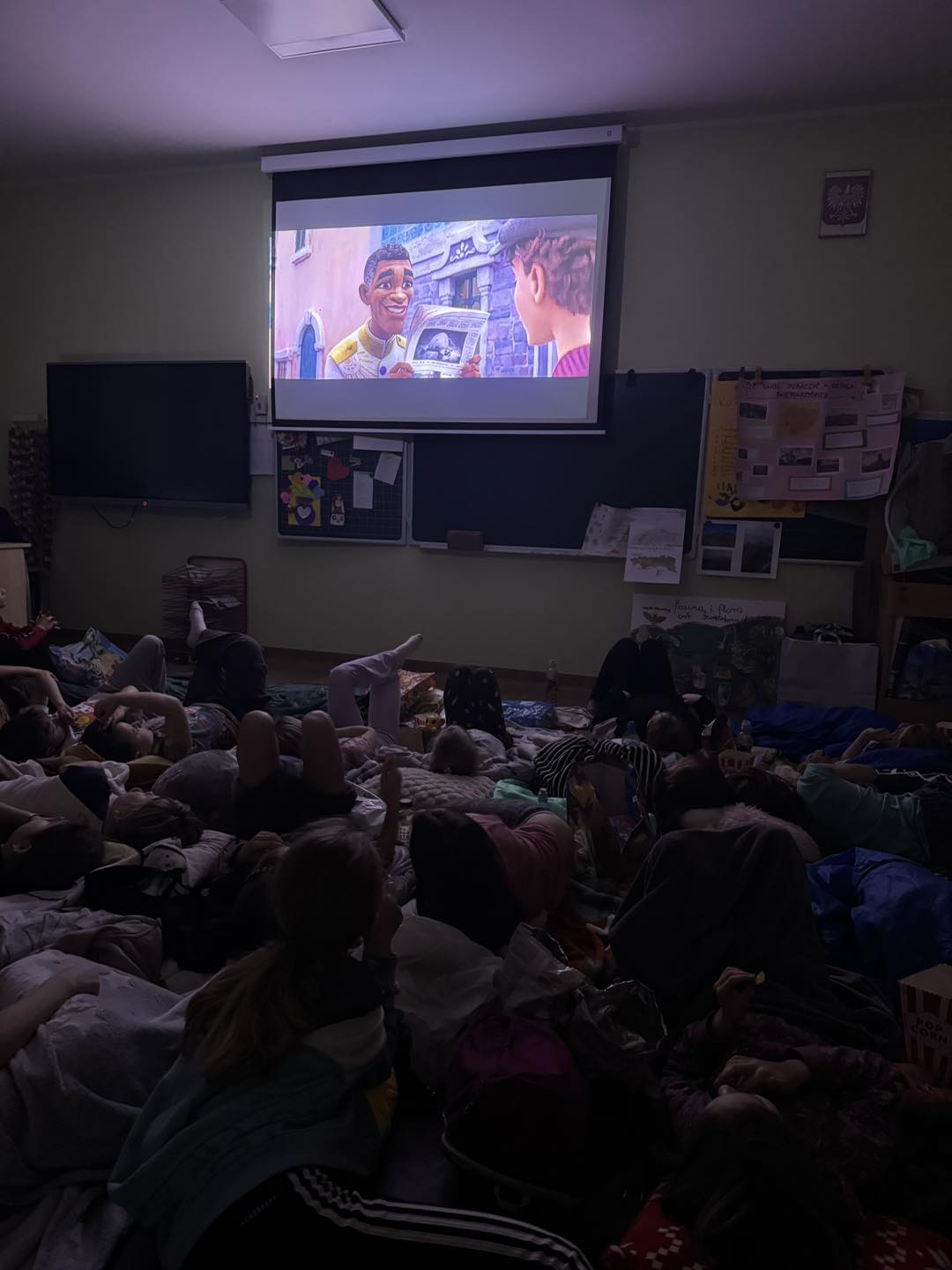 W piątek 28 marca w naszej szkole jedno z pomieszczeń na parterze zamieniło się w salę kinową . Wychowawczynie klas młodszych przygotowały dla dzieci niespodziankę - wieczór filmowy. Uczniowie obejrzeli bajkę pt. „Magiczna słonica” oraz film pt. „Ruby na ratunek”. Wszyscy bawili się doskonale!