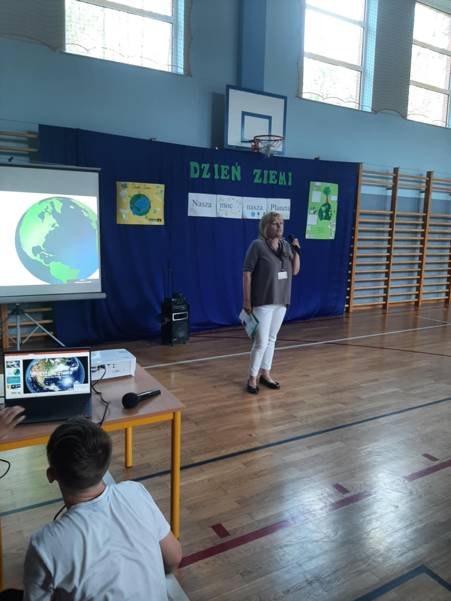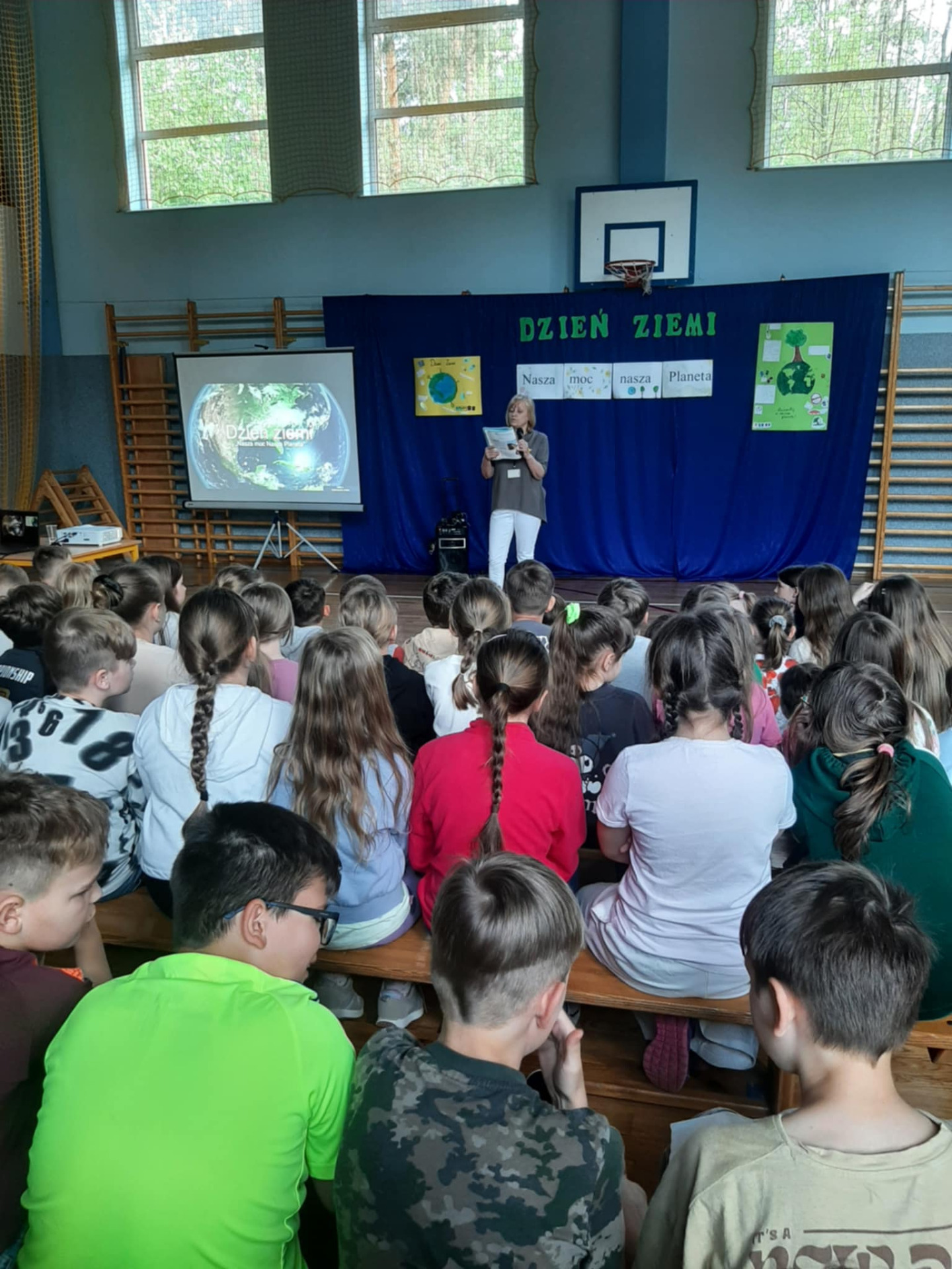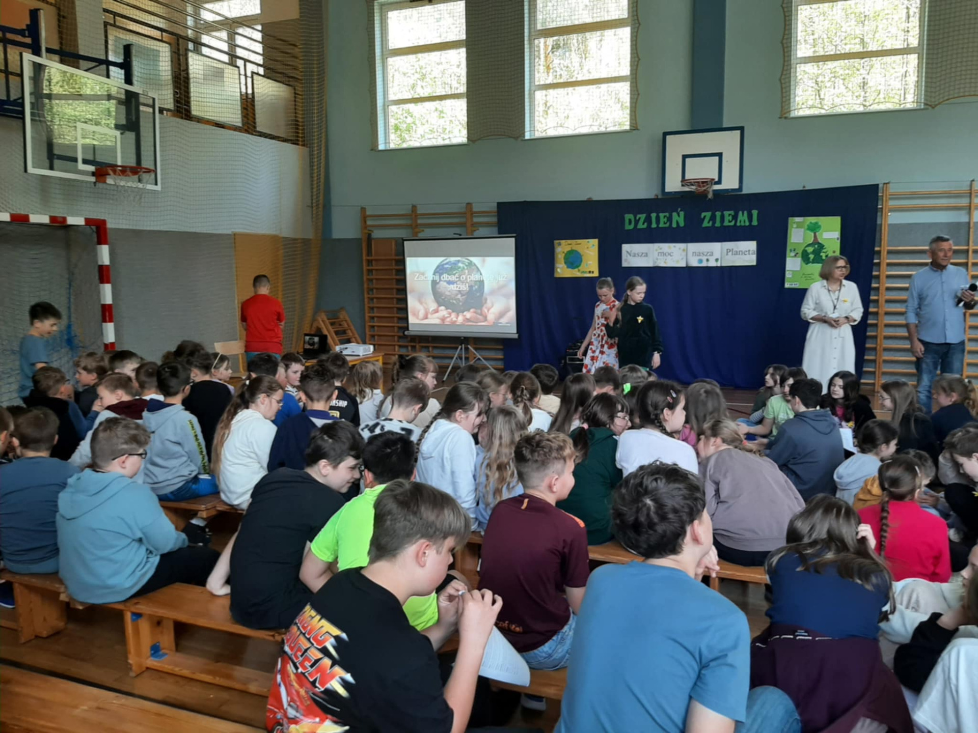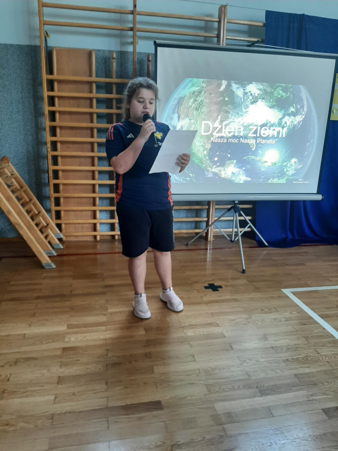 Jednym z elementów środowego (23.04) spotkania w sali gimnastycznej było przygotowane przez uczniów klasy V specjalne wystąpienie związane z obchodami Dnia Ziemi. Dzieci zaprezentowały prezentację multimedialną i przedstawiły wiele ciekawych informacji o ochronie naszej planety. Na zakończenie tej części spotkania uczniowie klas IV – VIII wykonali zadanie, które polegało na zapisaniu odpowiedzi na pytanie: „Co należy zrobić, aby zadbać o naszą planetę?”. Każda klasa zaprezentowała swoje pomysły na ochronę przyrody naszej najbliższej okolicy.