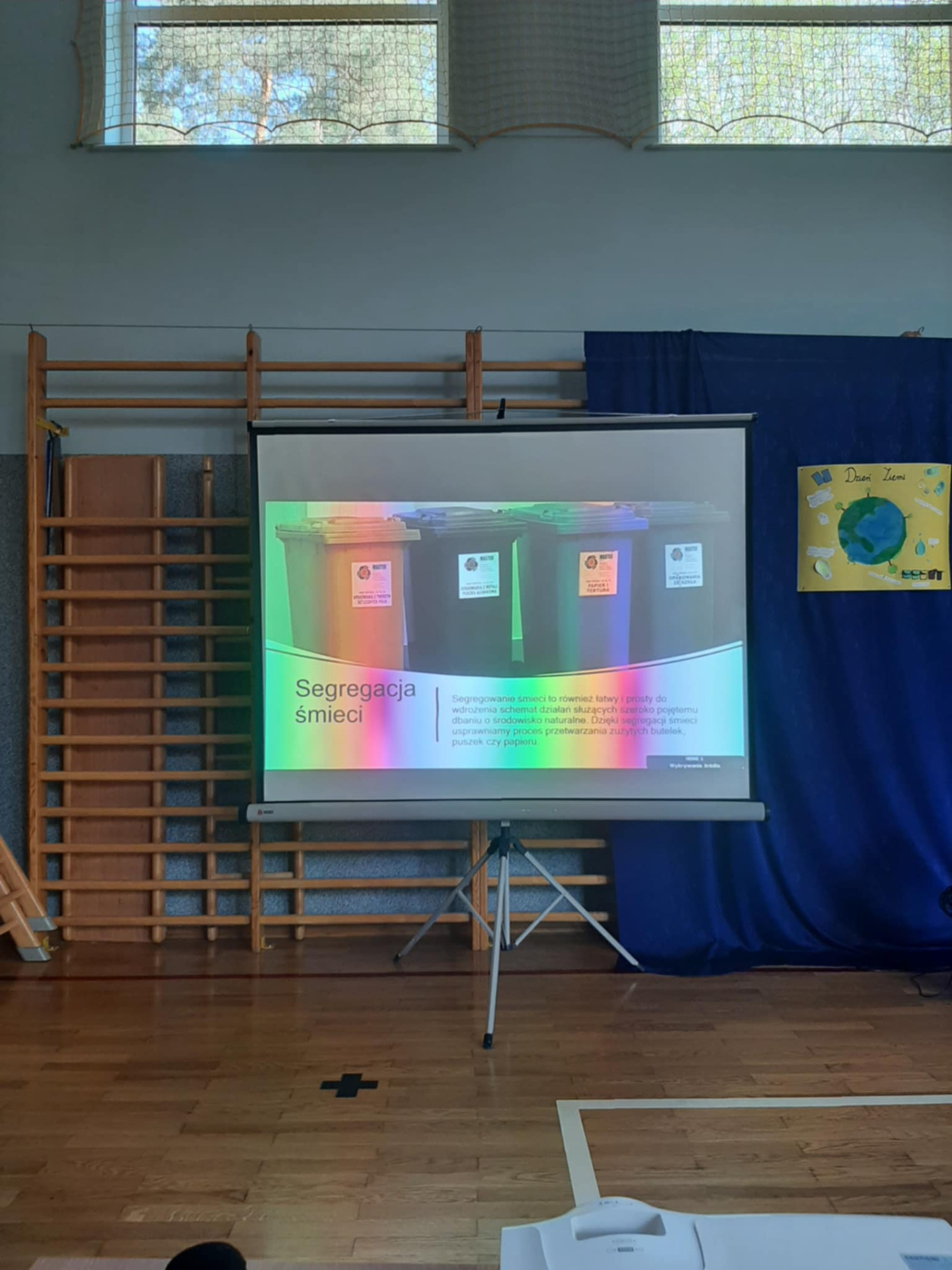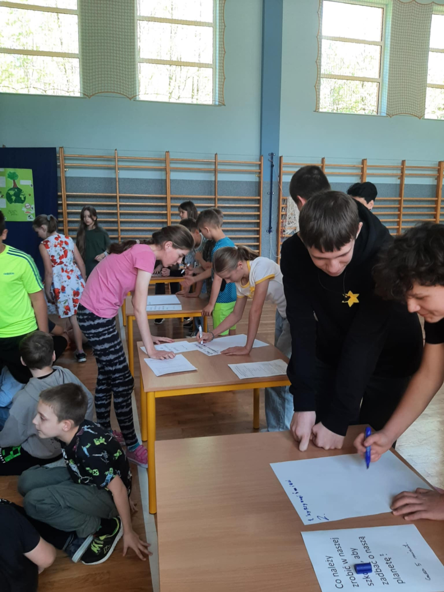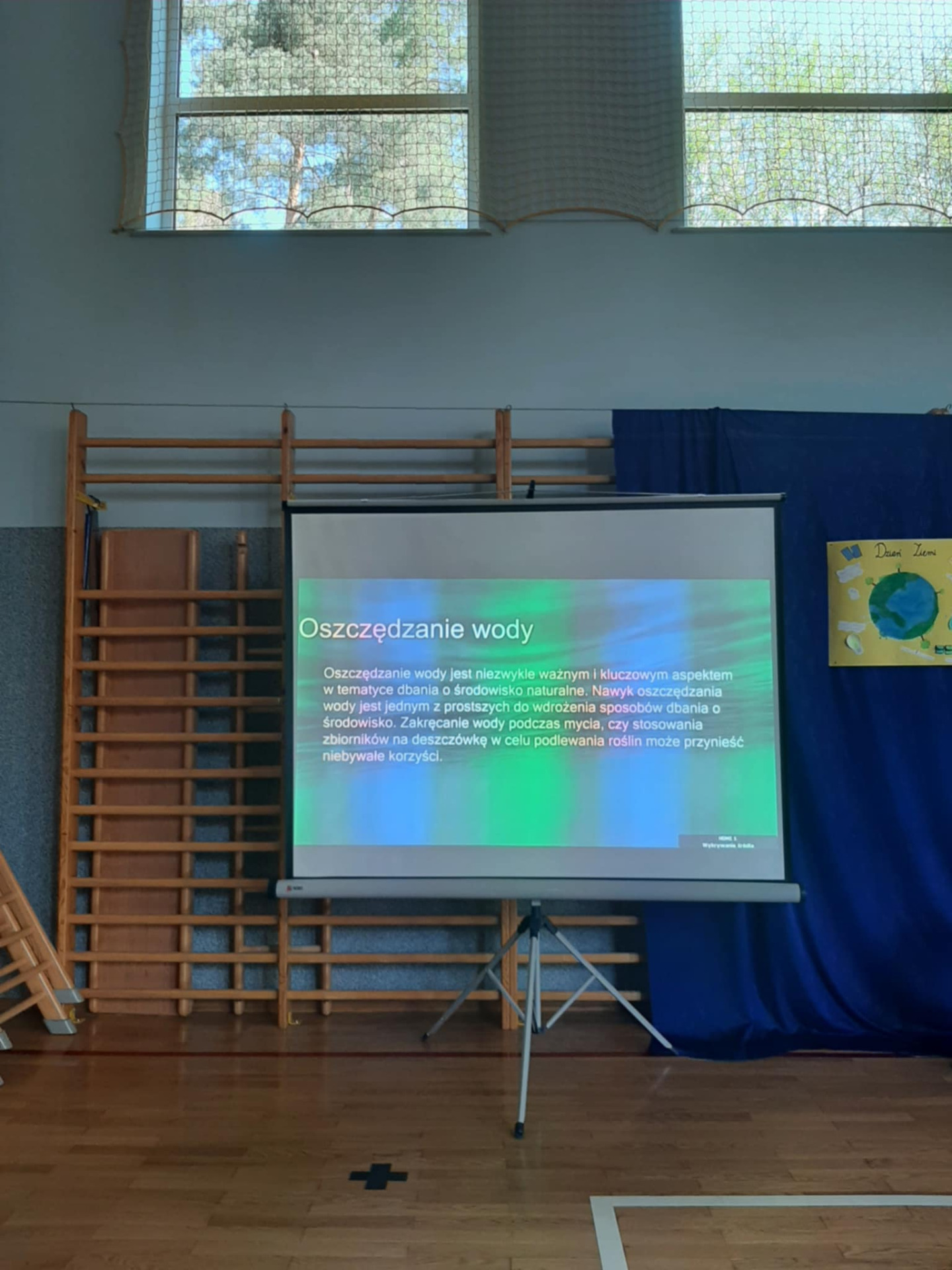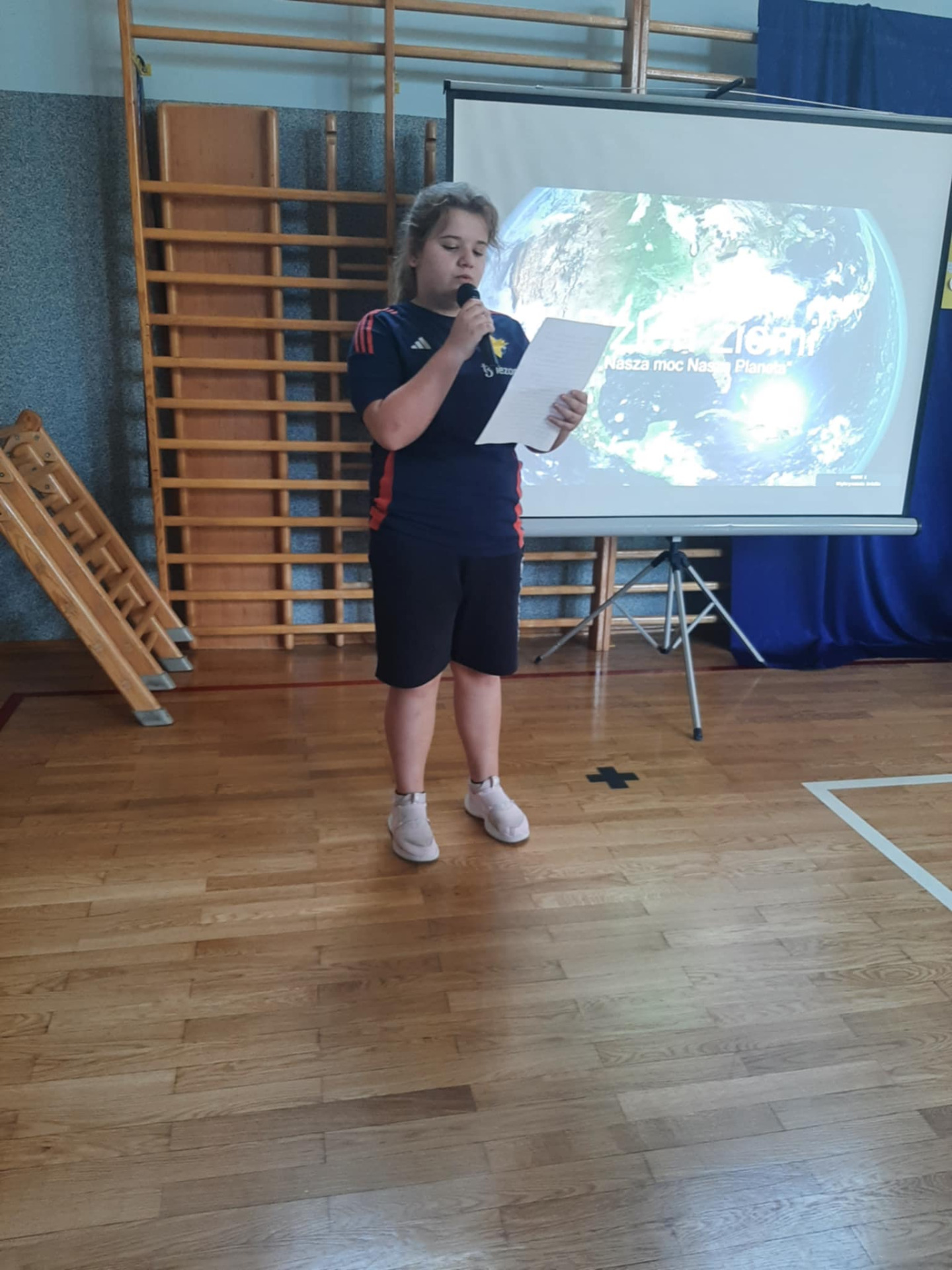 Jednym z elementów środowego (23.04) spotkania w sali gimnastycznej było przygotowane przez uczniów klasy V specjalne wystąpienie związane z obchodami Dnia Ziemi. Dzieci zaprezentowały prezentację multimedialną i przedstawiły wiele ciekawych informacji o ochronie naszej planety. Na zakończenie tej części spotkania uczniowie klas IV – VIII wykonali zadanie, które polegało na zapisaniu odpowiedzi na pytanie: „Co należy zrobić, aby zadbać o naszą planetę?”. Każda klasa zaprezentowała swoje pomysły na ochronę przyrody naszej najbliższej okolicy.