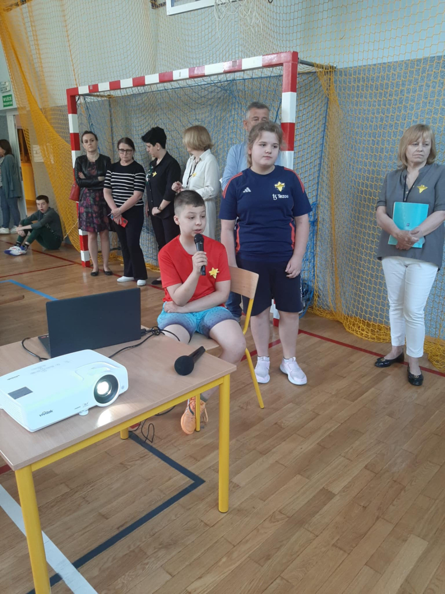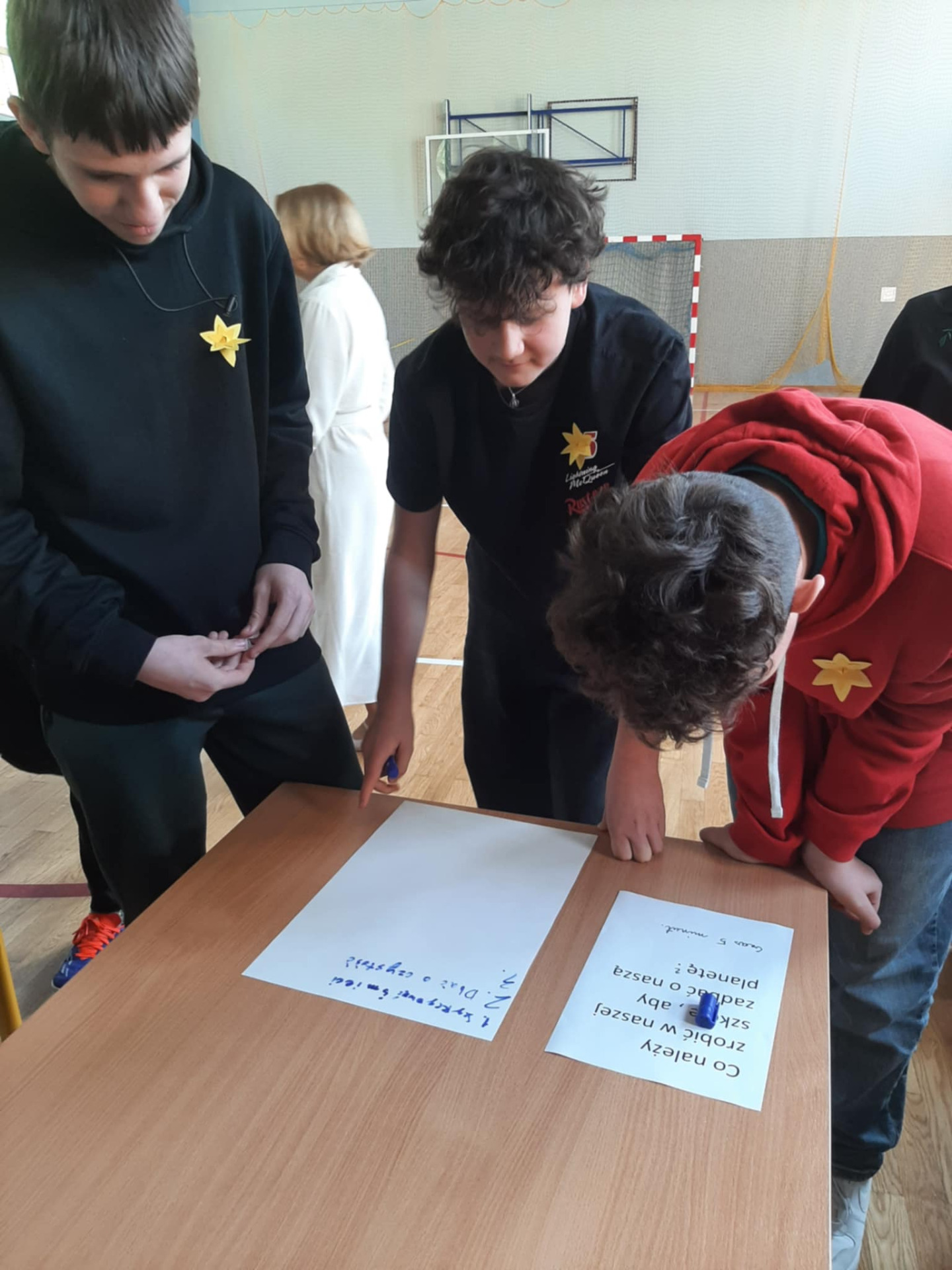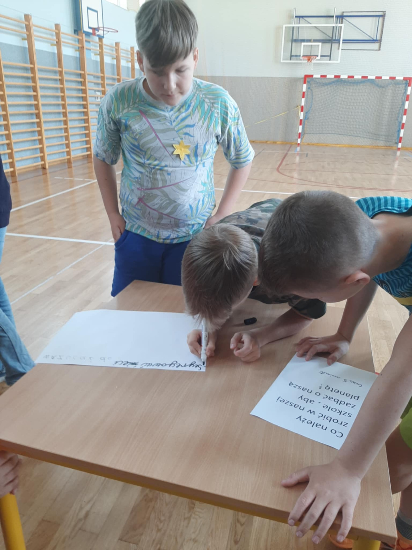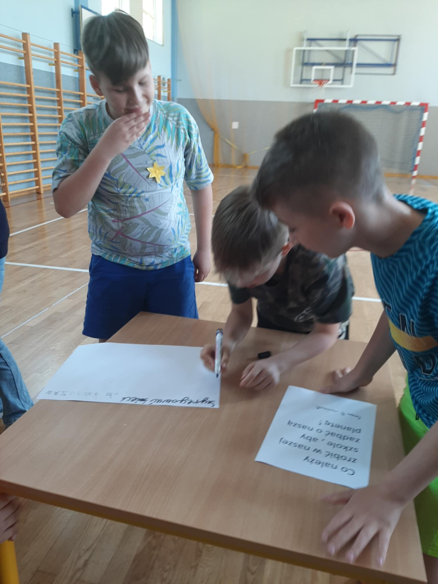 Jednym z elementów środowego (23.04) spotkania w sali gimnastycznej było przygotowane przez uczniów klasy V specjalne wystąpienie związane z obchodami Dnia Ziemi. Dzieci zaprezentowały prezentację multimedialną i przedstawiły wiele ciekawych informacji o ochronie naszej planety. Na zakończenie tej części spotkania uczniowie klas IV – VIII wykonali zadanie, które polegało na zapisaniu odpowiedzi na pytanie: „Co należy zrobić, aby zadbać o naszą planetę?”. Każda klasa zaprezentowała swoje pomysły na ochronę przyrody naszej najbliższej okolicy.