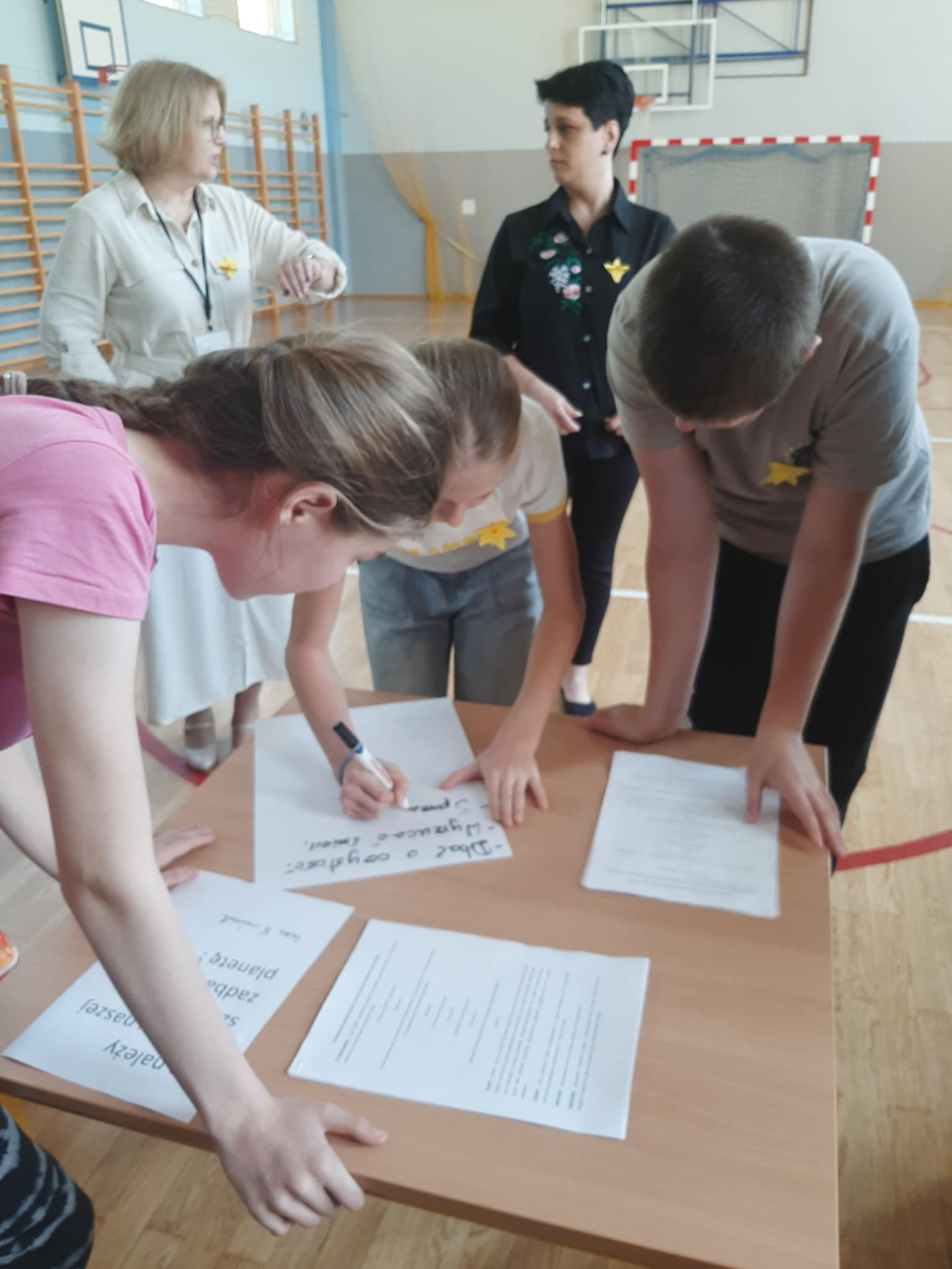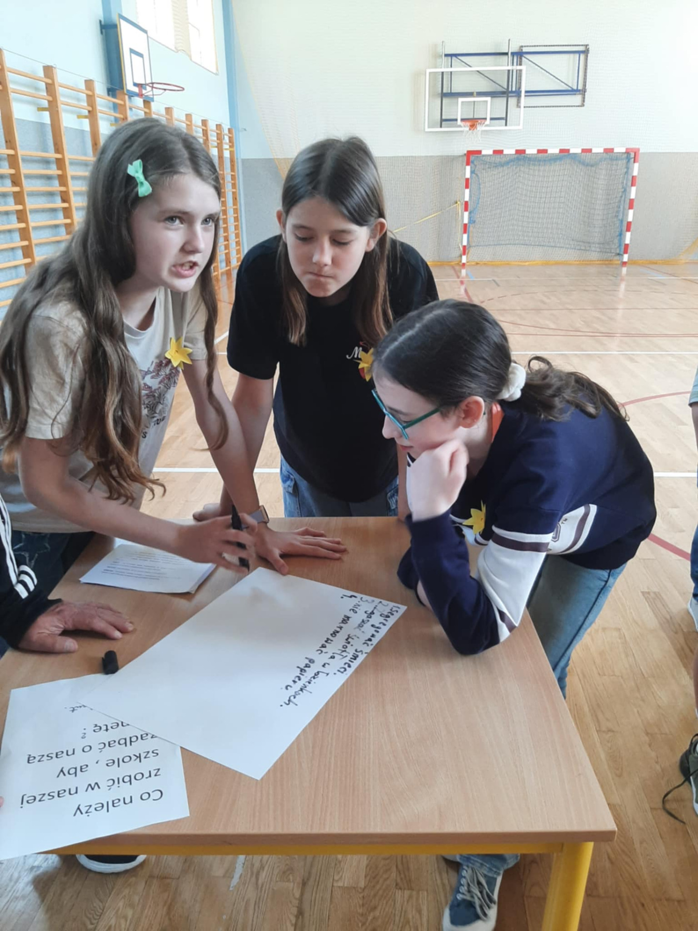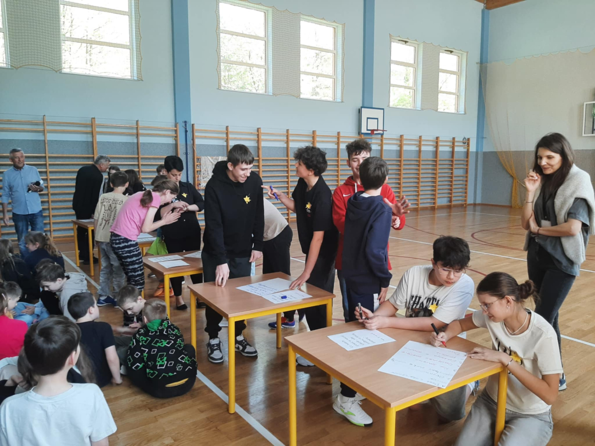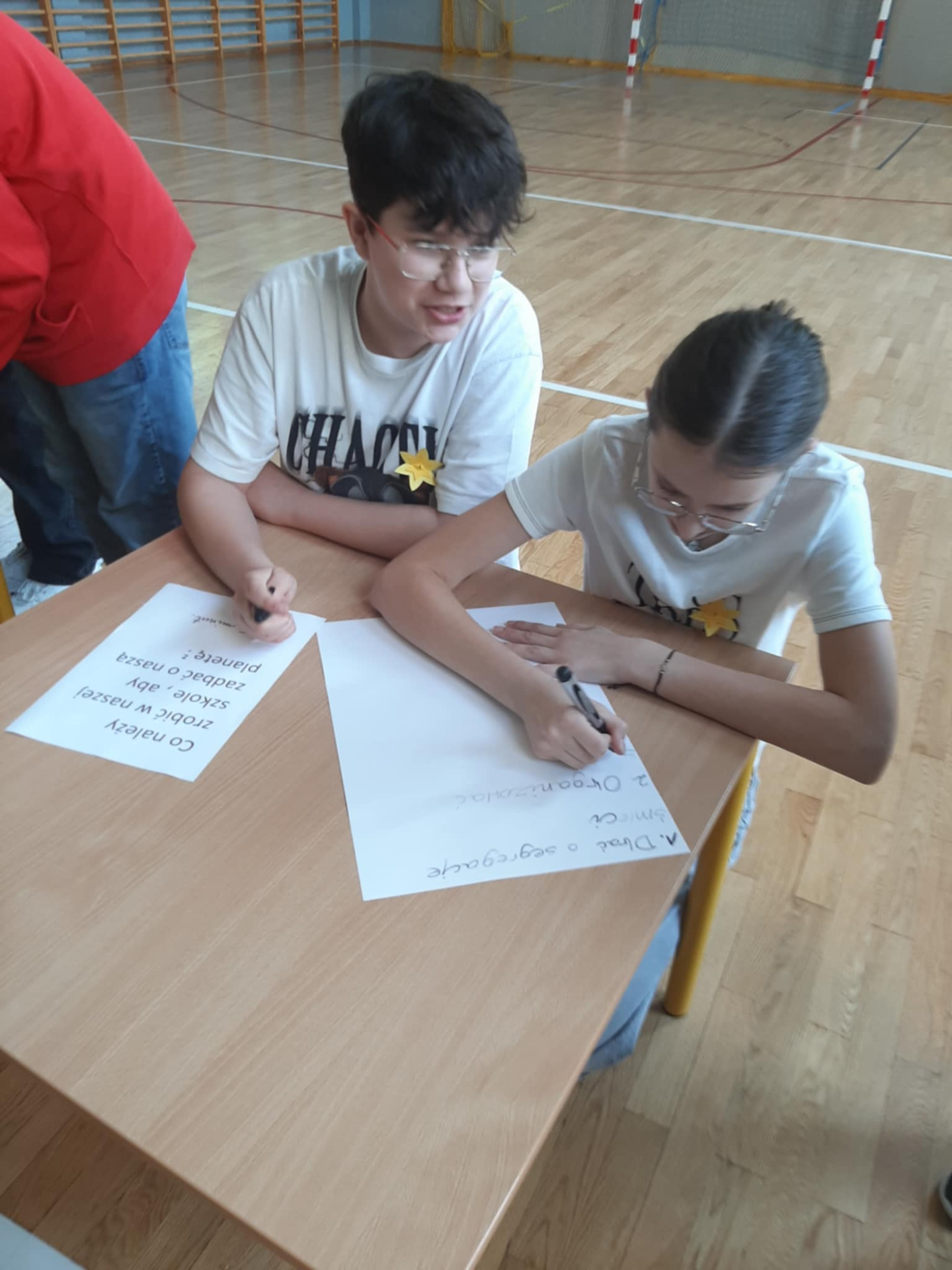 Jednym z elementów środowego (23.04) spotkania w sali gimnastycznej było przygotowane przez uczniów klasy V specjalne wystąpienie związane z obchodami Dnia Ziemi. Dzieci zaprezentowały prezentację multimedialną i przedstawiły wiele ciekawych informacji o ochronie naszej planety. Na zakończenie tej części spotkania uczniowie klas IV – VIII wykonali zadanie, które polegało na zapisaniu odpowiedzi na pytanie: „Co należy zrobić, aby zadbać o naszą planetę?”. Każda klasa zaprezentowała swoje pomysły na ochronę przyrody naszej najbliższej okolicy.