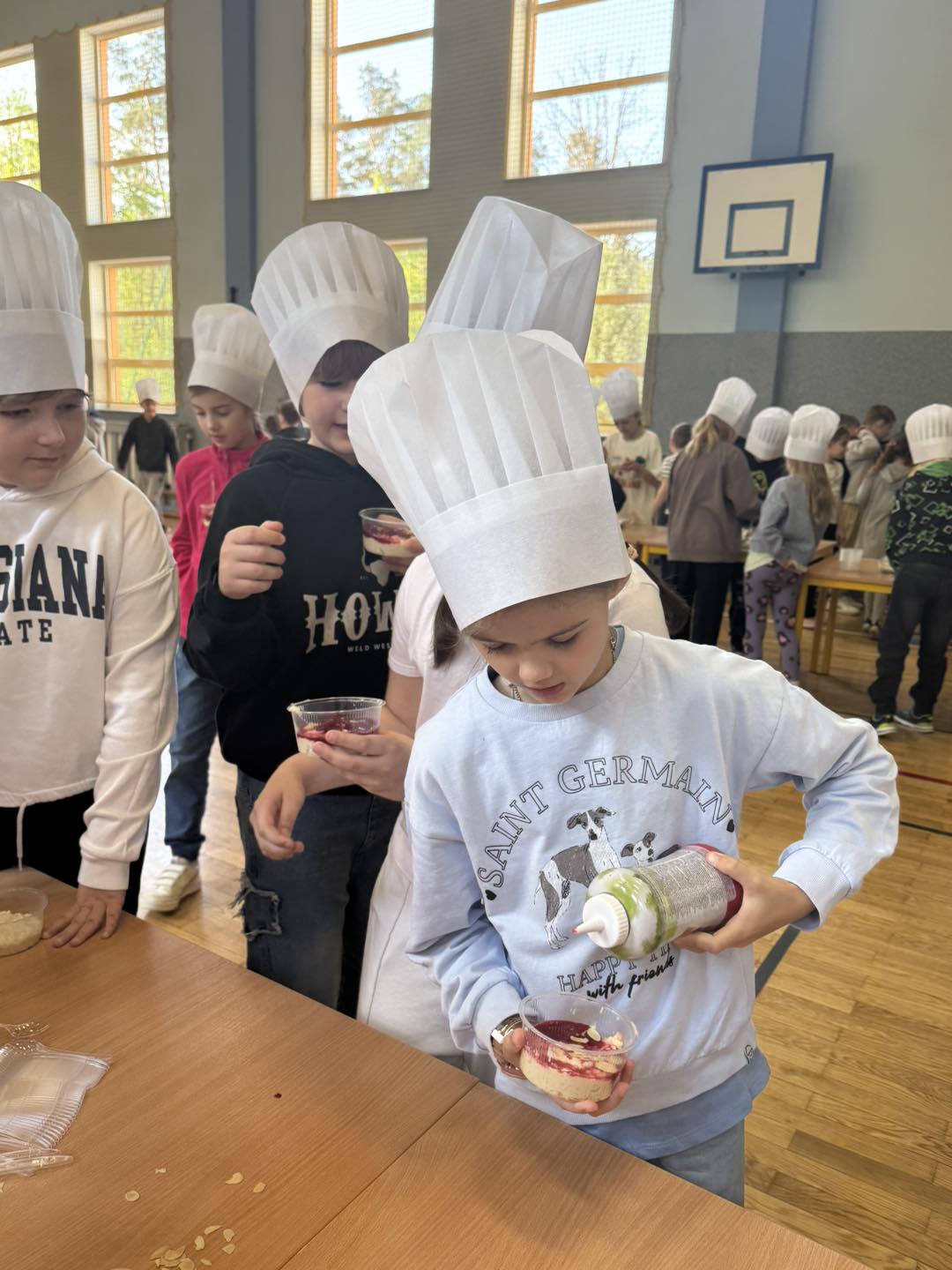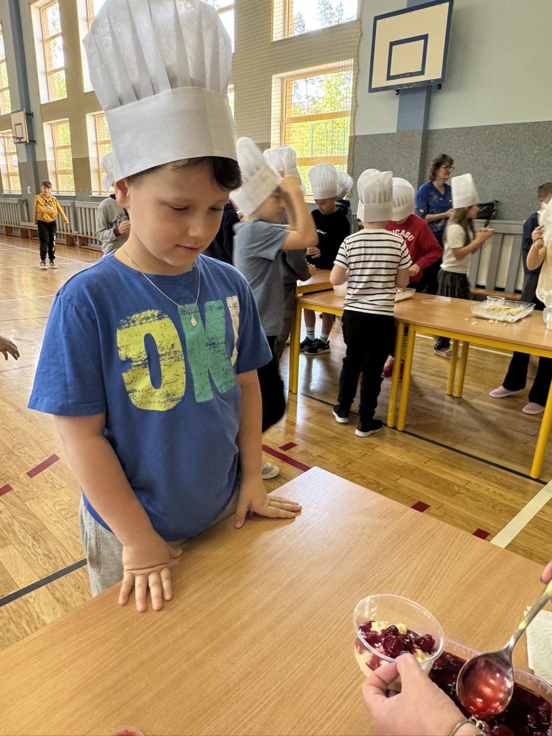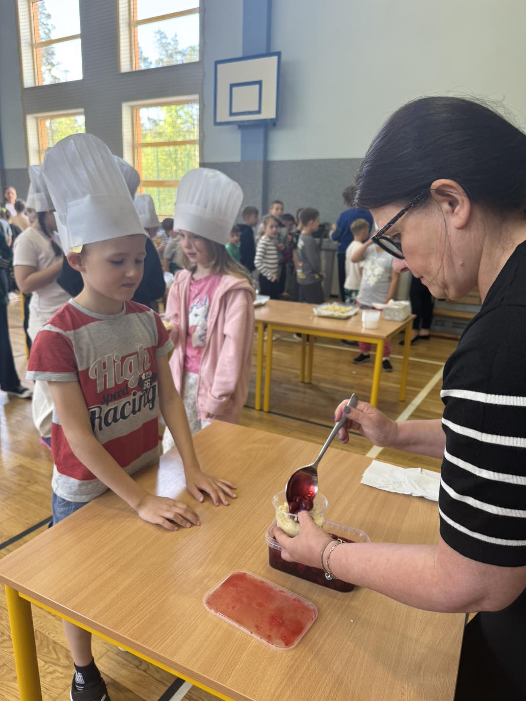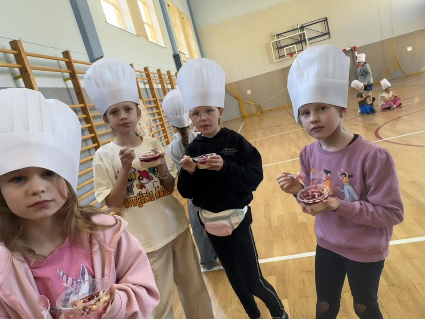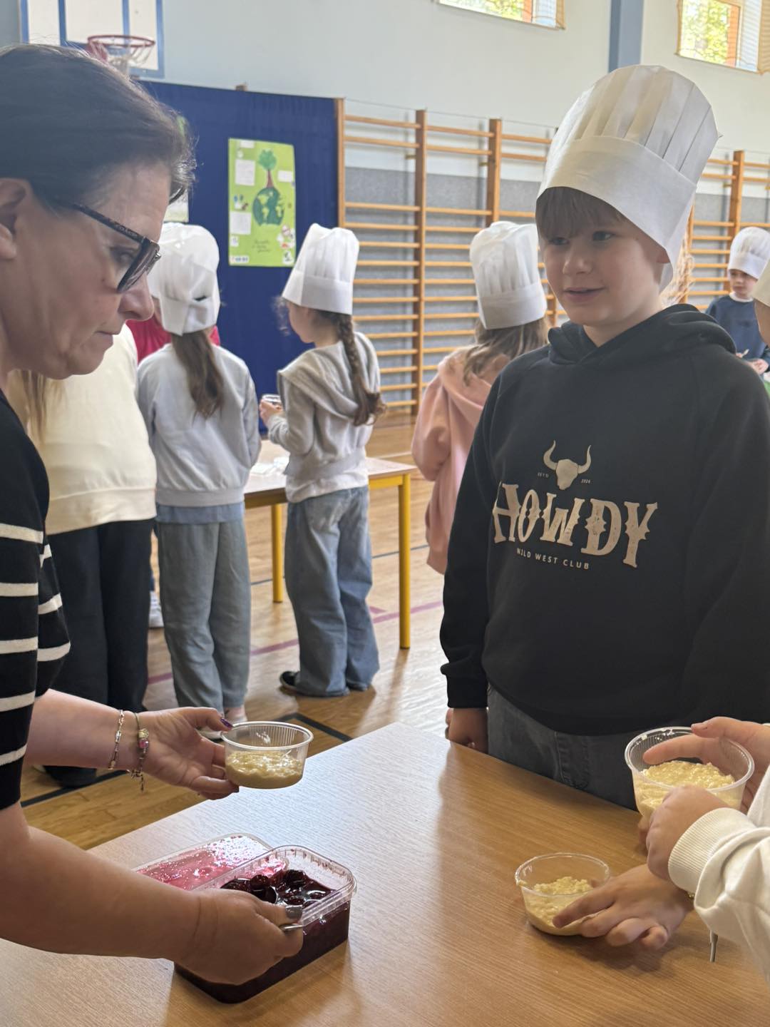 24 kwietnia klasy 1 - 3 wspólnie celebrowały najważniejszy posiłek dnia. Doskonale wiemy, że śniadanie dostarcza nam energii potrzebnej do prawidłowego funkcjonowania organizmu. Dzięki uprzejmości Pana Pawła Oszczyka uczniowie mogli samodzielnie komponować zdrowe śniadanie, składające się z pudingu ryżowego gotowanego na mleku owsianym z dodatkiem sosu wiśniowego, malinowego lub o smaku owoców leśnych. Bardzo dziękujemy Panu Pawłowi za pyszną kulinarną niespodziankę!