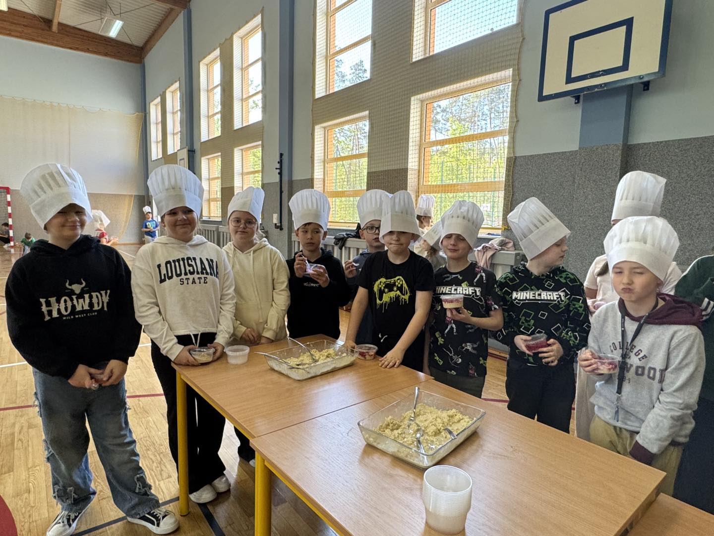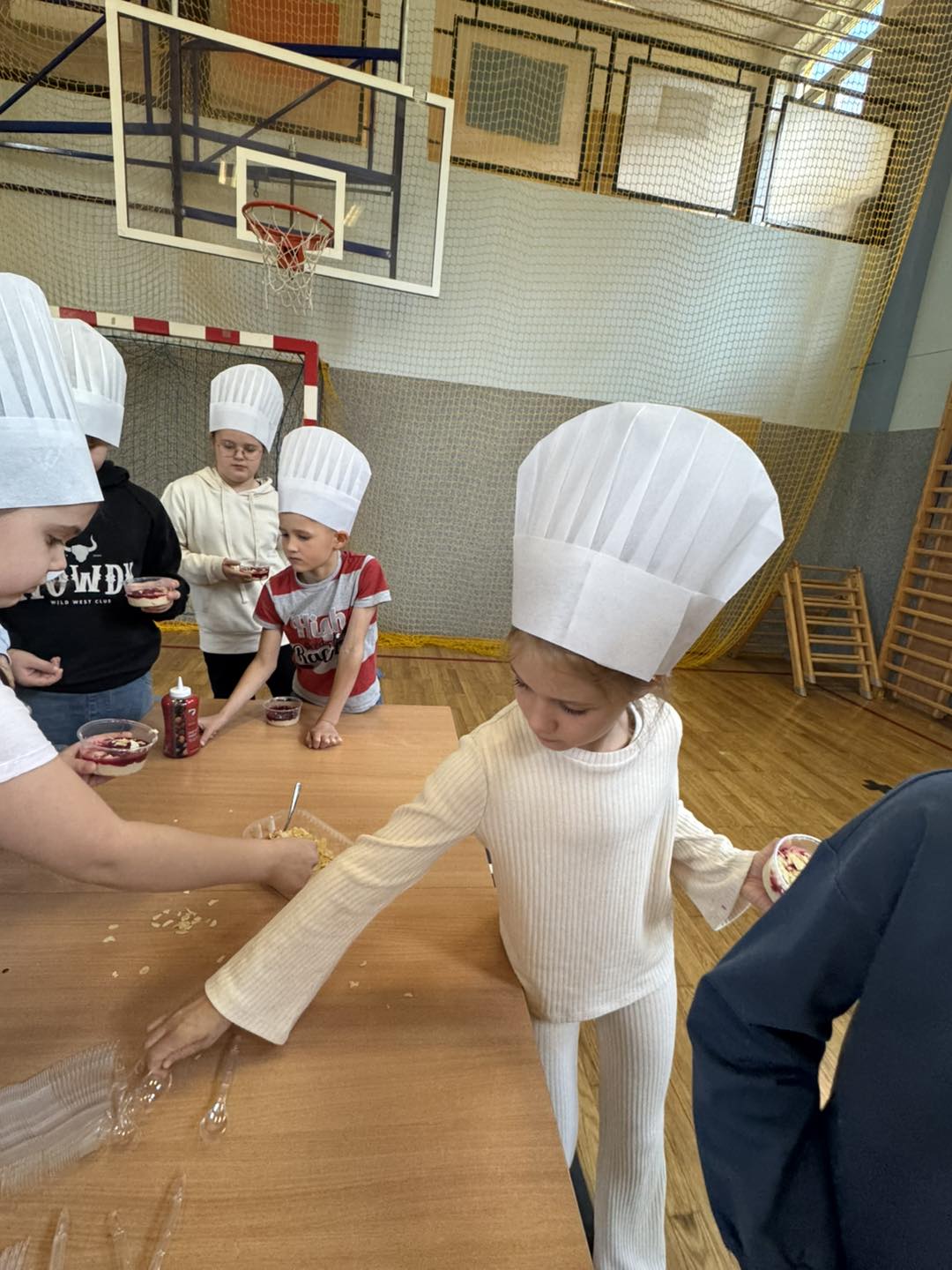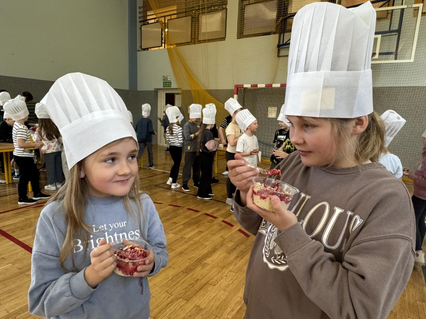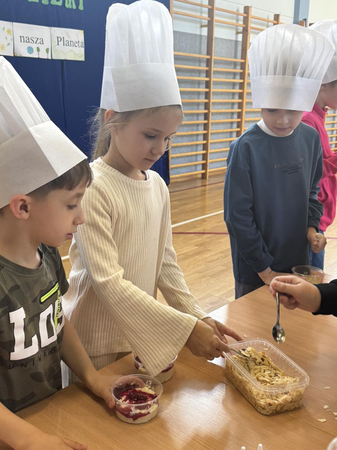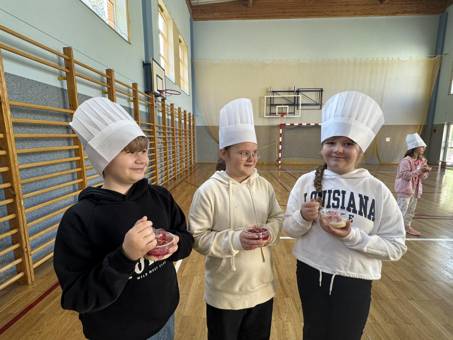 24 kwietnia klasy 1 - 3 wspólnie celebrowały najważniejszy posiłek dnia. Doskonale wiemy, że śniadanie dostarcza nam energii potrzebnej do prawidłowego funkcjonowania organizmu. Dzięki uprzejmości Pana Pawła Oszczyka uczniowie mogli samodzielnie komponować zdrowe śniadanie, składające się z pudingu ryżowego gotowanego na mleku owsianym z dodatkiem sosu wiśniowego, malinowego lub o smaku owoców leśnych. Bardzo dziękujemy Panu Pawłowi za pyszną kulinarną niespodziankę!