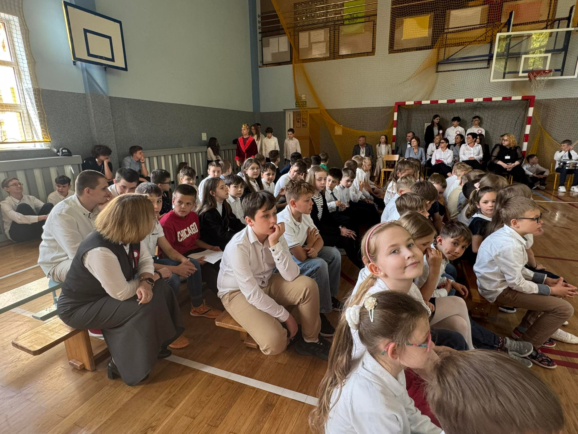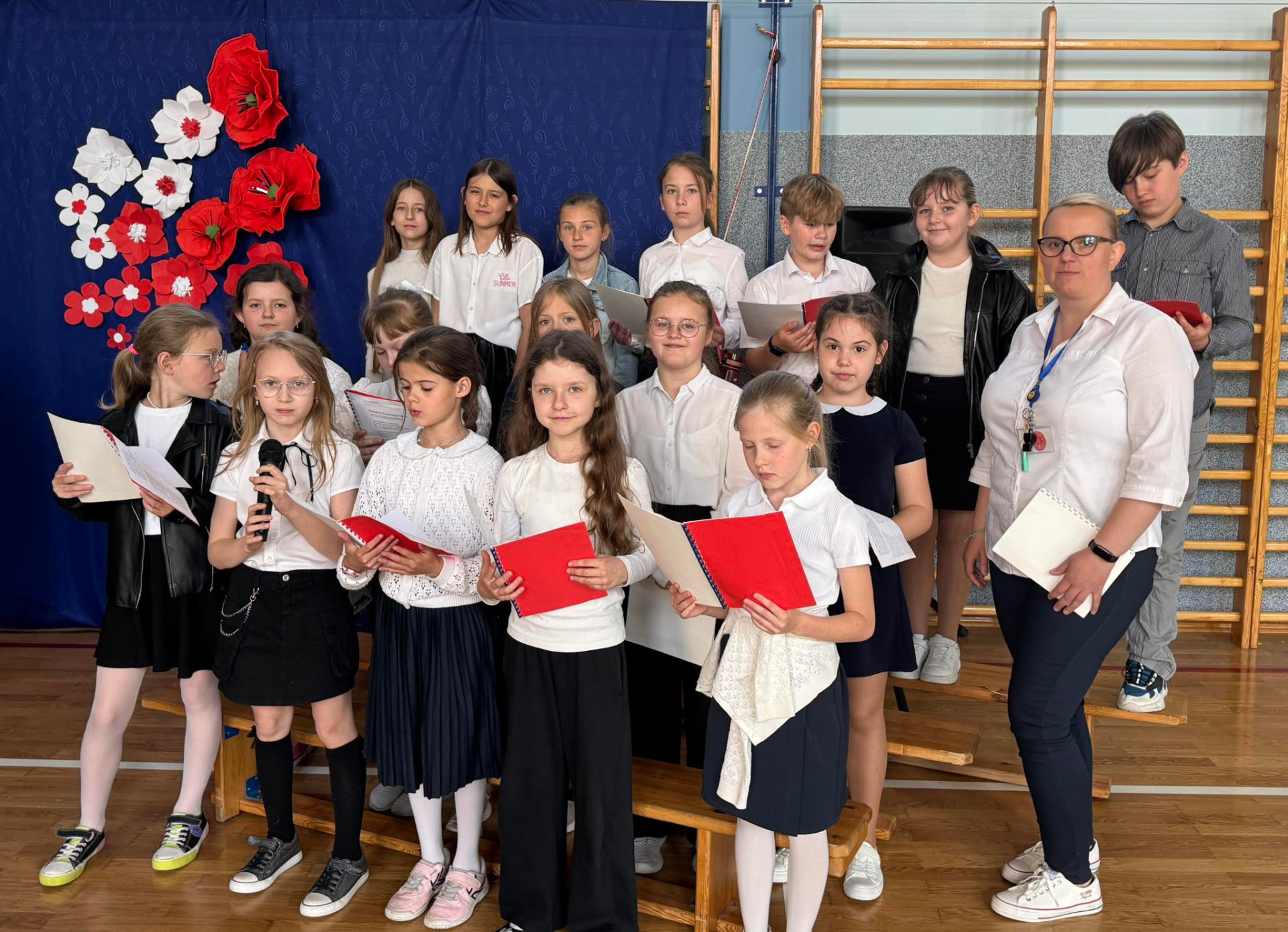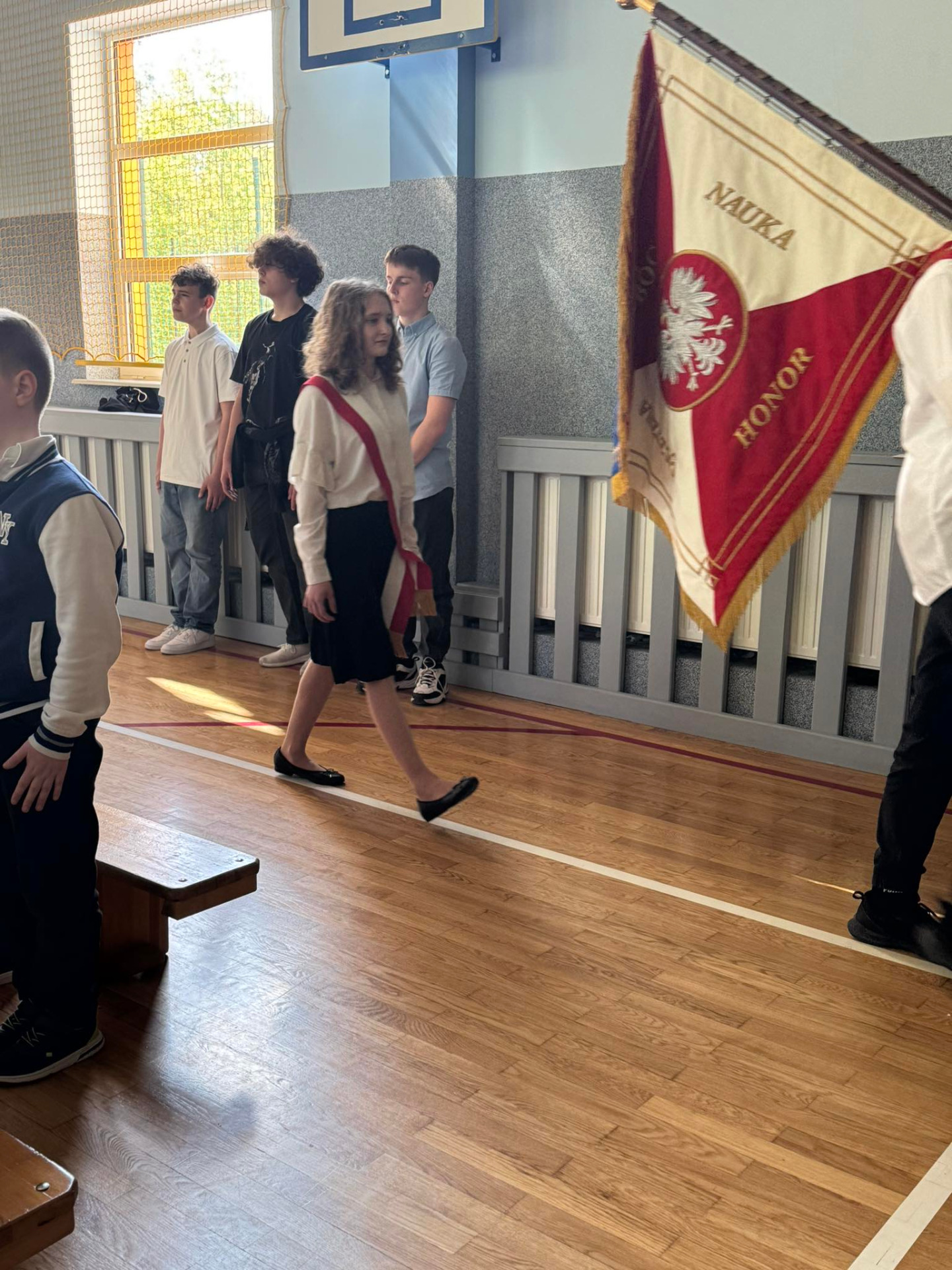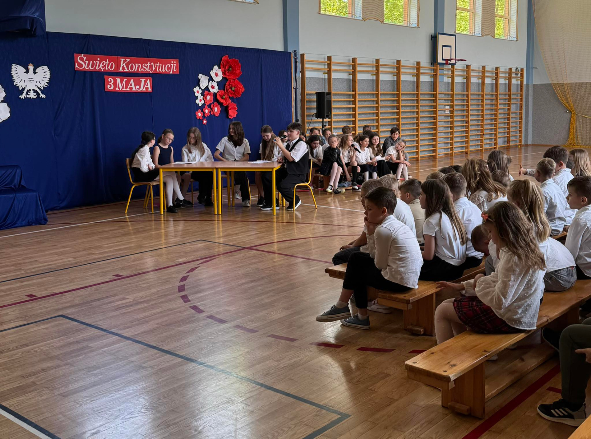 W środę (30.04.2025 r.) w naszej szkole odbył się apel związany z 234. rocznicą uchwalenia Konstytucji 3 Maja. Pan Dyrektor uroczyście wprowadził sztandar naszej placówki. Następnie wspólnie zaśpiewaliśmy hymn Polski i naszej szkoły/ Uczniowie klasy VII przekazali wiele ciekawych informacji dotyczących majowych świąt. Klasa V i VI przedstawiły specjalnie przygotowany program artystyczny. Chór szkolny zaprezentował kilka patriotycznych utworów. Zwieńczeniem uroczystości był przepiękny taniec z biało-czerwonymi flagami w wykonaniu uczniów klasy V i VI.