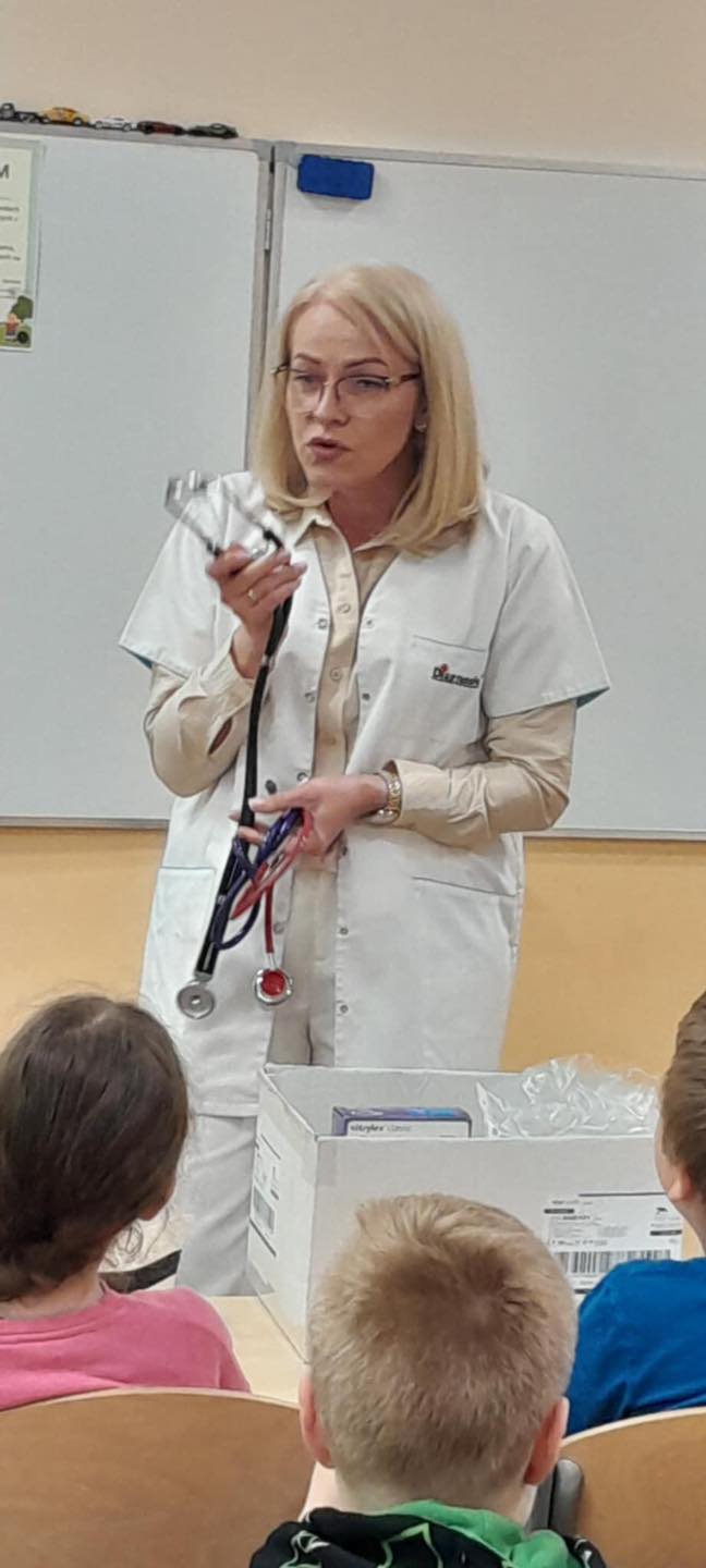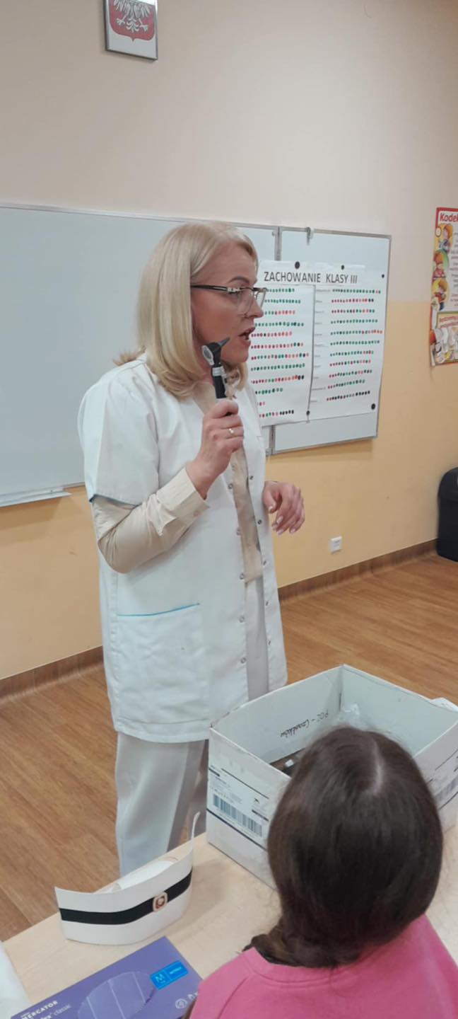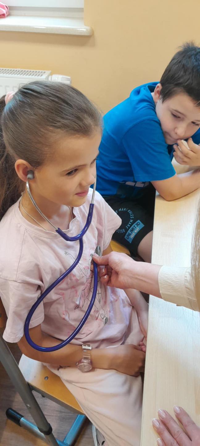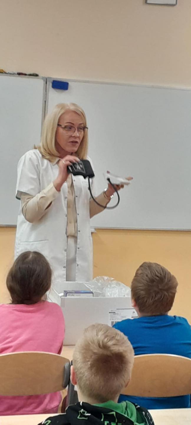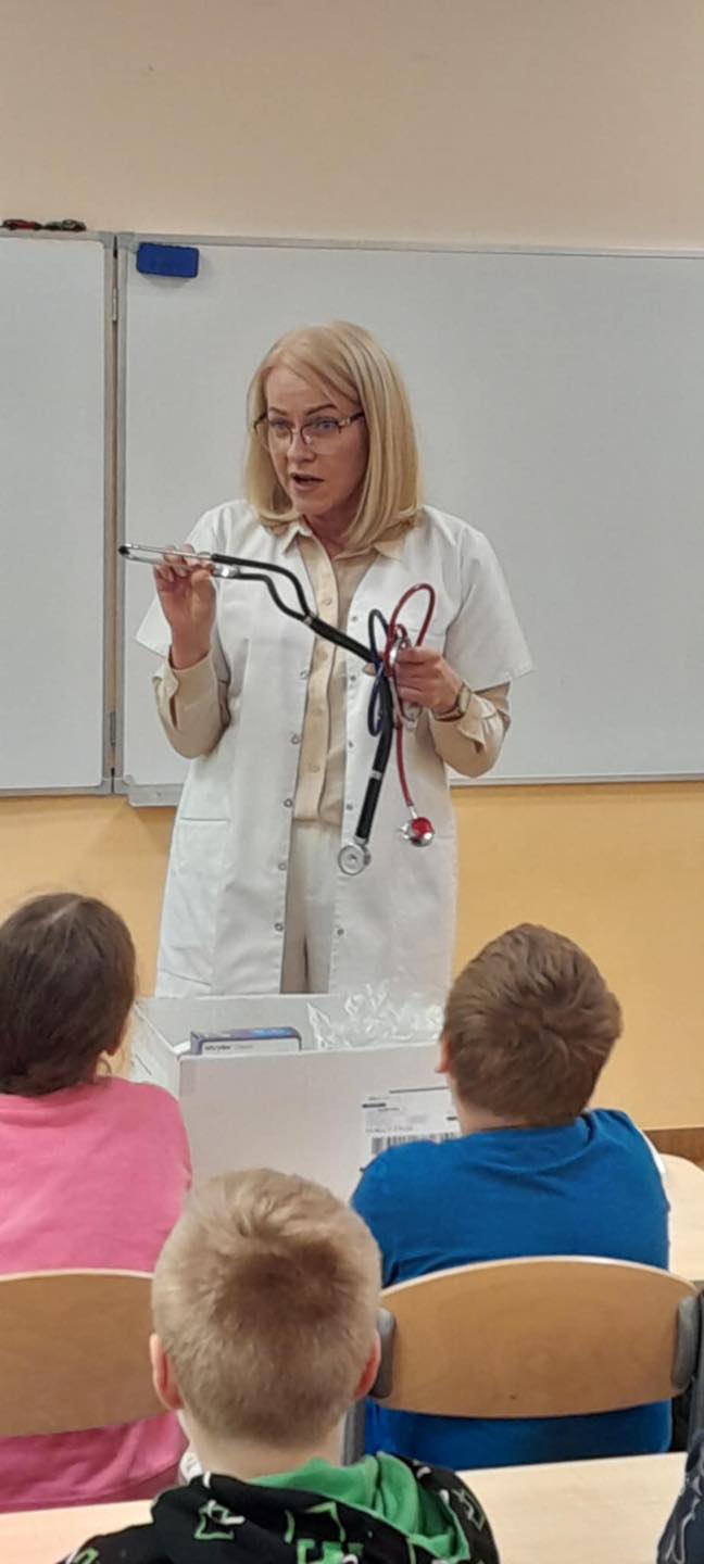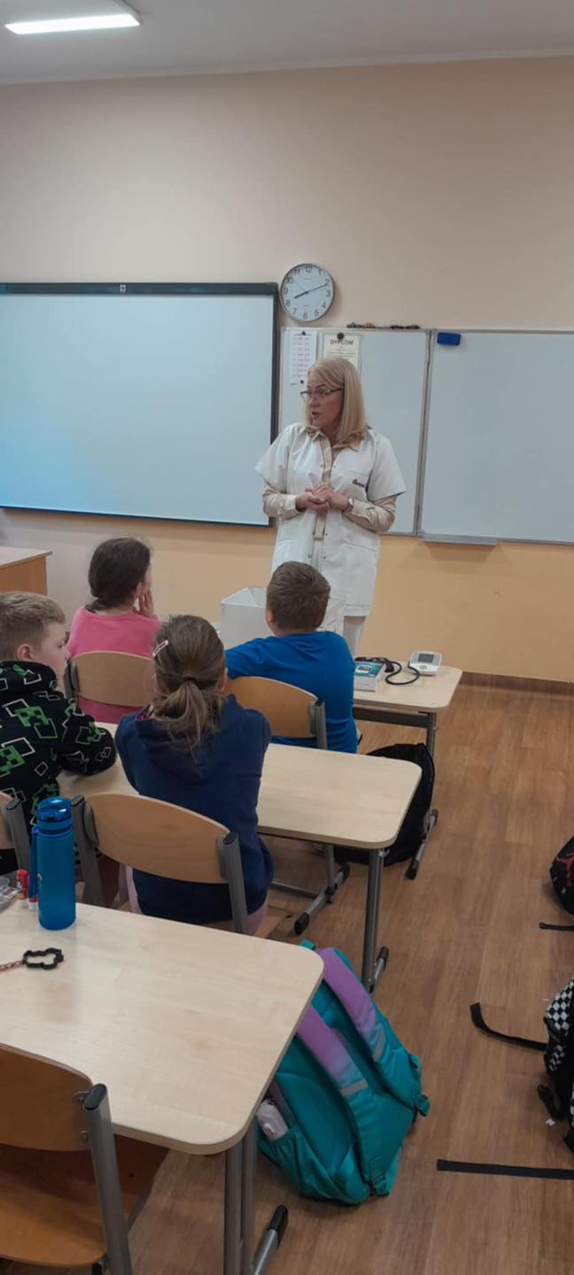 4 czerwca uczniów klasy 3 odwiedziła pielęgniarka szkolna Pani Anna Orzeszyna ubrana w biały fartuch ciekawie opowiadała o swojej pracy, codziennych obowiązkach oraz o tym, czym zajmuje się pielęgniarka w przychodni i szpitalu. Uczniowie mieli okazję zobaczyć różnego rodzaju przyrządy medyczne potrzebne do pracy w tym zawodzie. Dzieci zadawały pytania i z zainteresowaniem słuchały odpowiedzi. Pani Ania omówiła także następujące zagadnienie: Hałas a zdrowie człowieka i wyjaśniła, jak należy dbać o uszy, aby dobrze słyszeć, a następnie zorganizowała debatę wśród uczniów na temat: Jak zmniejszyć hałas na przerwach – nasze pomysły. Uczniowie podawali następujące przykłady, m.in. Strefa ciszy, Biblioteka szkolna przyjacielem ciszy, Szkolny przyjaciel ciszy to ja. Spotkanie było ciekawe i bardzo pouczające oraz stało się doskonałą okazją, by docenić zawód pielęgniarki i przypomnieć sobie, jak ważne jest dbanie o zdrowie.