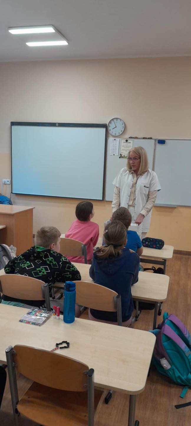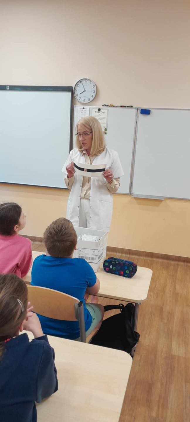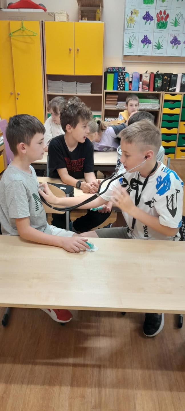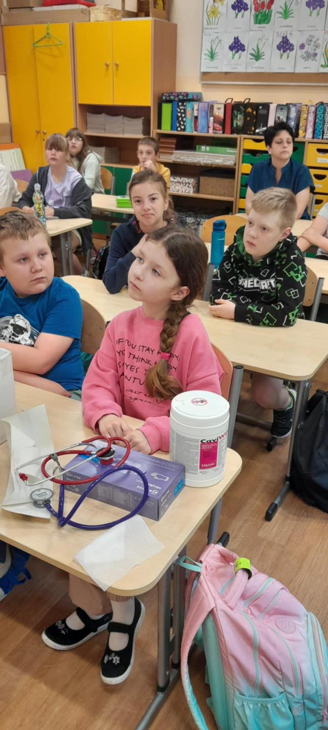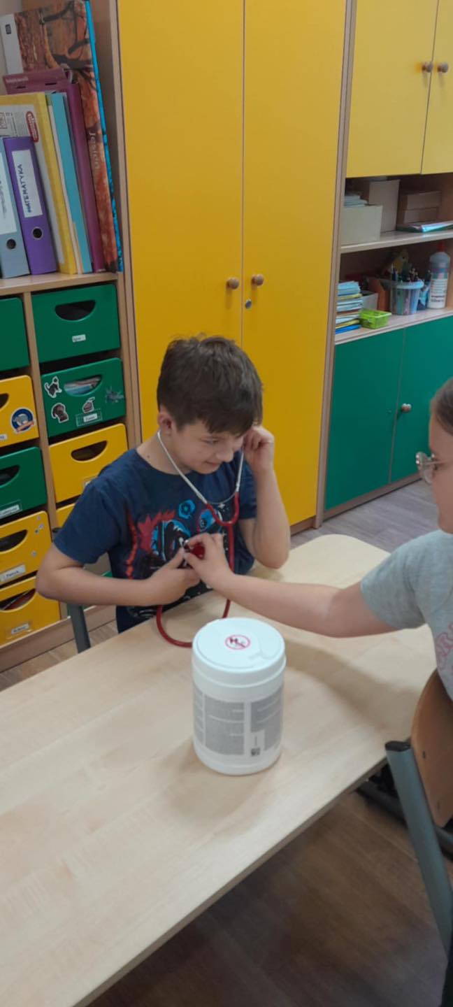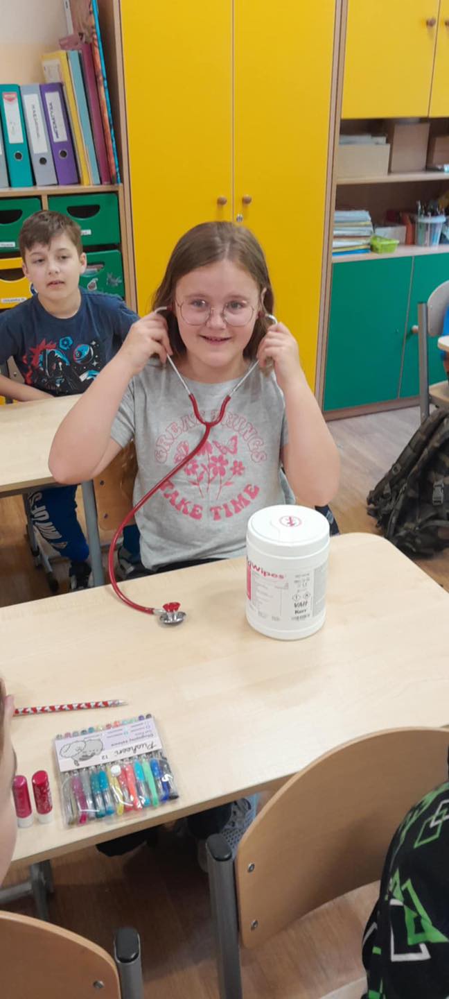 4 czerwca uczniów klasy 3 odwiedziła pielęgniarka szkolna Pani Anna Orzeszyna ubrana w biały fartuch ciekawie opowiadała o swojej pracy, codziennych obowiązkach oraz o tym, czym zajmuje się pielęgniarka w przychodni i szpitalu. Uczniowie mieli okazję zobaczyć różnego rodzaju przyrządy medyczne potrzebne do pracy w tym zawodzie. Dzieci zadawały pytania i z zainteresowaniem słuchały odpowiedzi. Pani Ania omówiła także następujące zagadnienie: Hałas a zdrowie człowieka i wyjaśniła, jak należy dbać o uszy, aby dobrze słyszeć, a następnie zorganizowała debatę wśród uczniów na temat: Jak zmniejszyć hałas na przerwach – nasze pomysły. Uczniowie podawali następujące przykłady, m.in. Strefa ciszy, Biblioteka szkolna przyjacielem ciszy, Szkolny przyjaciel ciszy to ja. Spotkanie było ciekawe i bardzo pouczające oraz stało się doskonałą okazją, by docenić zawód pielęgniarki i przypomnieć sobie, jak ważne jest dbanie o zdrowie.