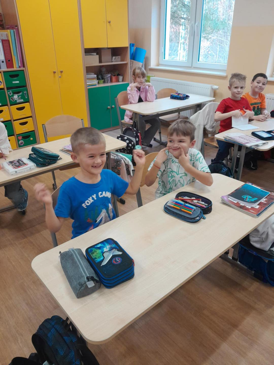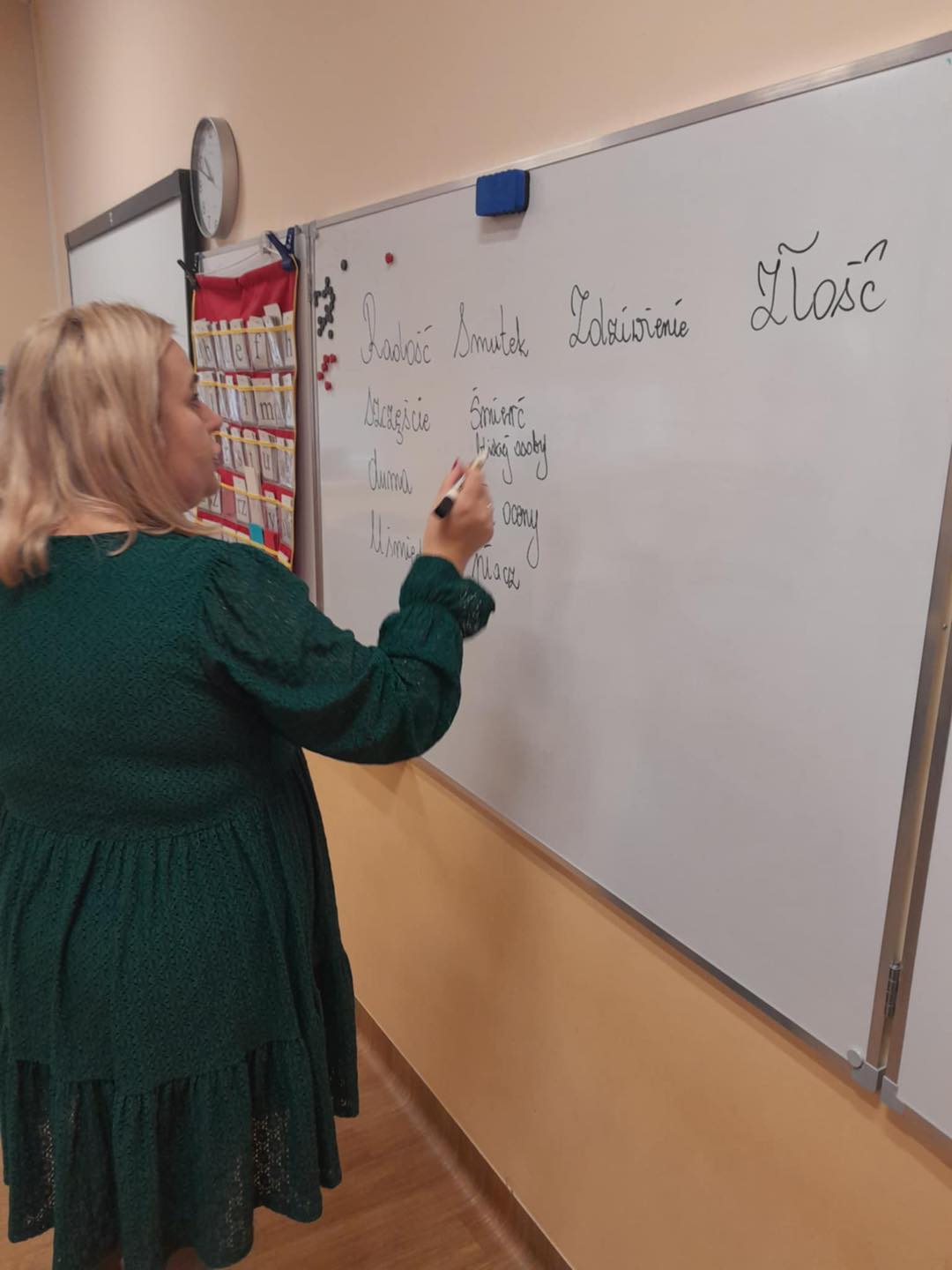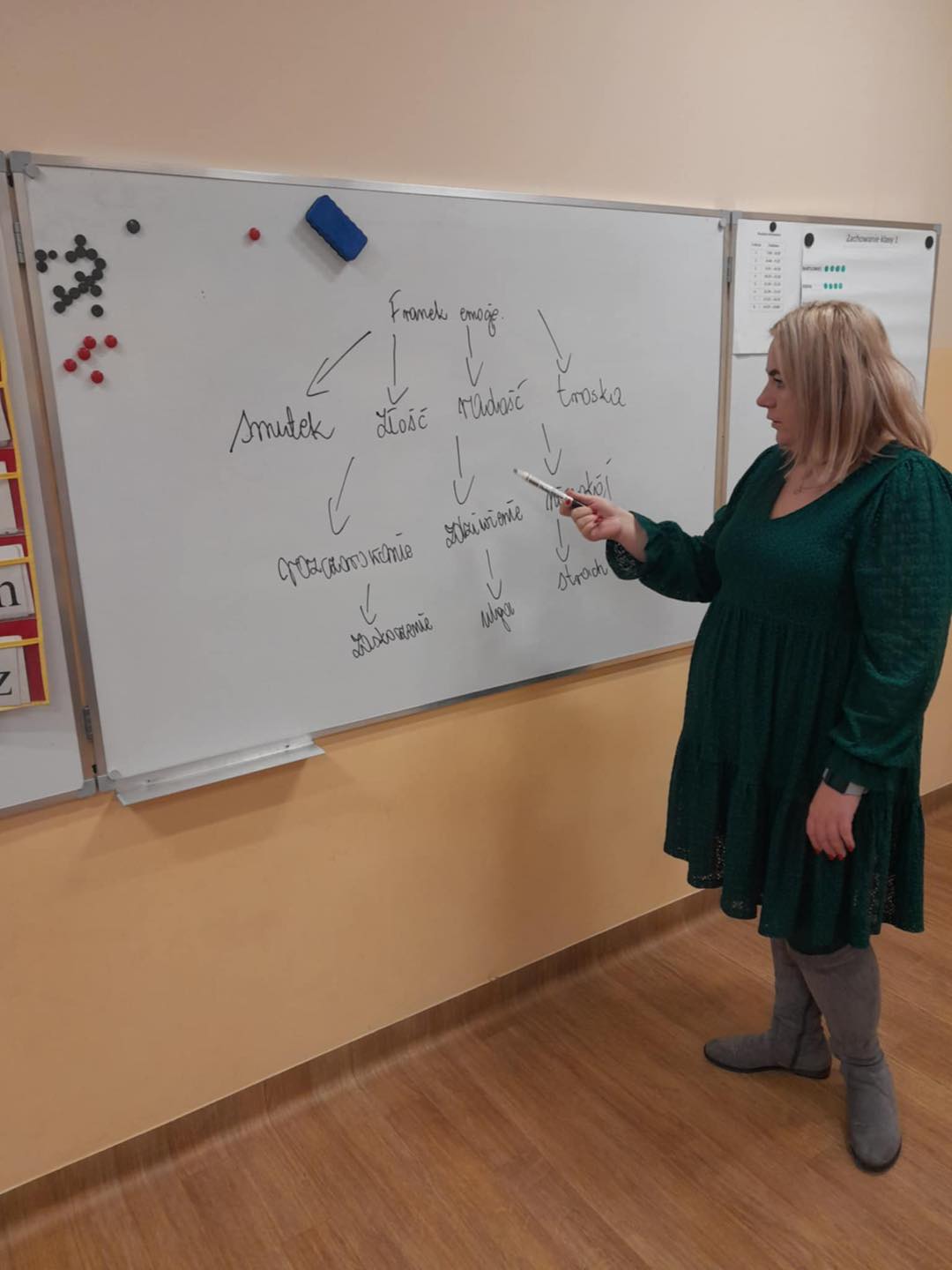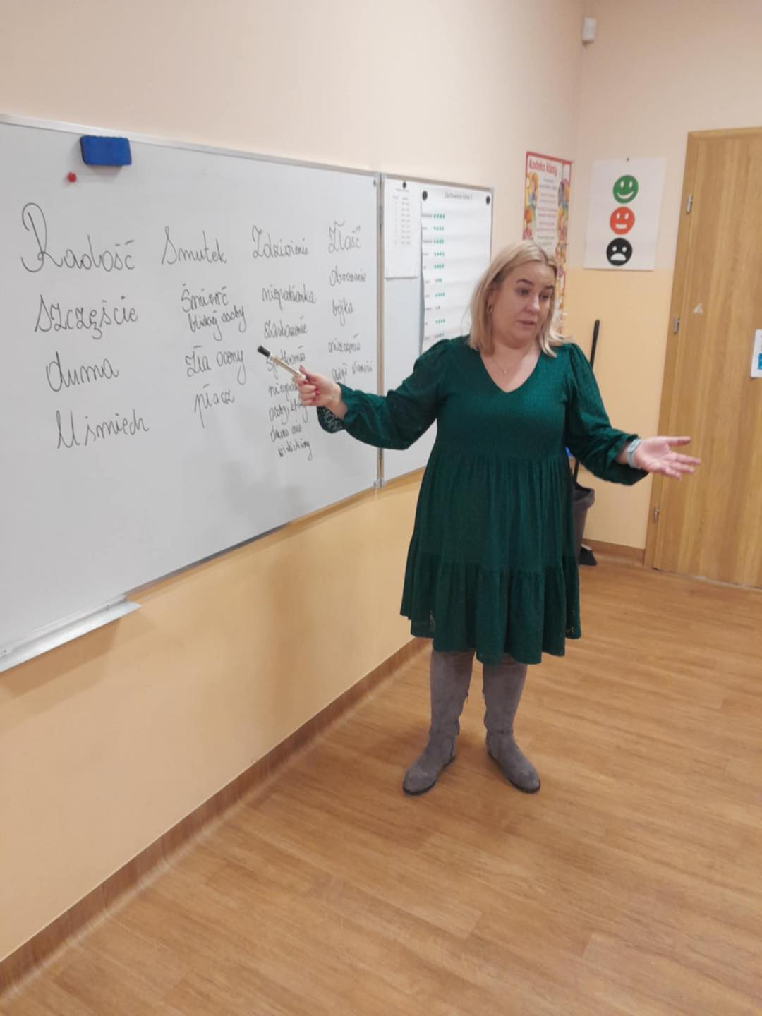 Podczas zajęć z panią pedagog, Wioletą Karabin uczniowie klasy 1 rozmawiali o emocjach – wspólnie wskazywali, jakie znają emocje i z czym im się one kojarzą. Dzieci podawały przykłady sytuacji, w których pojawiają się emocje pozytywne oraz negatywne.