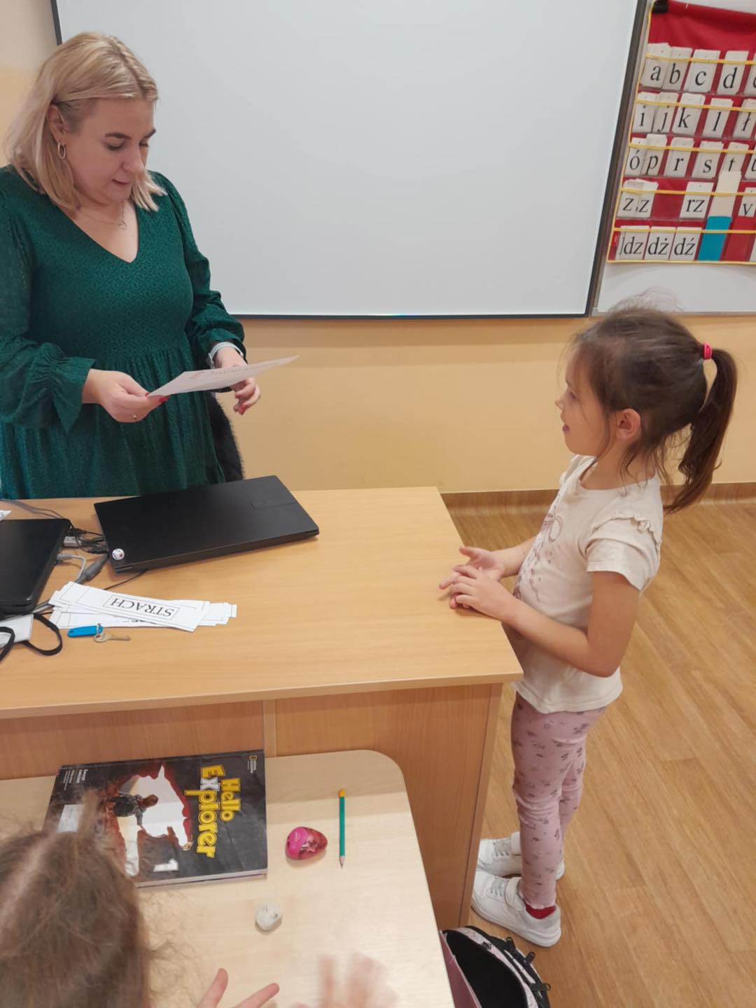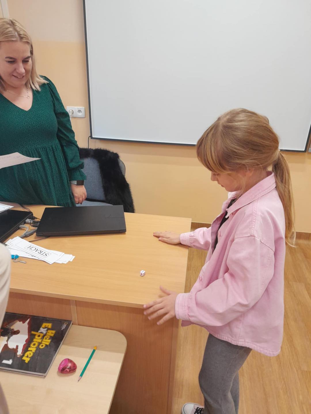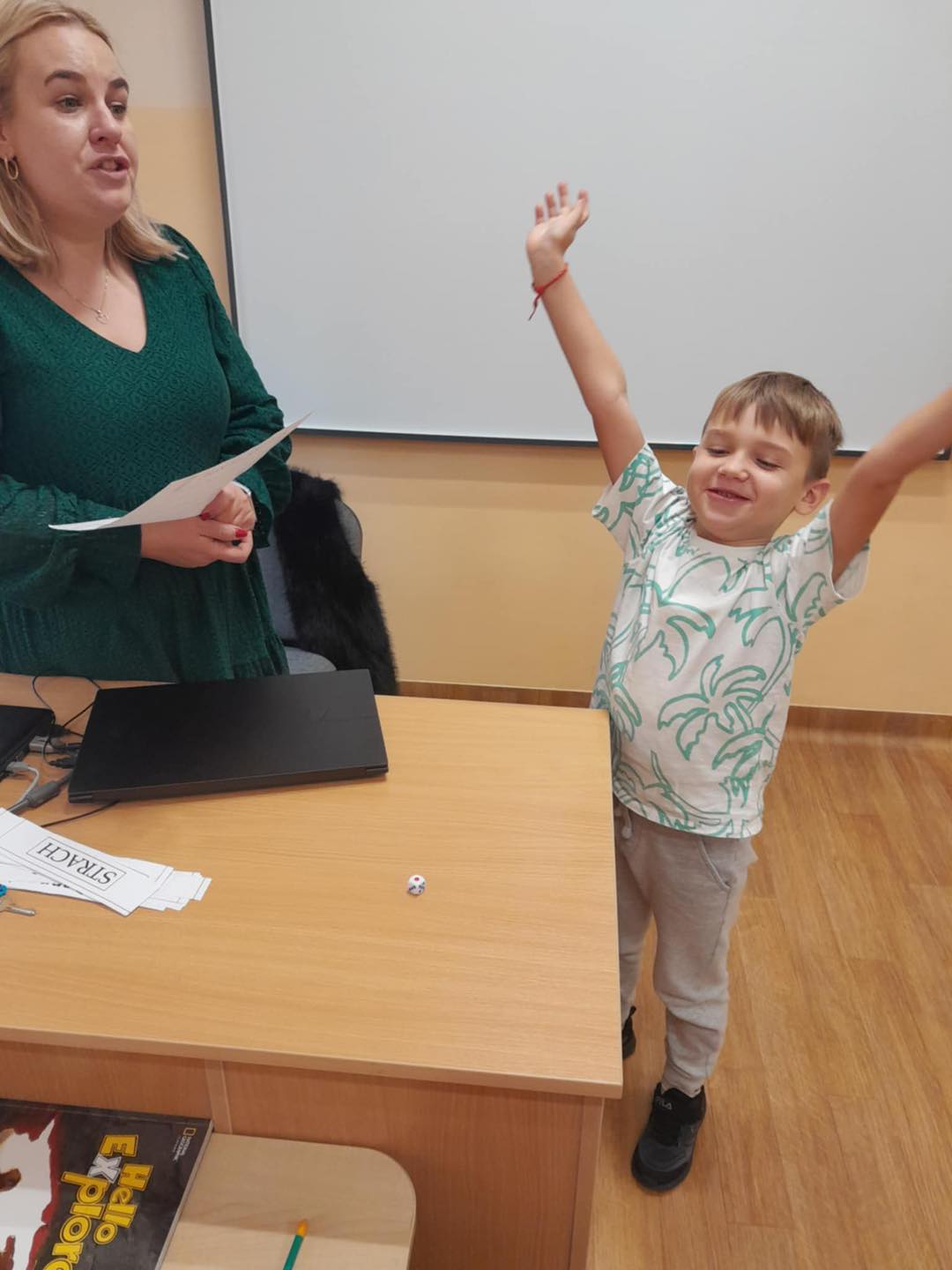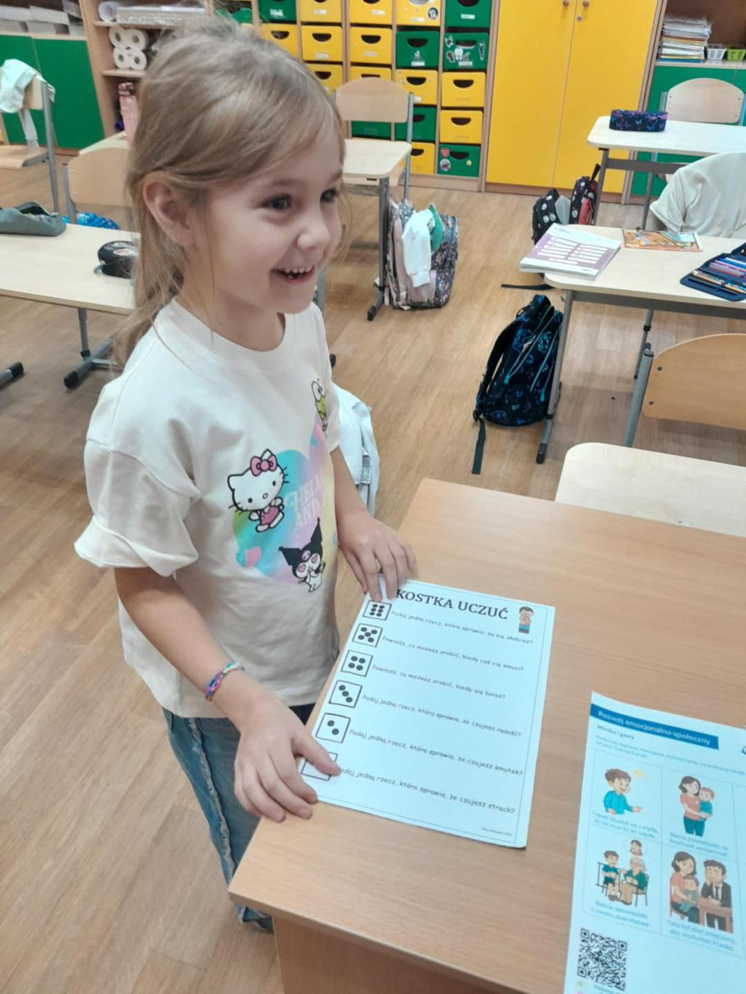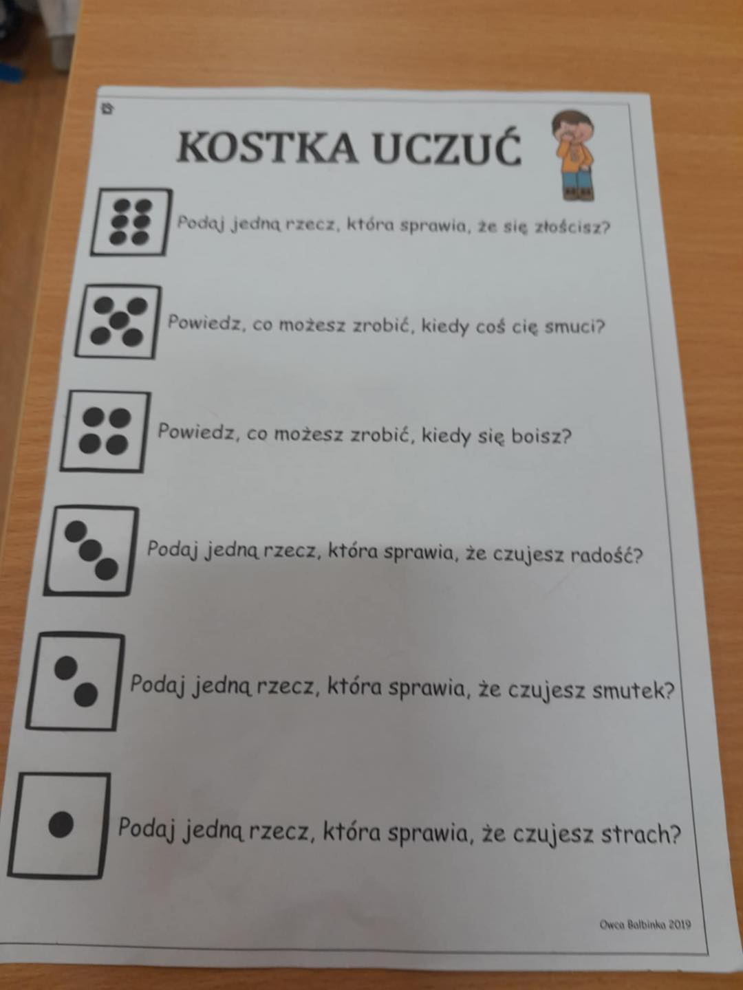 Na zakończenie zajęć uczniowie wzięli udział w zabawie z kostką. W zależności od liczby wyrzuconych oczek, opisywali wylosowaną sytuację związaną z emocjami – rozwijając umiejętność wyrażania uczuć i myśli