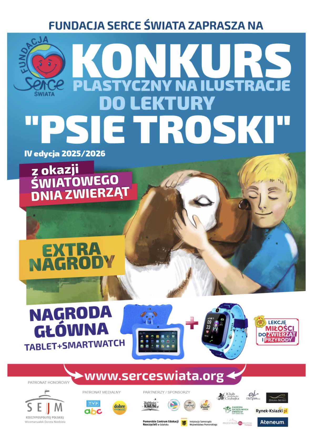 Zapraszamy uczniów klas 0- 3 do udziału w IV edycji międzynarodowego konkursu plastycznego pt. „Psie troski” organizowanego z okazji Światowego Dnia Zwierząt przez Fundację „Serce świata" .